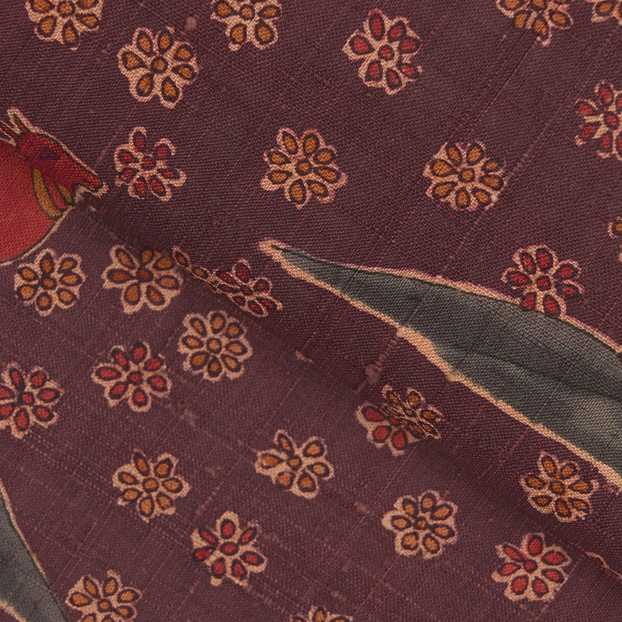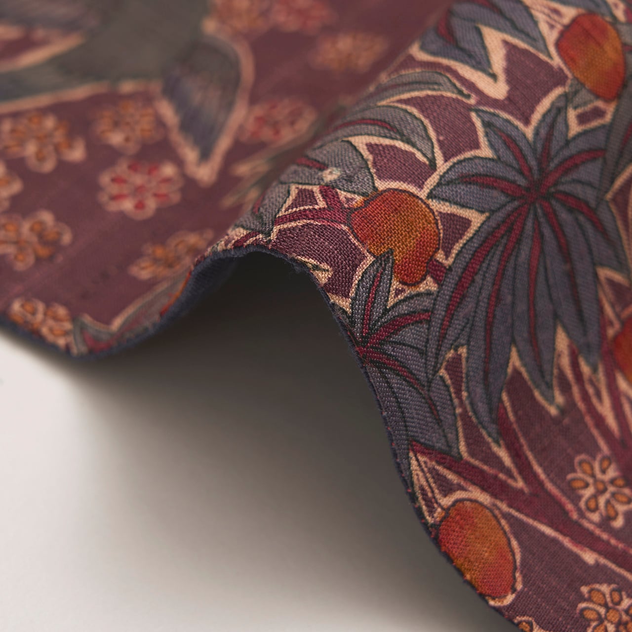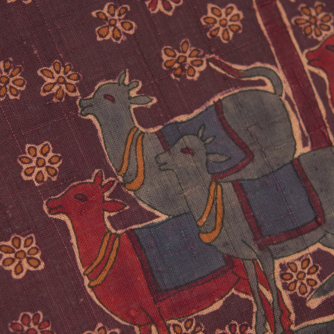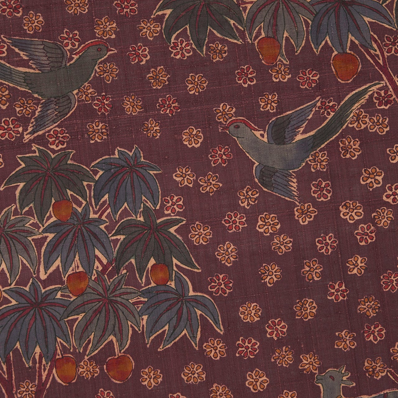 のどかで安らかさの感じられる模様ですが、古いインドの更紗を彷彿させるようなシックな色使いで、古いインド茜のような葡萄茶色もとてもお洒落な雰囲気となっています。
