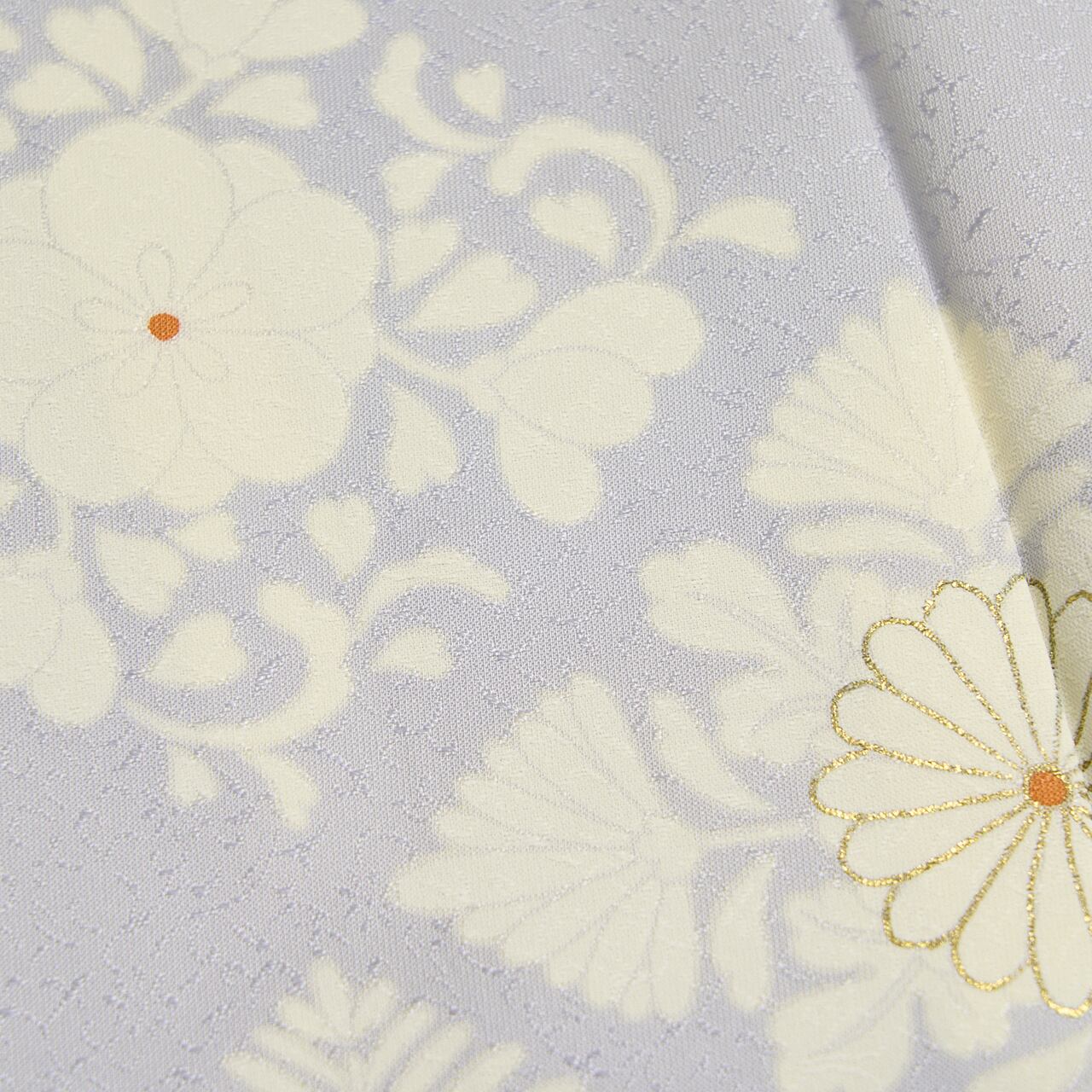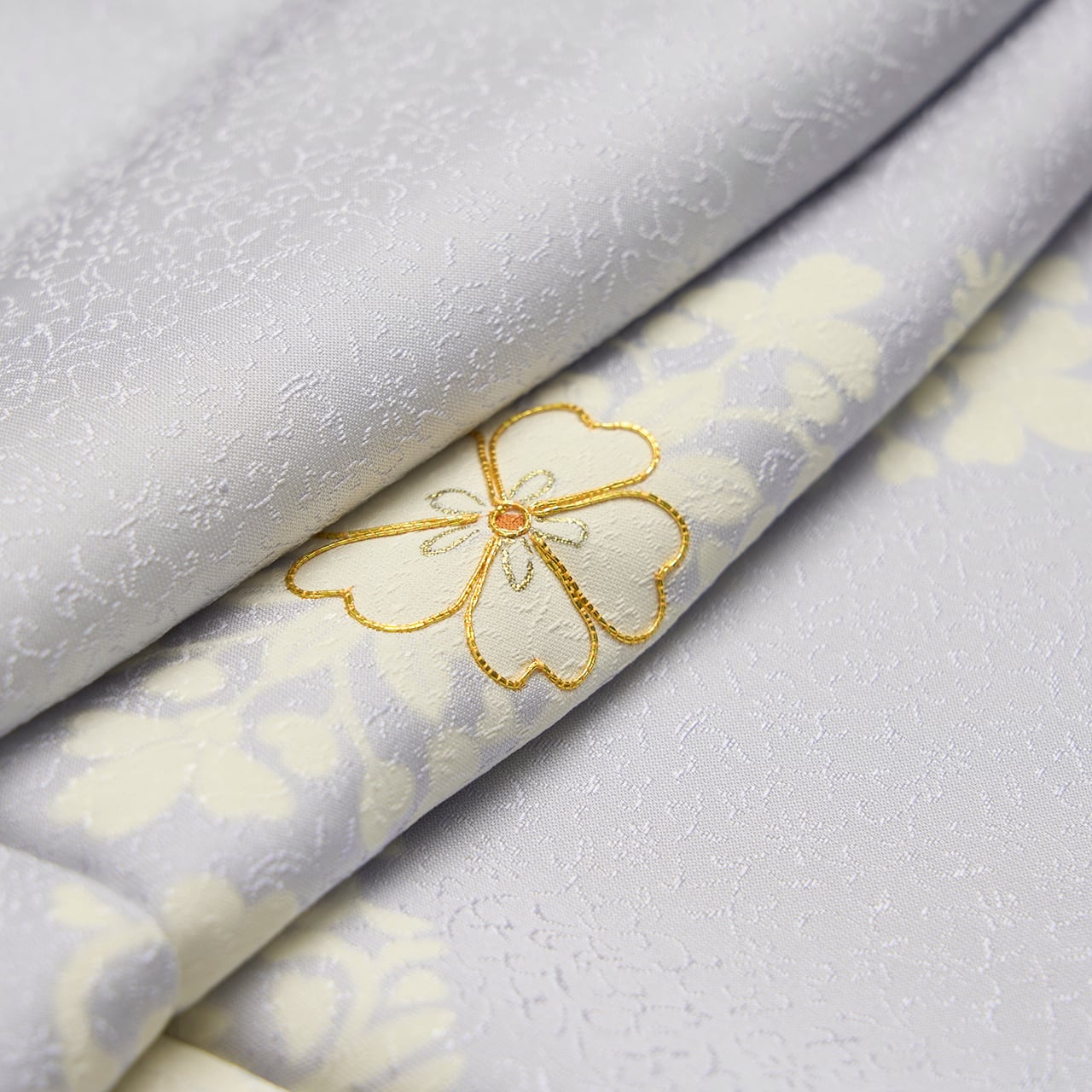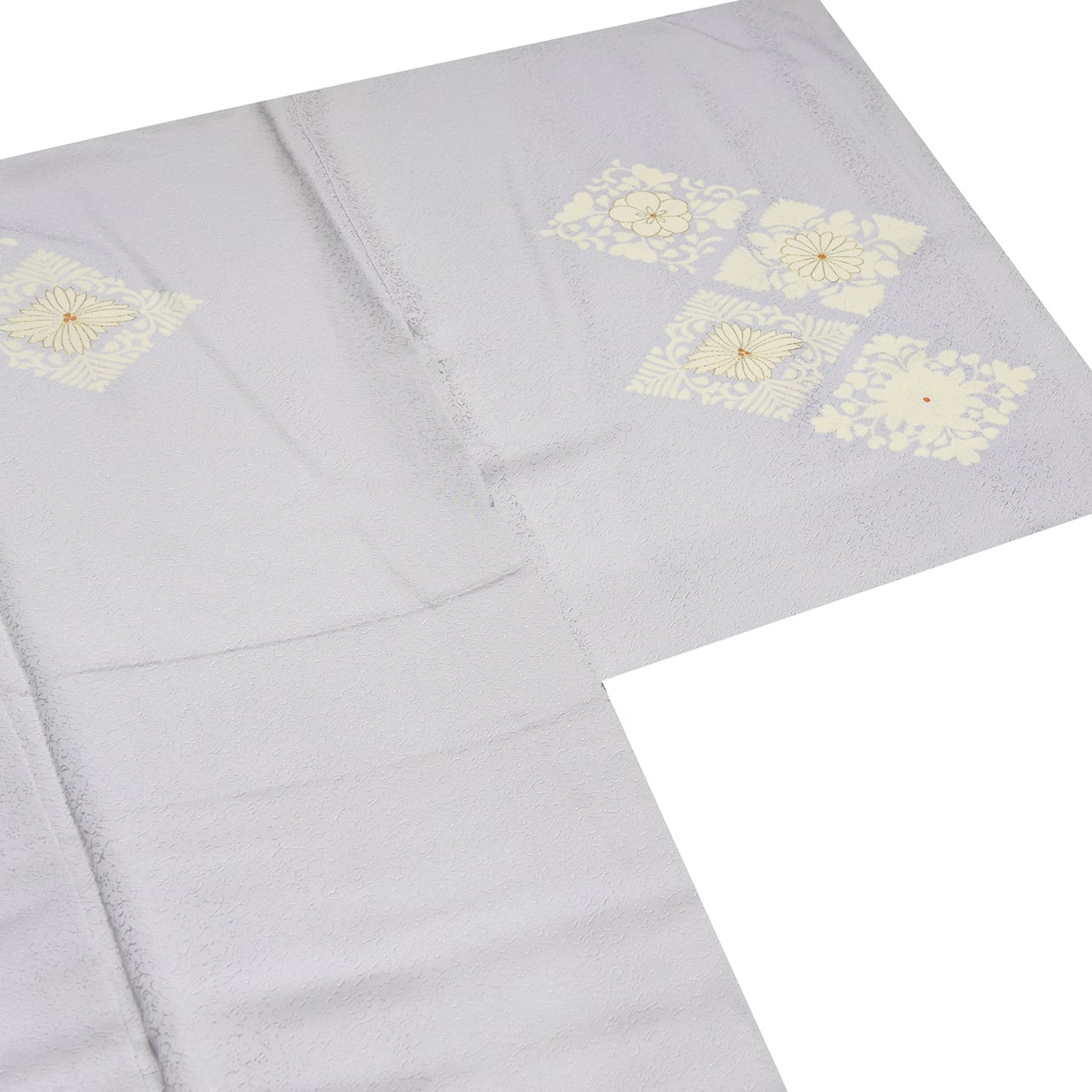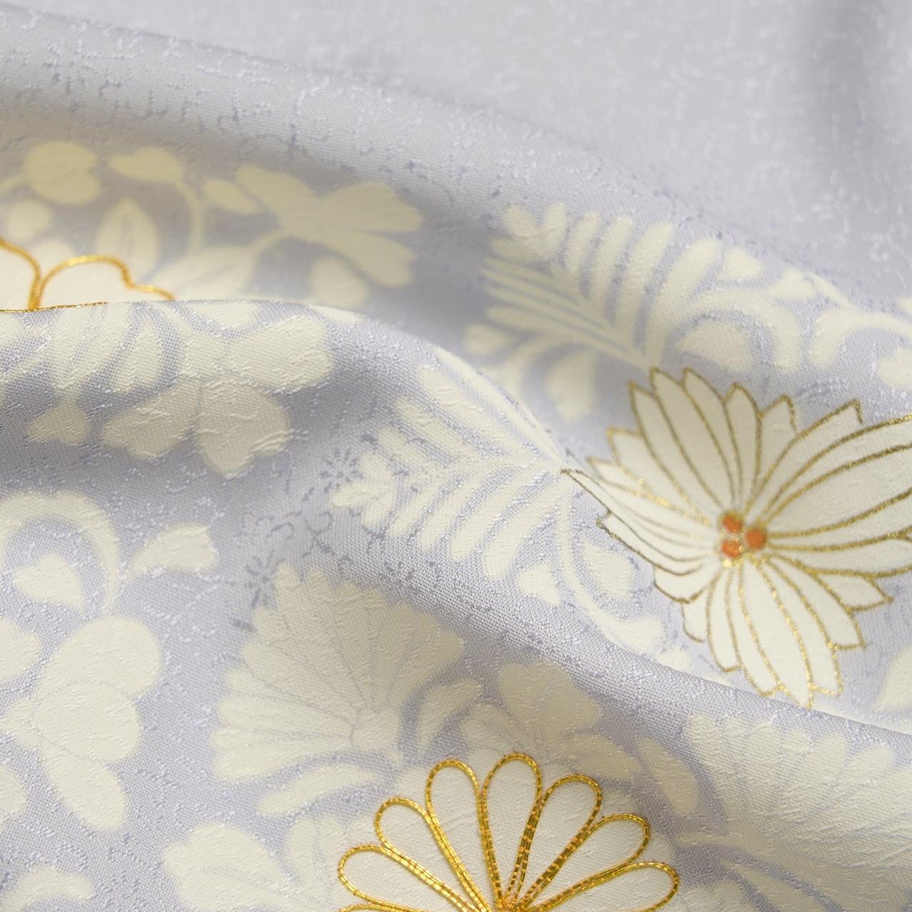 とても小さな花唐草の地模様のある紋意匠のしっかりとした生地が、淡く透明感のある水色がかったグレー・暁鼠色に染められ、上前や肩口、袖には手の平くらいの大きさの菱の形が取られ、その菱の模様は菊や梅、桜のお花や松などの形にアレンジされて白く染め抜かれて、さらに胡粉で彩色され、それに金彩で縁取りをされたり、金駒の手刺繍が施されたりした、格調高く素晴らしい訪問着のお着物です。