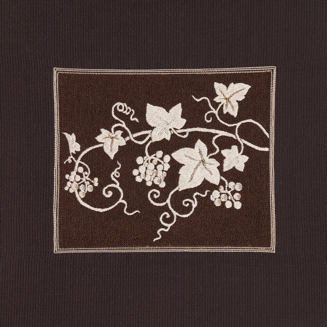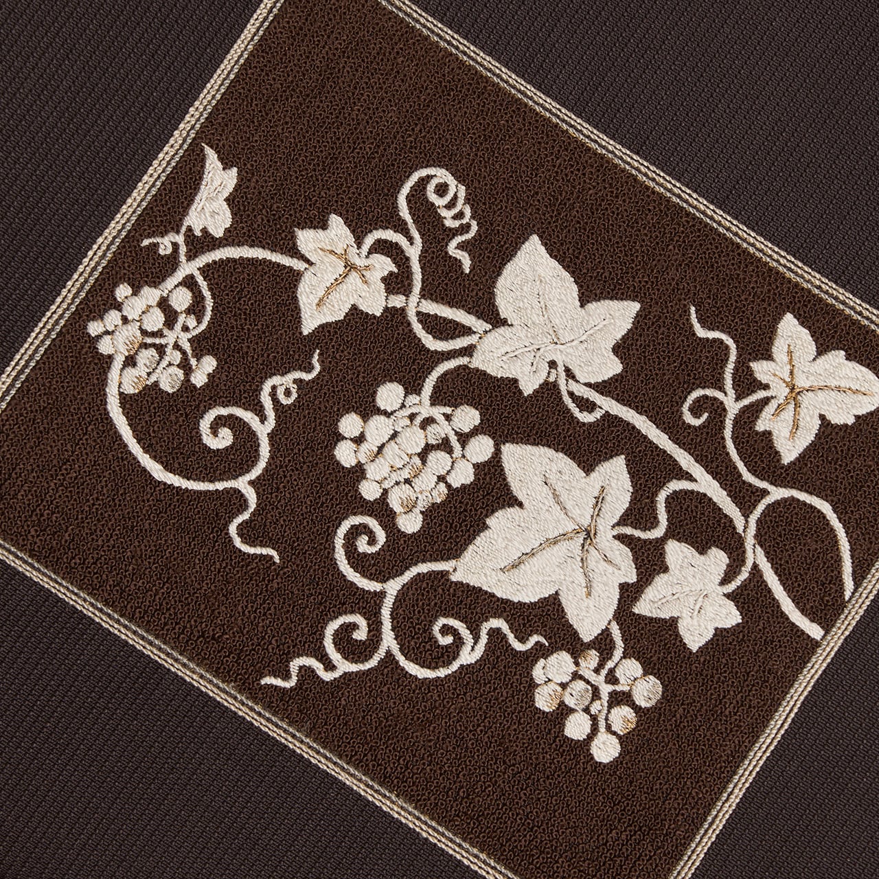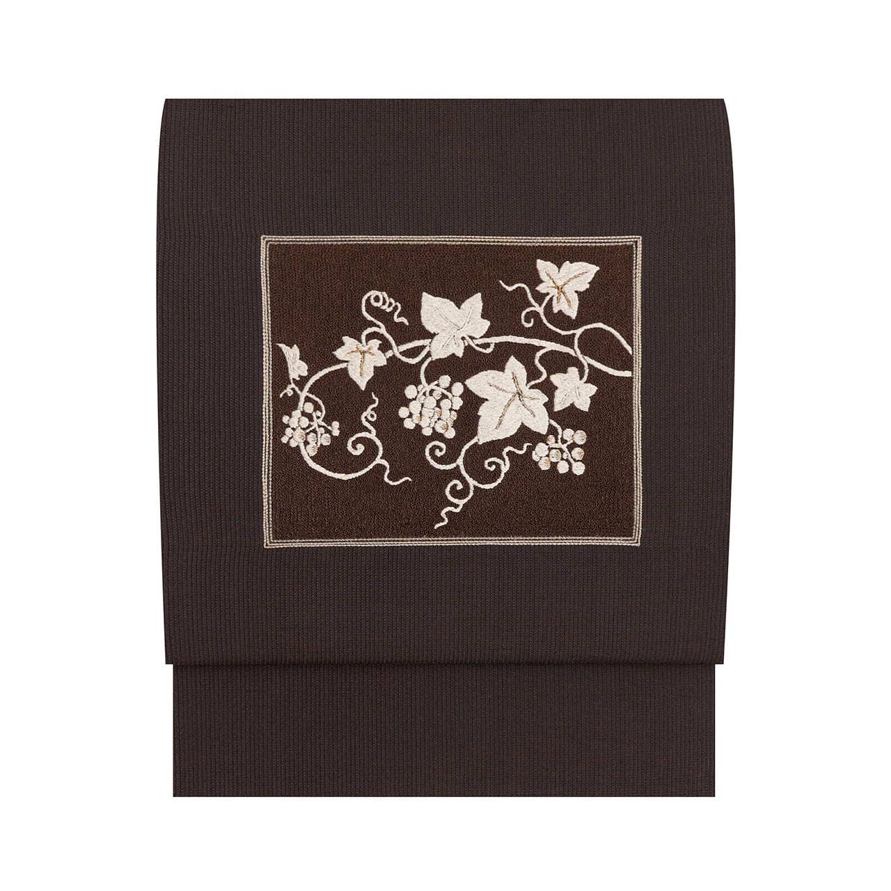 少しだけ赤味のある濃い焦げ茶・赤墨色のムガシルクのしっかりとした生地に、地模様のように細かい縦縞が織り出され、お太鼓に取られた横長の四角の中がフレンチナッツのようなつぶつぶのある刺繍で埋め尽くされ、それを背景にして、生成り色の糸でたわわに実をつけた葡萄の蔓が活き活きと描かれ、部分的に金駒糸や銀駒糸でアクセントが入れられた、豊かな実りの様子が手刺繍で表現された、とてもお洒落な雰囲気の八寸名古屋帯です。