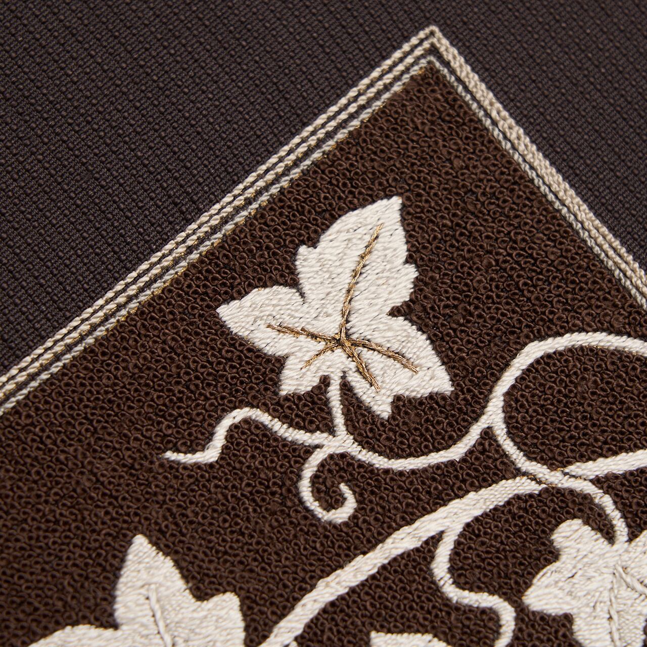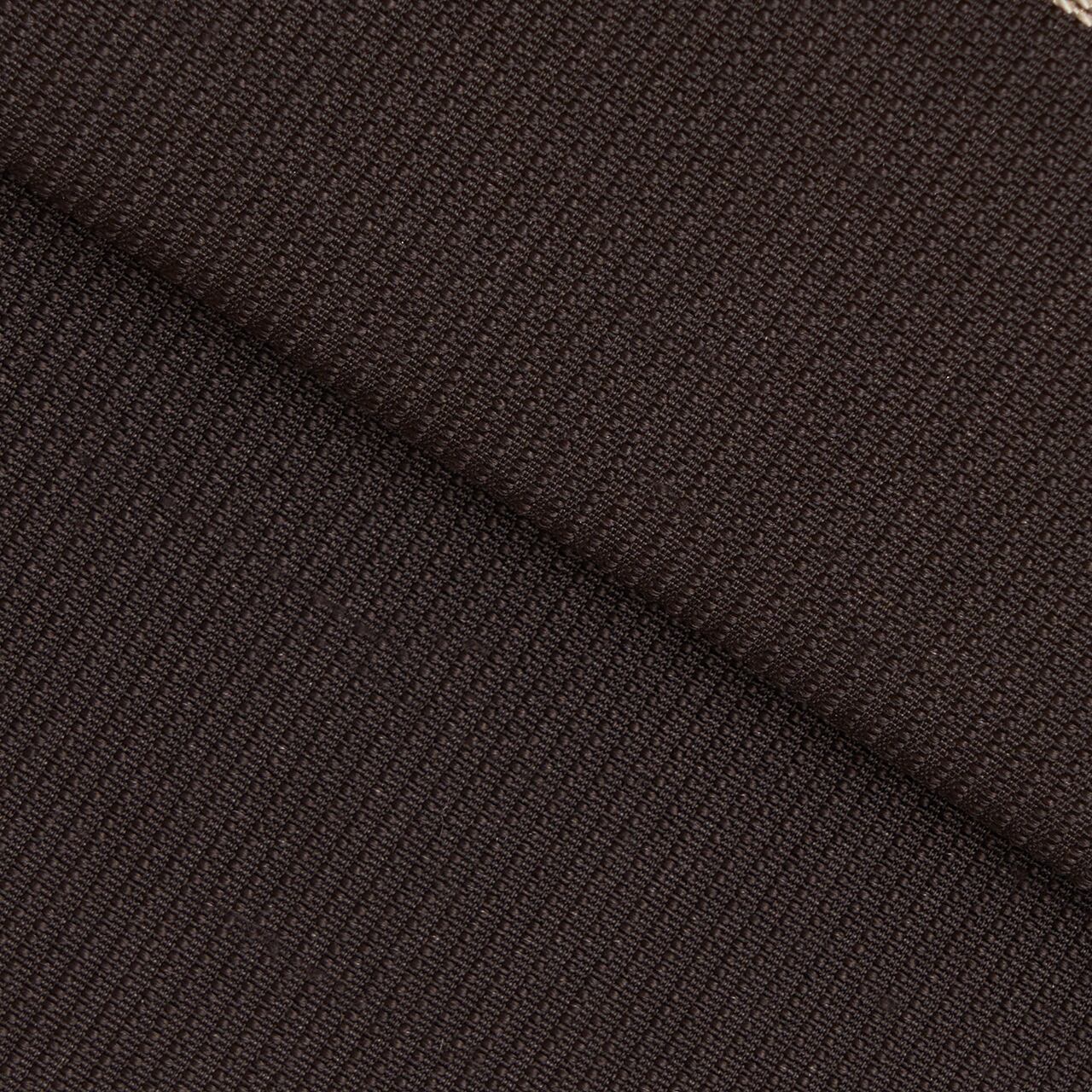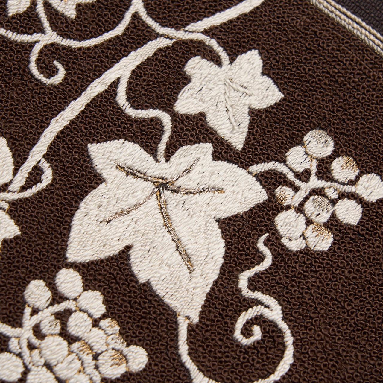 少しだけ赤味のある濃い焦げ茶・赤墨色のムガシルクのしっかりとした生地に、地模様のように細かい縦縞が織り出され、お太鼓に取られた横長の四角の中がフレンチナッツのようなつぶつぶのある刺繍で埋め尽くされ、それを背景にして、生成り色の糸でたわわに実をつけた葡萄の蔓が活き活きと描かれ、部分的に金駒糸や銀駒糸でアクセントが入れられた、豊かな実りの様子が手刺繍で表現された、とてもお洒落な雰囲気の八寸名古屋帯です。