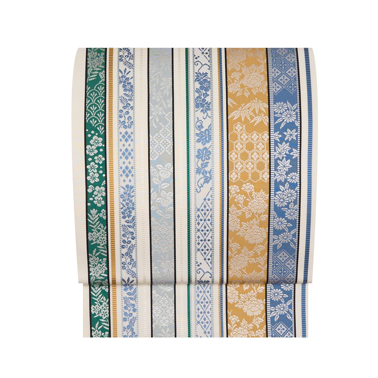 こちらも軽やかで綺麗な色使いと、光沢のある縞の中の草花が程よい華やかさを醸し出していて、カジュアルなアイテムでありながらしっかりとした品質の良い帯となって完成しています。