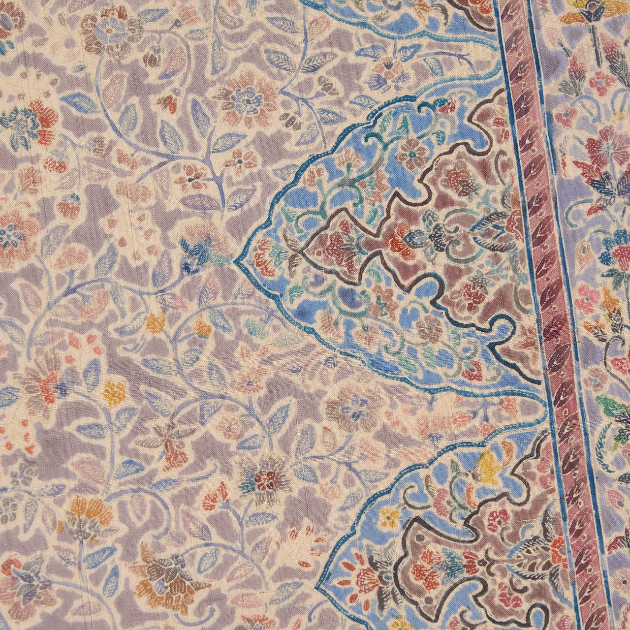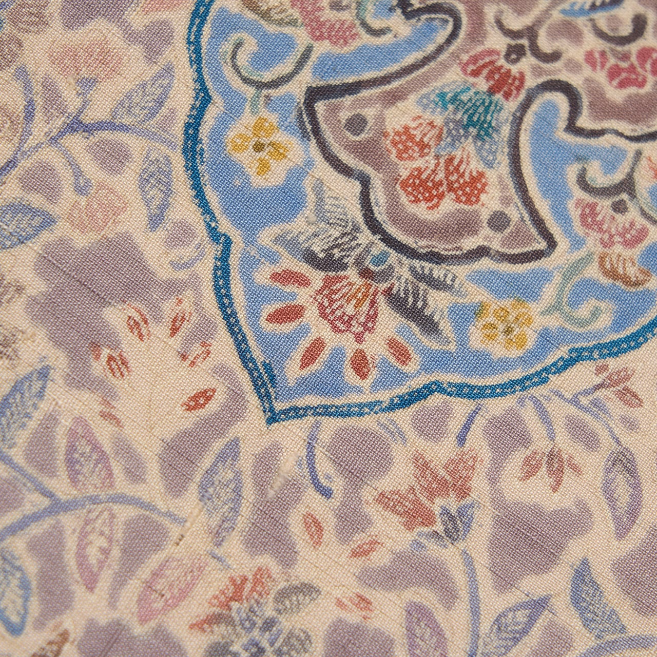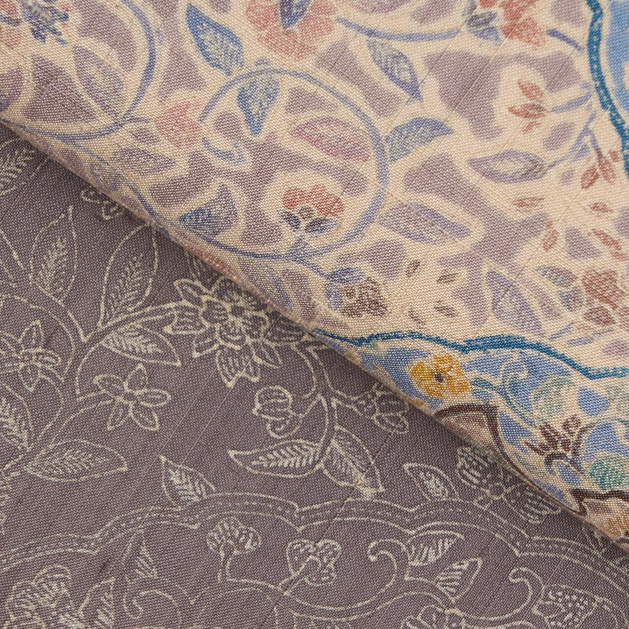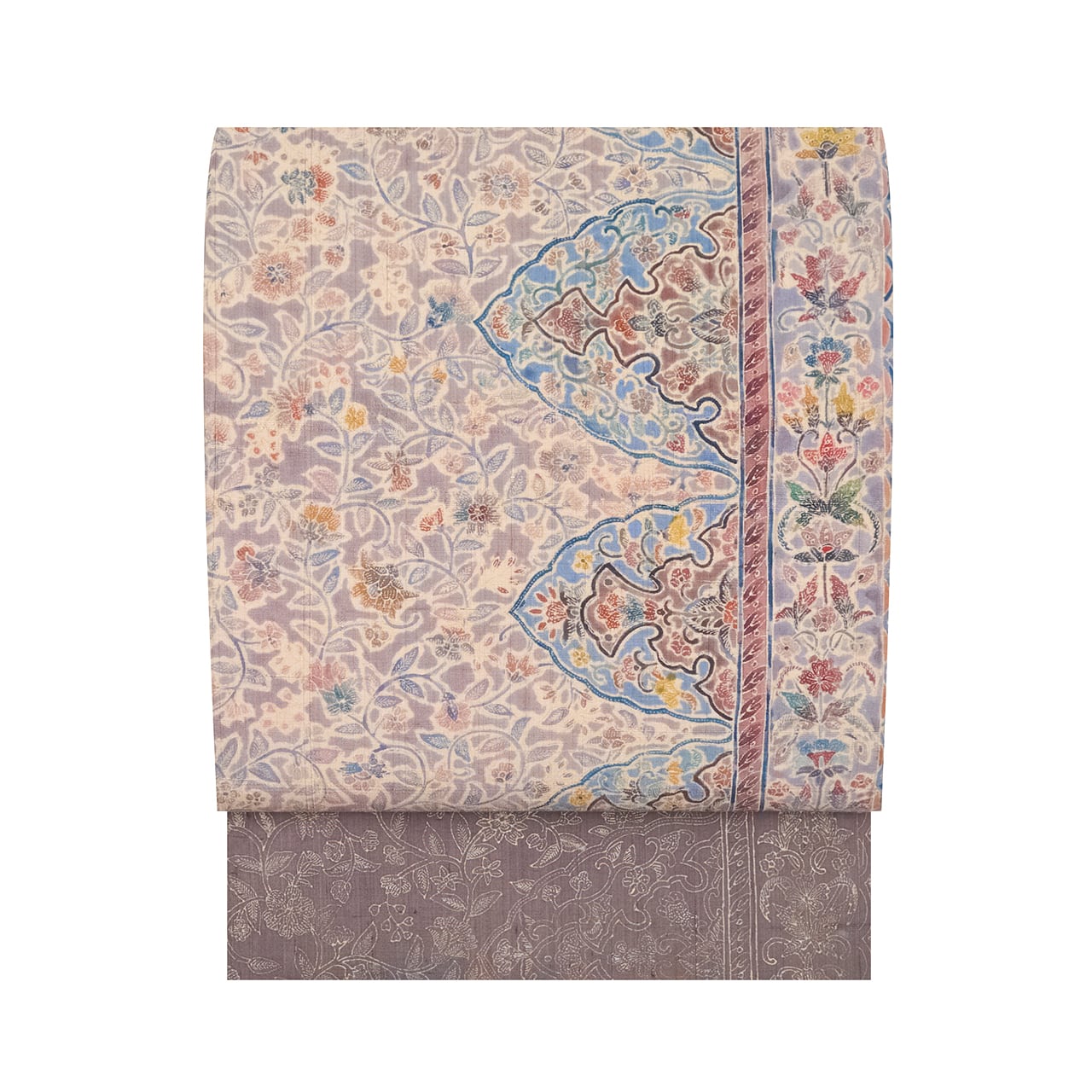 緯糸に節のある座繰りのさらっとした質感の手触りの良い、少しだけ紫味のあるグレー・紫鼠色の地に、お太鼓が淡い黄色味のあるベージュ・薄卵色の暈しで区切られ、鳩羽鼠色の背景にたおやかな花唐草模様が描かれ、右側にはボーダーが取られて、そこにはまた違ったパターンの花唐草模様が、ボーダーからは手の平くらいの大きさの木の葉をアレンジしたような模様が描かれた、ペルシャの伝統的な文様ともいえるような更紗模様が繊細な描写で染められた素敵な九寸名古屋帯です。