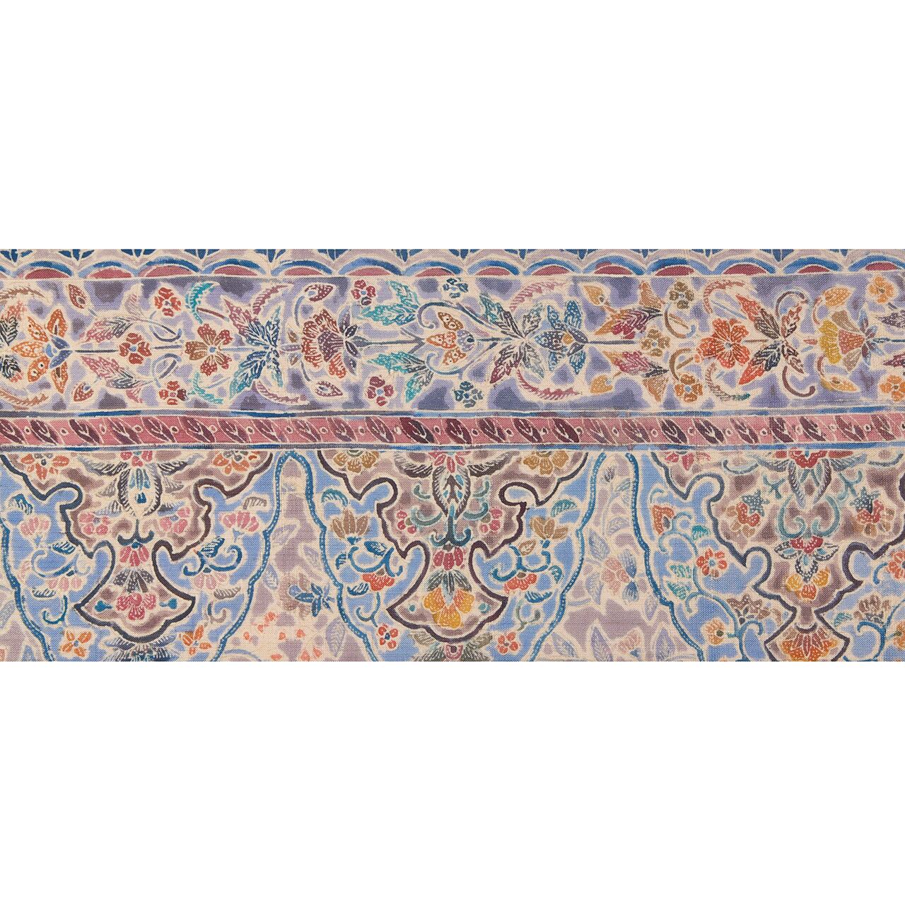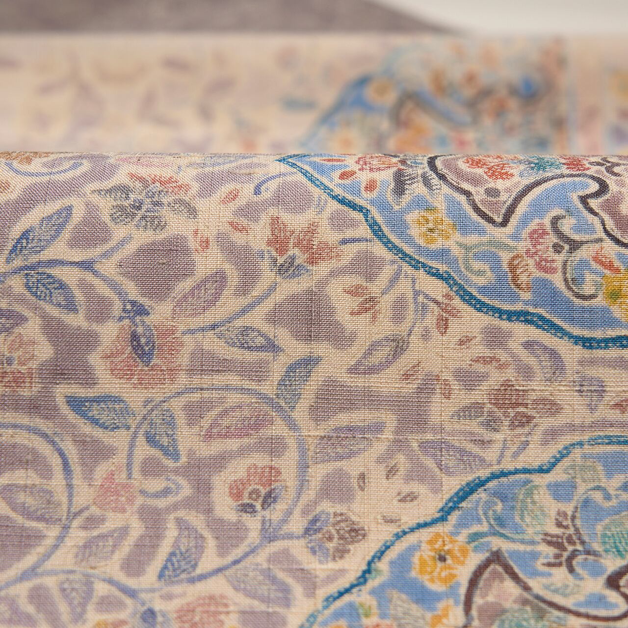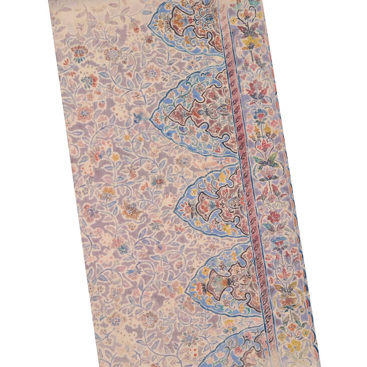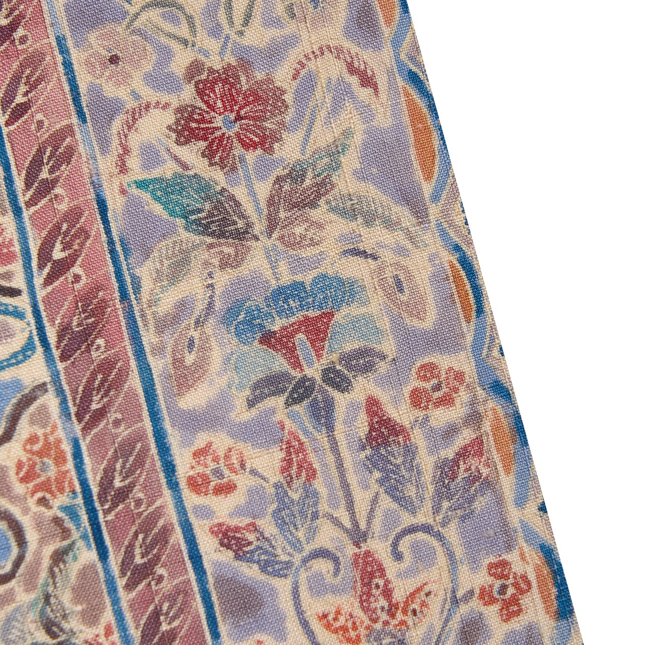 緯糸に節のある座繰りのさらっとした質感の手触りの良い、少しだけ紫味のあるグレー・紫鼠色の地に、お太鼓が淡い黄色味のあるベージュ・薄卵色の暈しで区切られ、鳩羽鼠色の背景にたおやかな花唐草模様が描かれ、右側にはボーダーが取られて、そこにはまた違ったパターンの花唐草模様が、ボーダーからは手の平くらいの大きさの木の葉をアレンジしたような模様が描かれた、ペルシャの伝統的な文様ともいえるような更紗模様が繊細な描写で染められた素敵な九寸名古屋帯です。