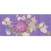 少しふっくらとした質感の真綿紬のような生地が、明るい淡い紫・菖蒲色に染められ、お太鼓には大きめの牡丹と万寿菊、それを取り囲むように桜があしらわれ、後ろには白い百合の花が置かれているといった様子が手描きの友禅で描かれ、満開のお花が咲きそろって華やかな雰囲気を醸し出した素敵な九寸名古屋帯です。