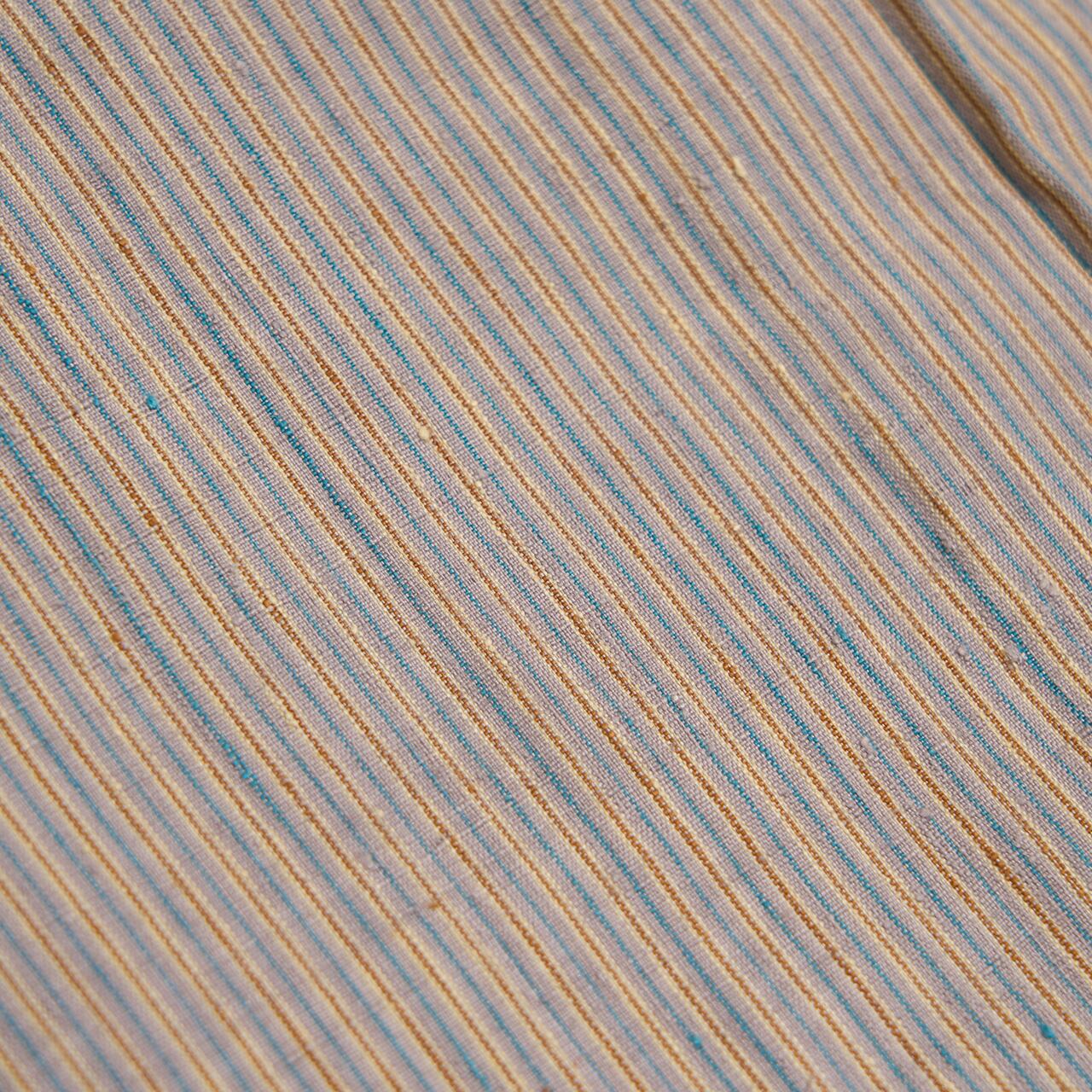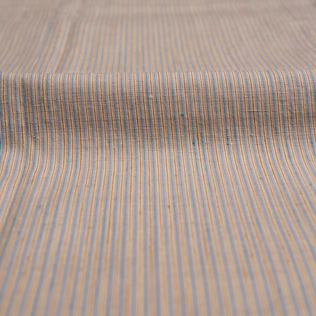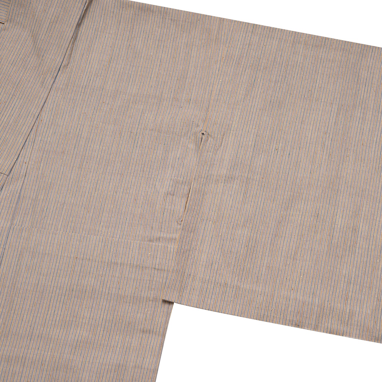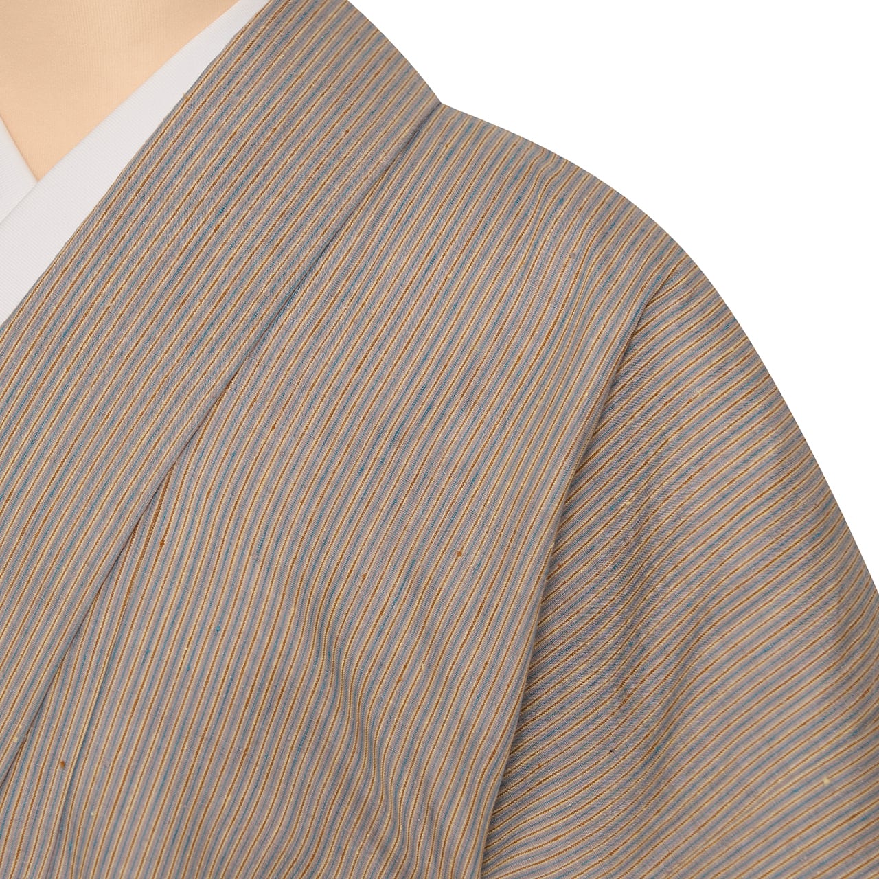 淡いベージュ・練色の地に、淡い藍・舛花色と明るい薄茶・江戸茶色の細い縞がさらりと織り込まれた、とてもお洒落な結城紬の単衣のお着物です。