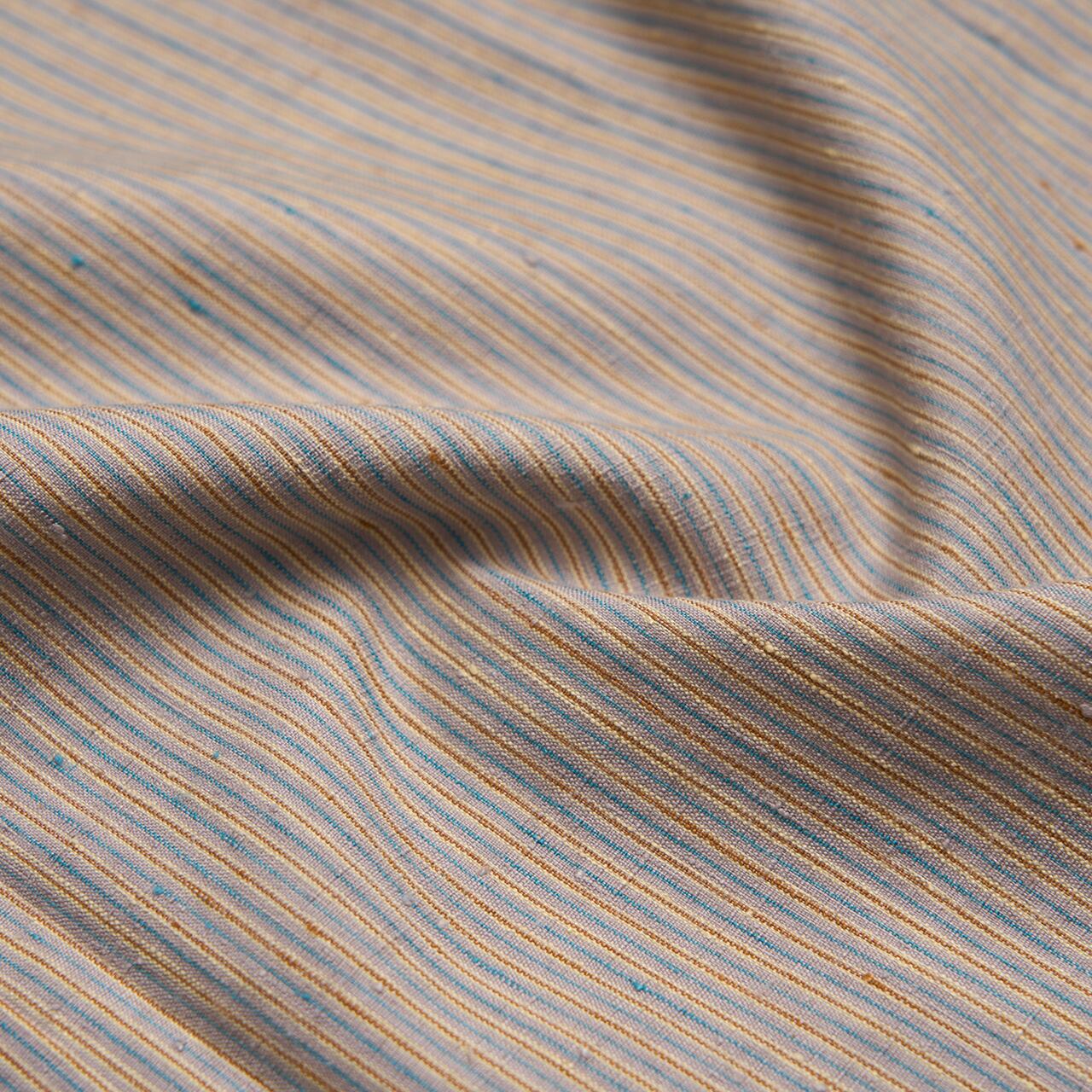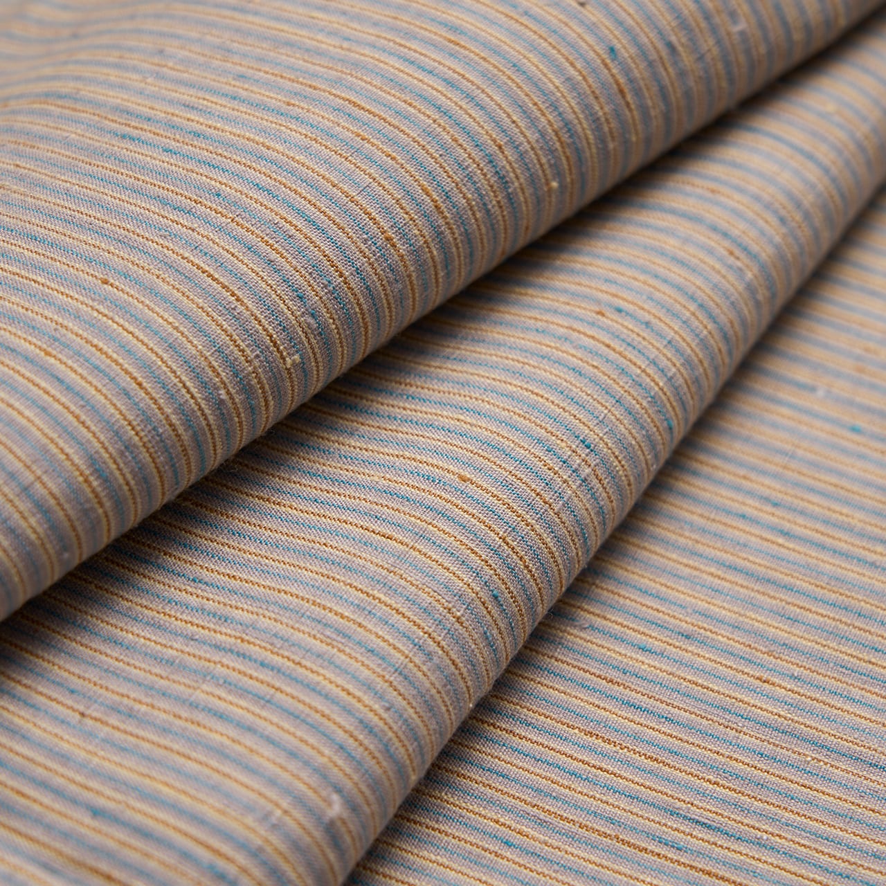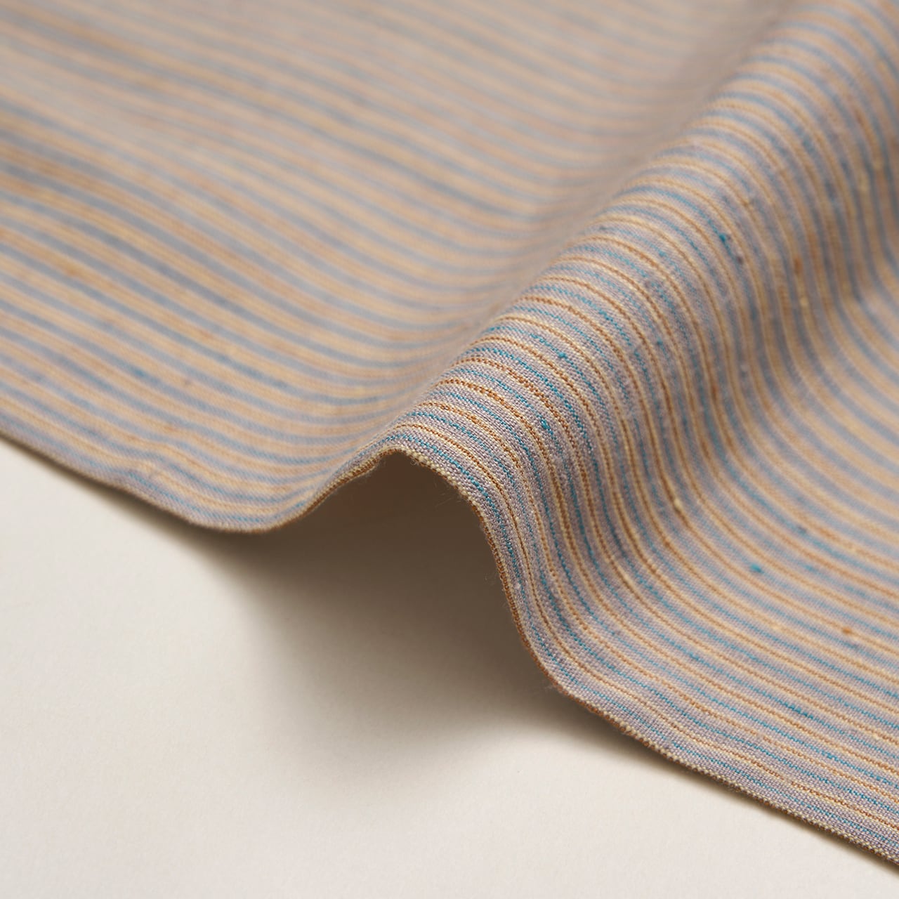 淡いベージュ・練色の地に、淡い藍・舛花色と明るい薄茶・江戸茶色の細い縞がさらりと織り込まれた、とてもお洒落な結城紬の単衣のお着物です。