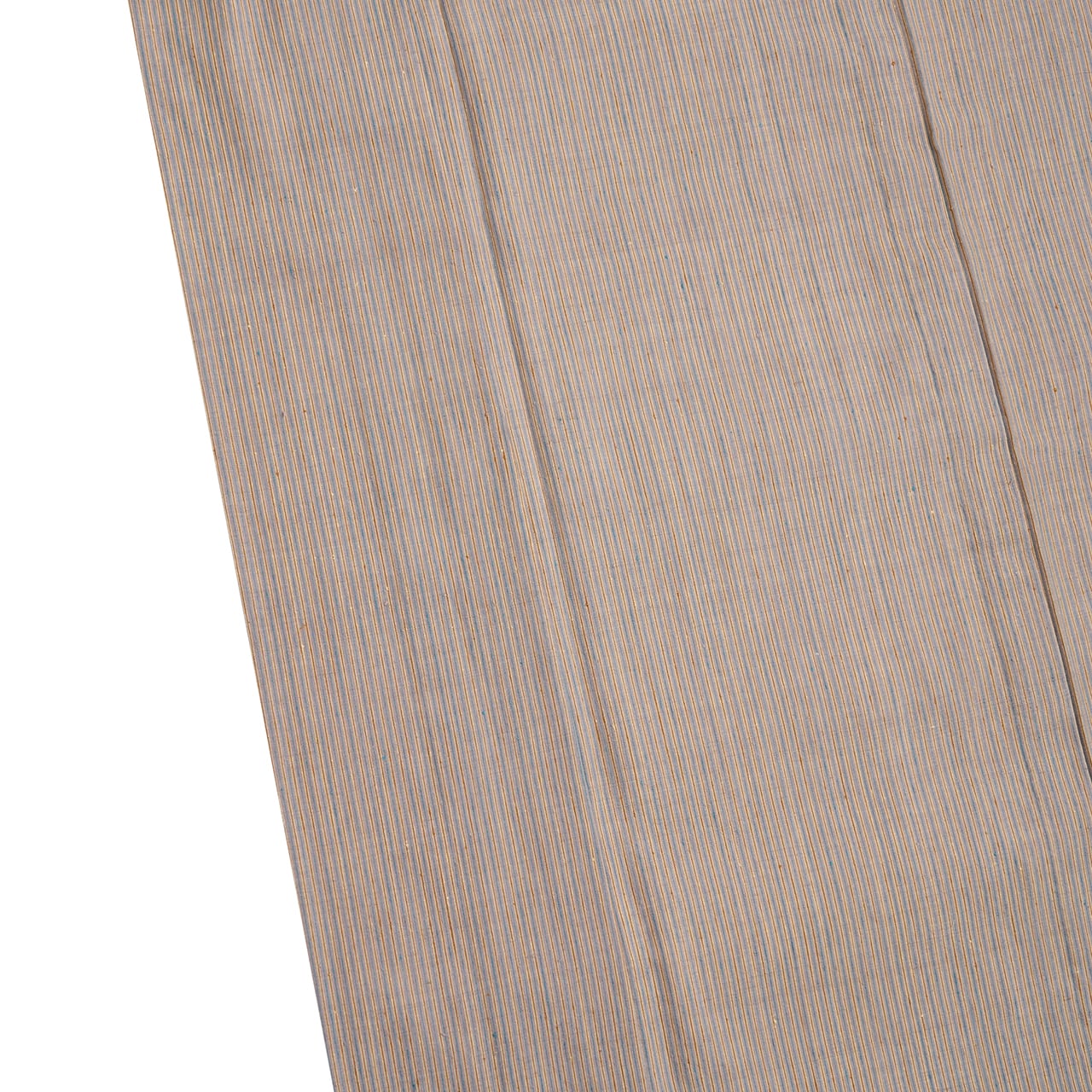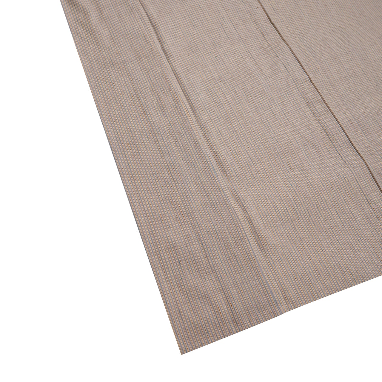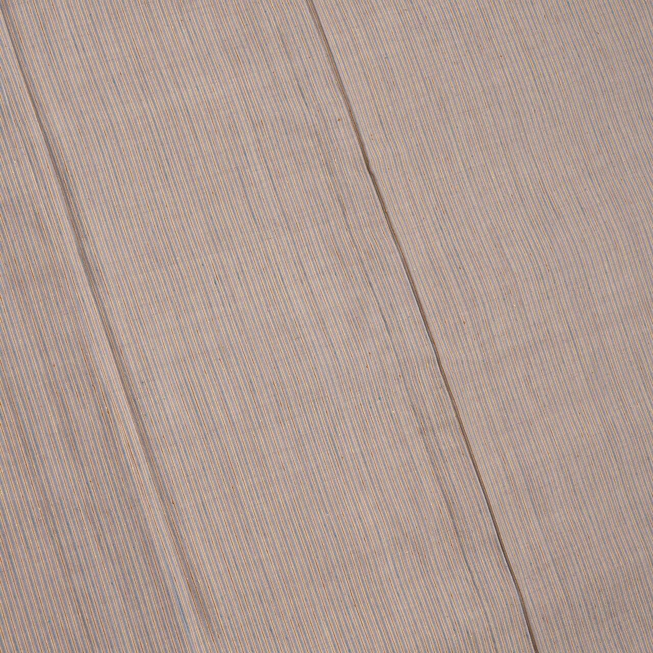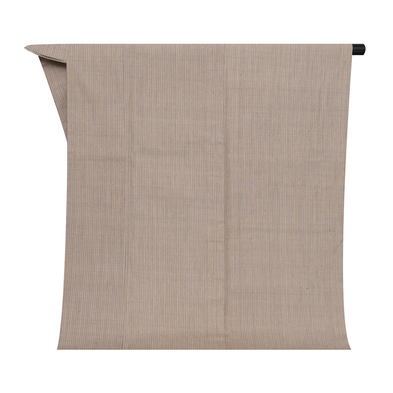 淡いベージュ・練色の地に、淡い藍・舛花色と明るい薄茶・江戸茶色の細い縞がさらりと織り込まれた、とてもお洒落な結城紬の単衣のお着物です。