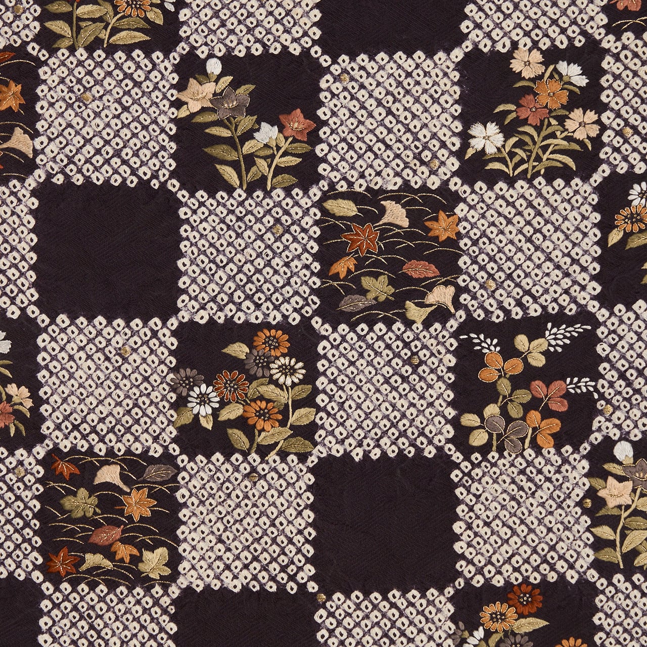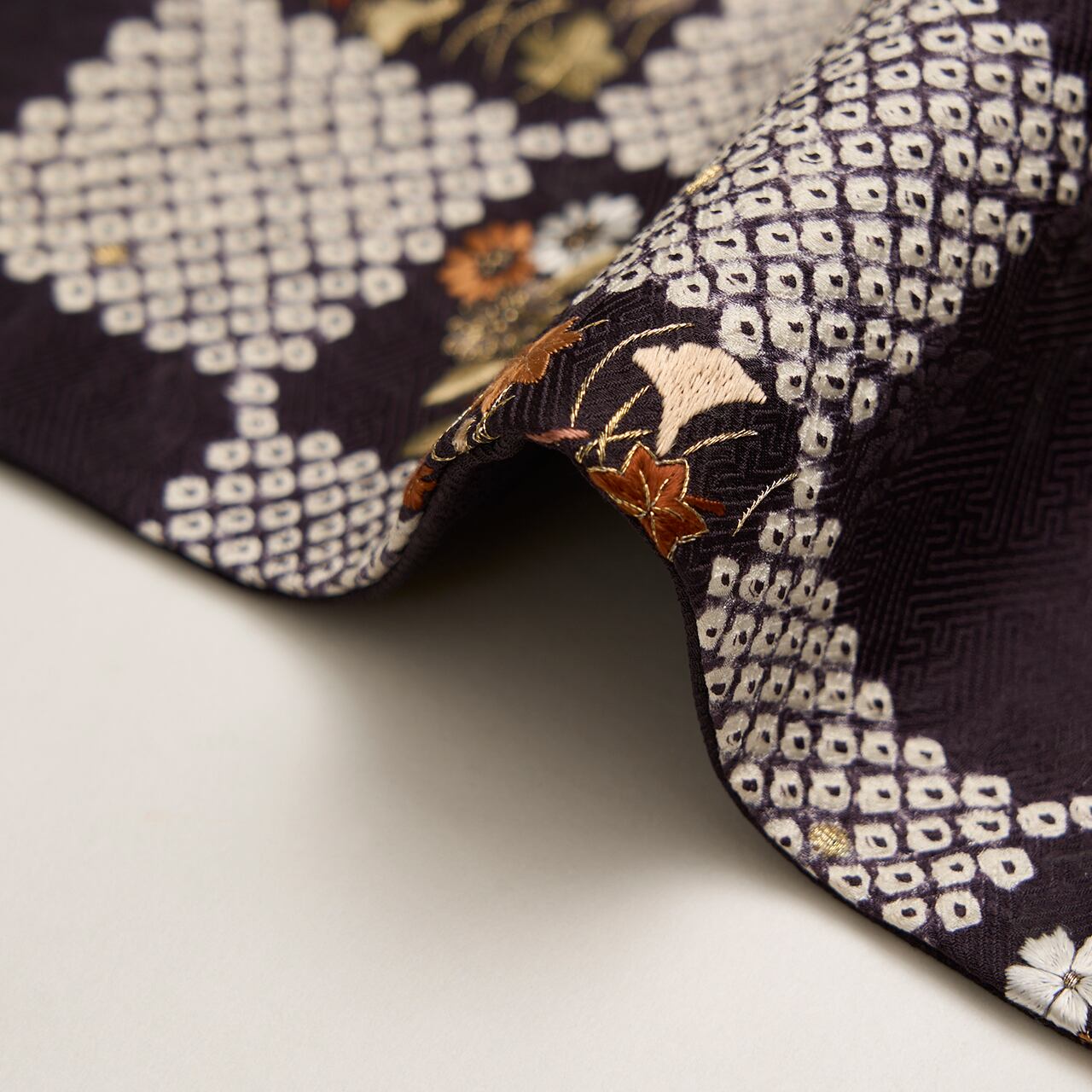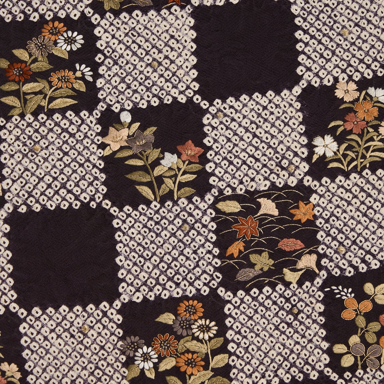 紗綾形に菊と春蘭のお花が散らされた地模様が織られた黒の緞子のような生地に、お太鼓には市松が取られ、ひとつには細やかな疋田の模様が絞り染めされ、もうひとつには萩や菊、桔梗、ナデシコ、イチョウ、紅葉などの草花がシックな色使いの手刺繍で表された、とても素敵な九寸名古屋帯です。