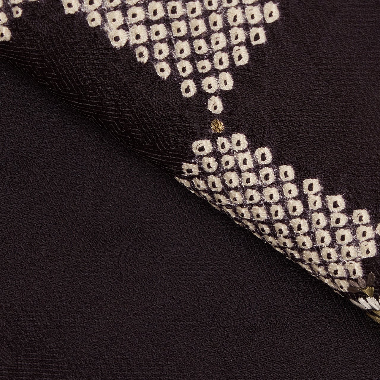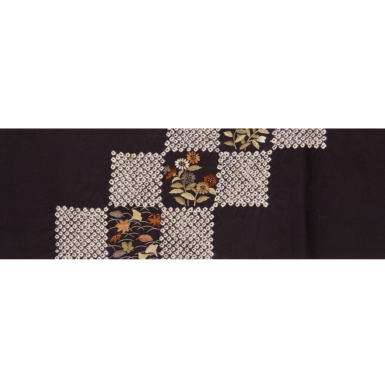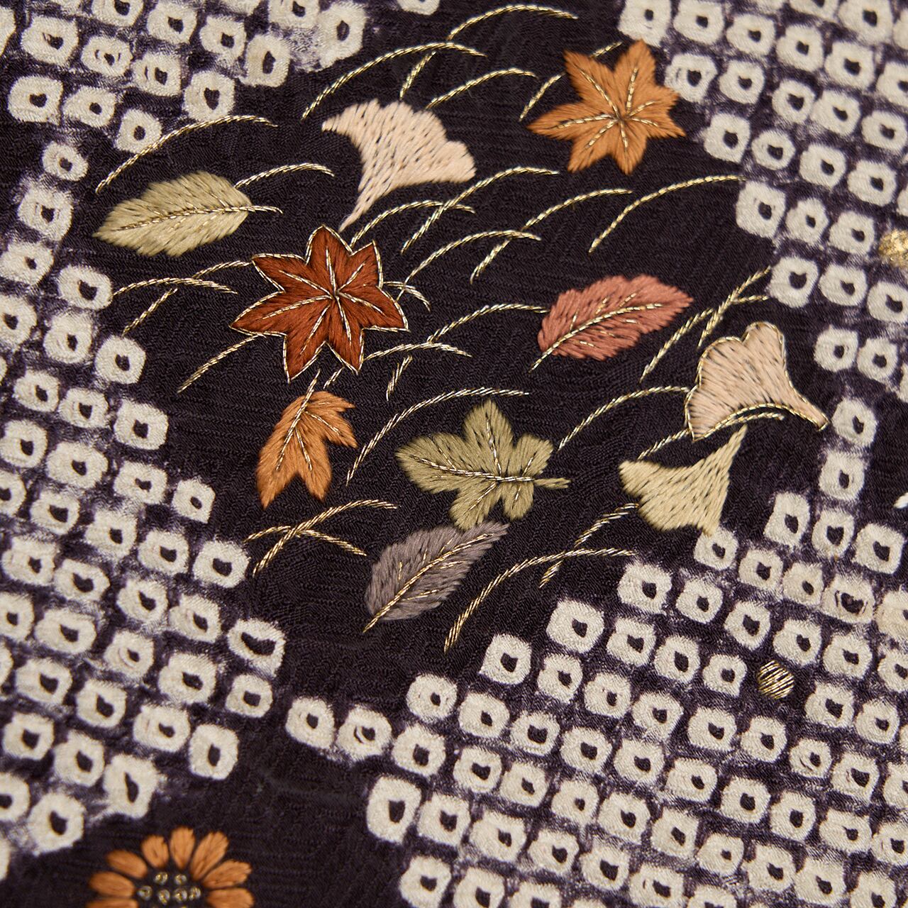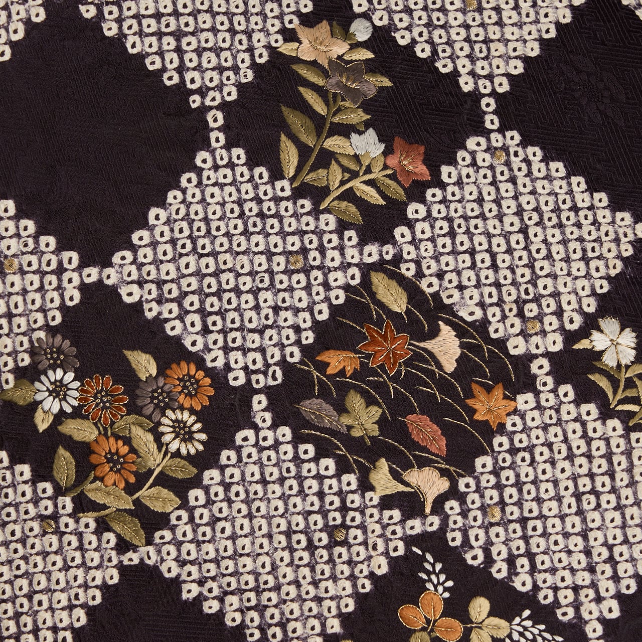 紗綾形に菊と春蘭のお花が散らされた地模様が織られた黒の緞子のような生地に、お太鼓には市松が取られ、ひとつには細やかな疋田の模様が絞り染めされ、もうひとつには萩や菊、桔梗、ナデシコ、イチョウ、紅葉などの草花がシックな色使いの手刺繍で表された、とても素敵な九寸名古屋帯です。
