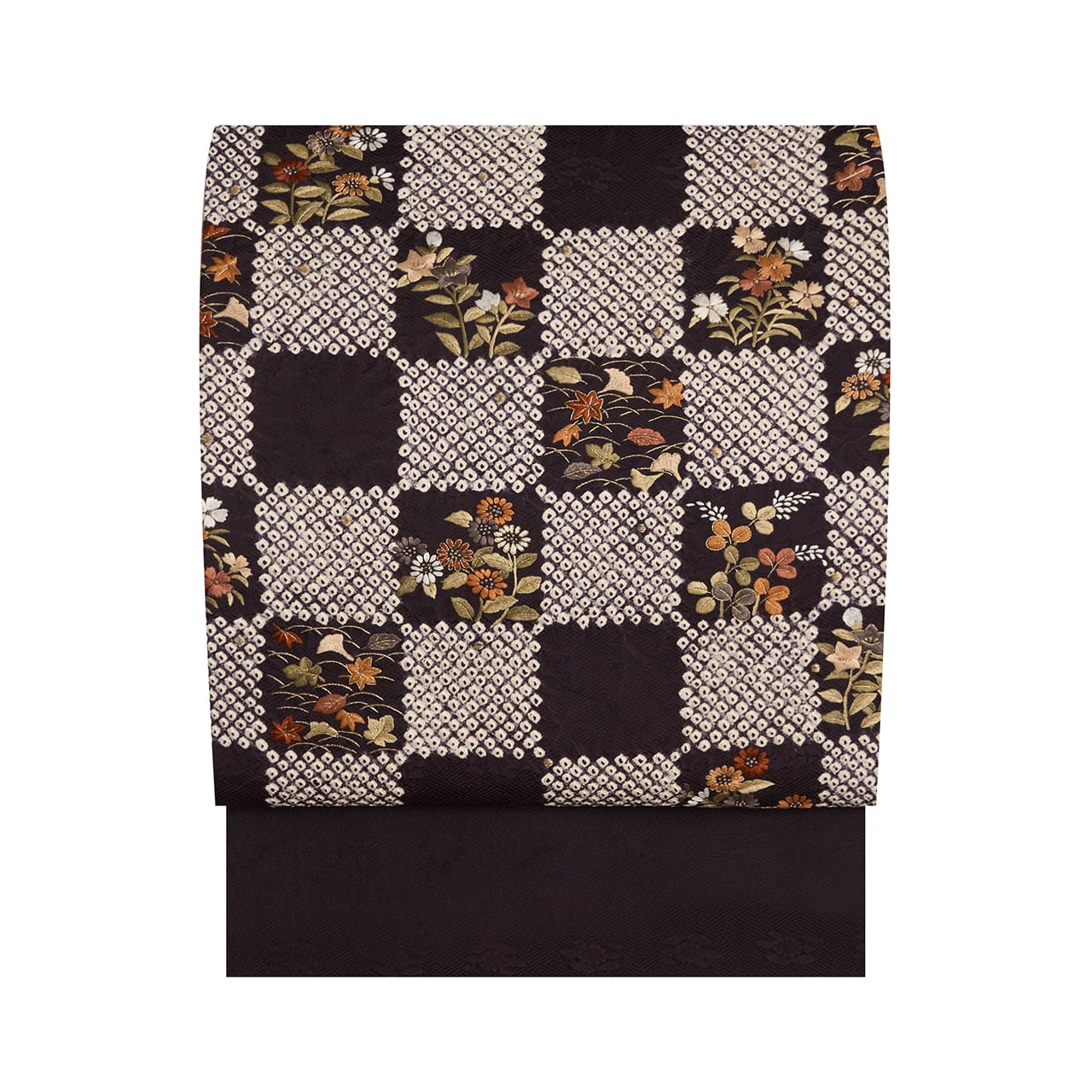 市松取りに草花模様 疋田絞りに手刺繍 名古屋帯【中古】