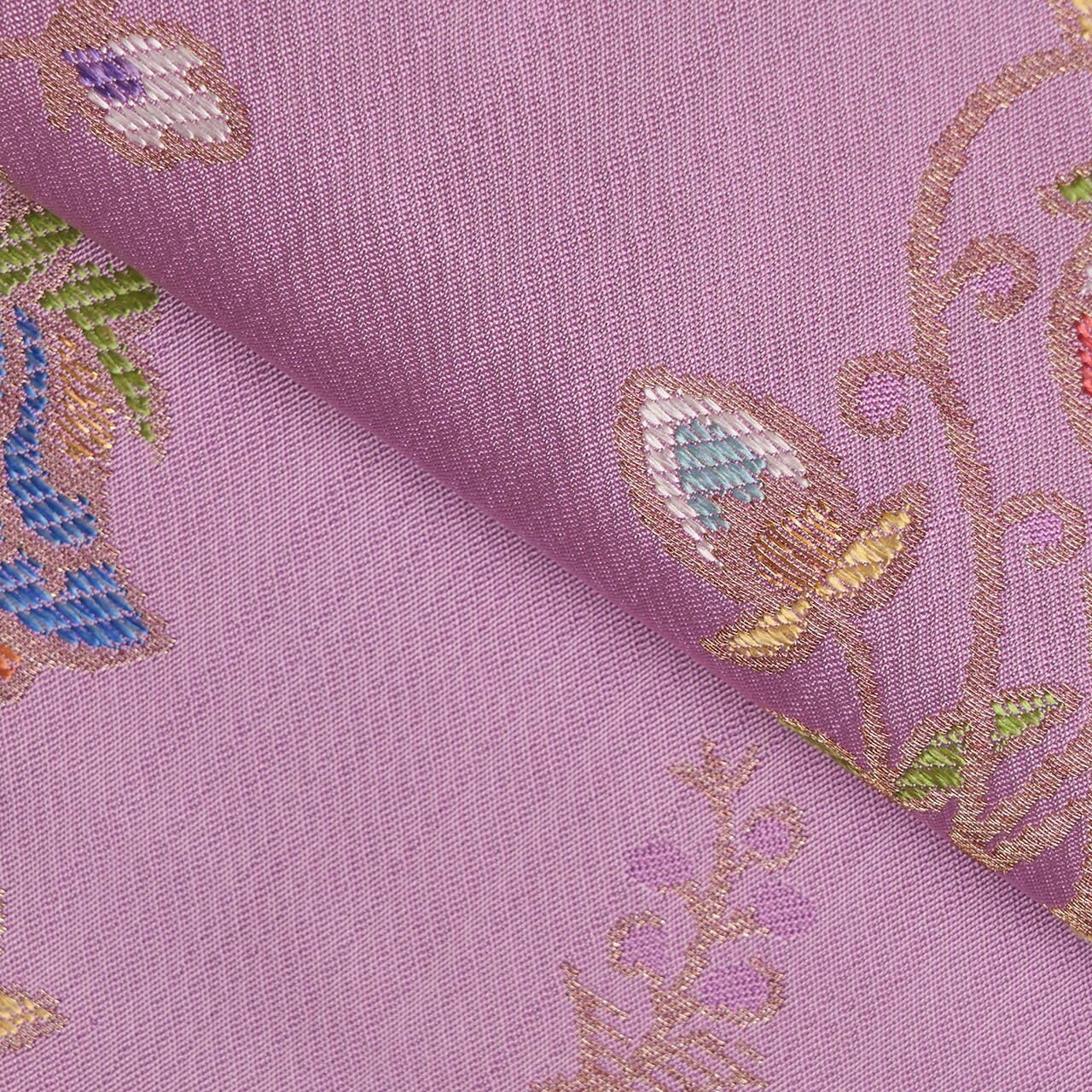 地色の明るい紫のセレクトだけでもとてもお洒落だと思いますが、ランプのような形をした唐花も、甚三紅色のオレンジ、薄花色、菫色、若葉色といった調子に綺麗な色で織り出されていて、とてもお洒落な雰囲気となっています。