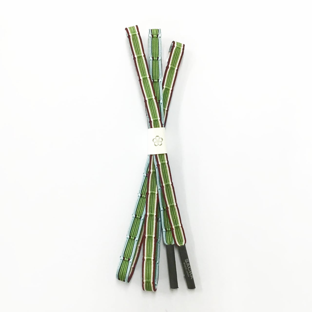片面は浅緑色に胡粉色と葡萄色、もう片面は浅緑色に空色で組まれており、両面のどちらでもお使いいただけます。
