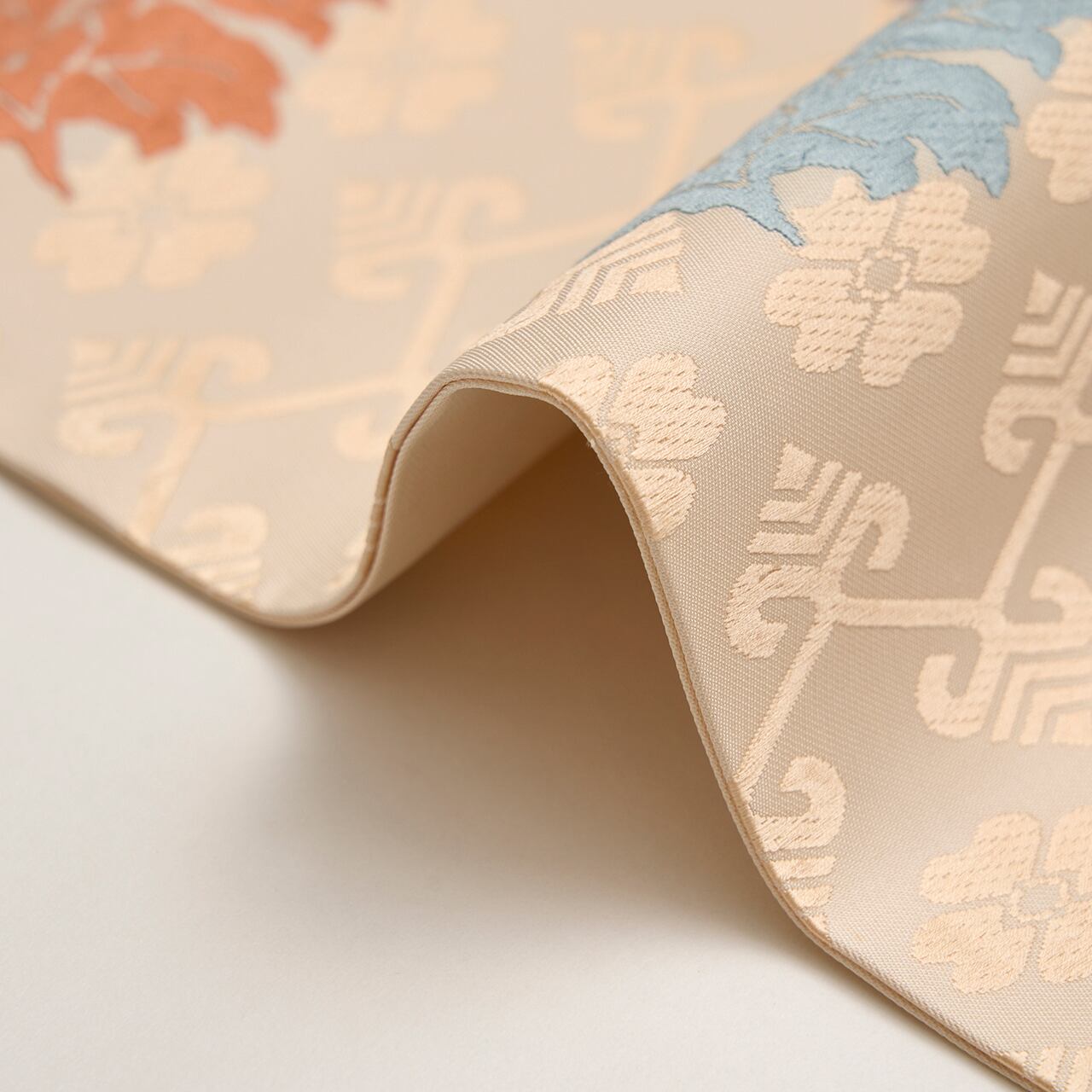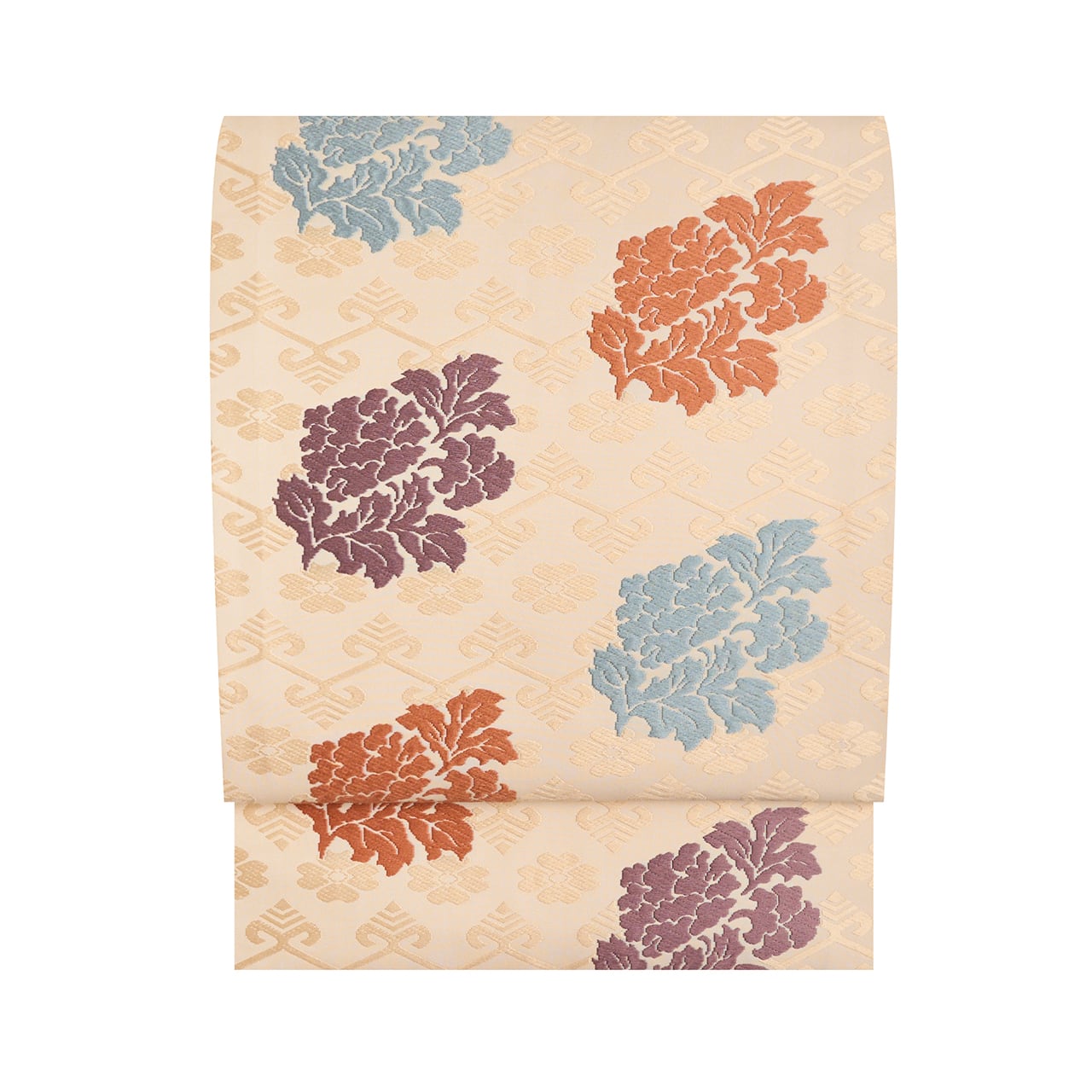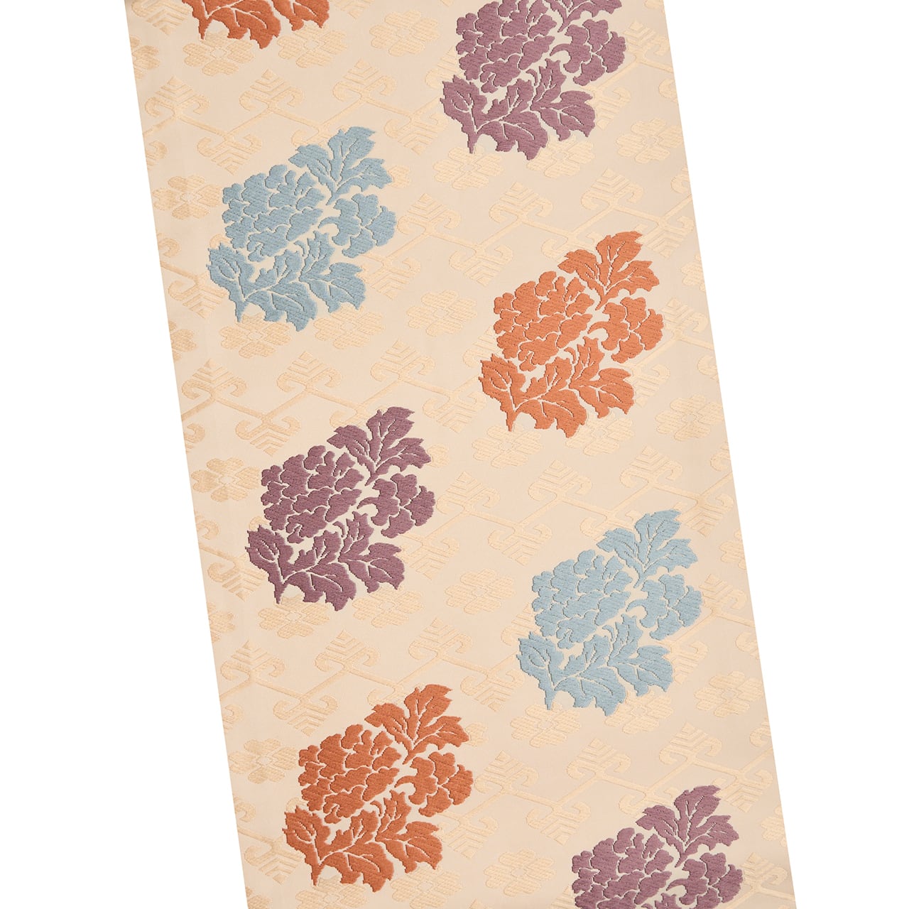 練色のシャリっとした質感の生地に、淡い薄卵色の糸でジグザグの横段と花文が織り出され、その上の層には牡丹の一枝のような形の模様が、浅縹色の水色、似せ紫色、代赭色のオレンジなどの糸で織り出された、有職文様としては少し華やかさのある、そして気品の感じられる喜多川俵二さんの素敵な九寸名古屋帯です。