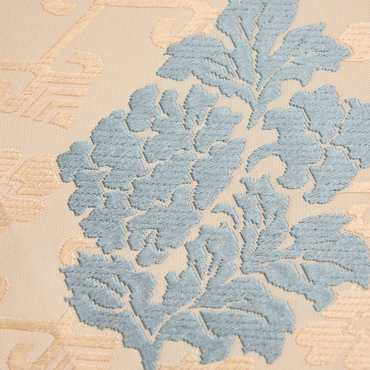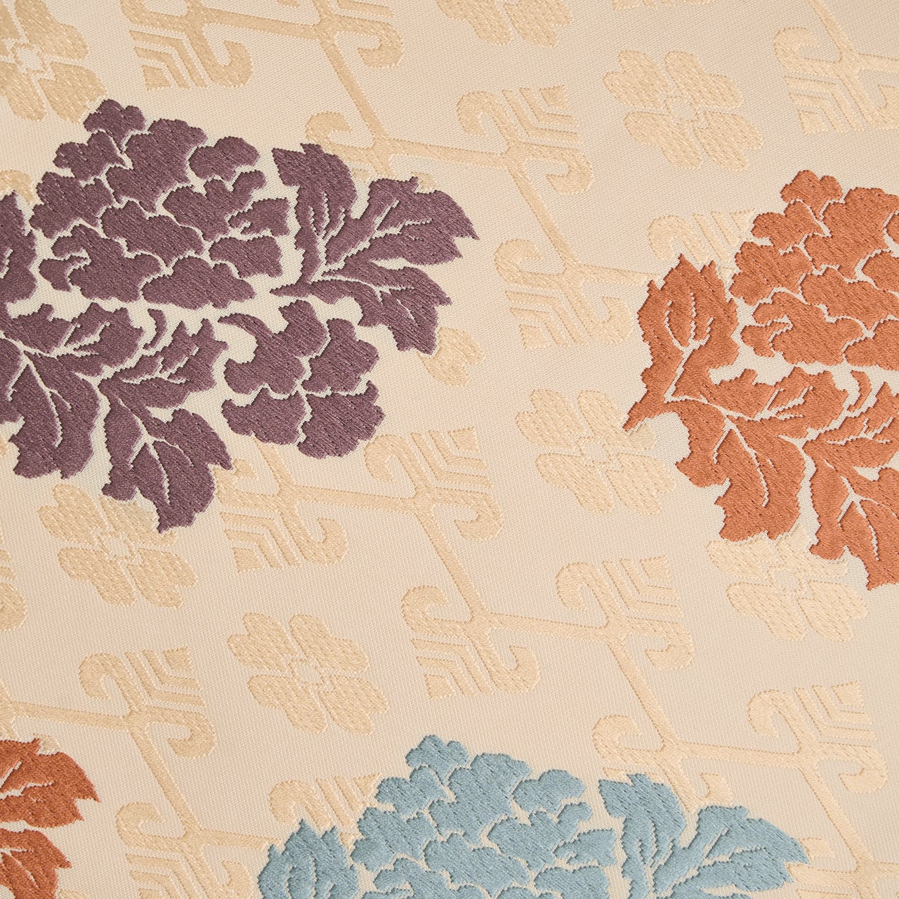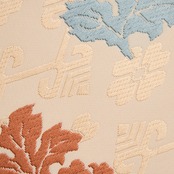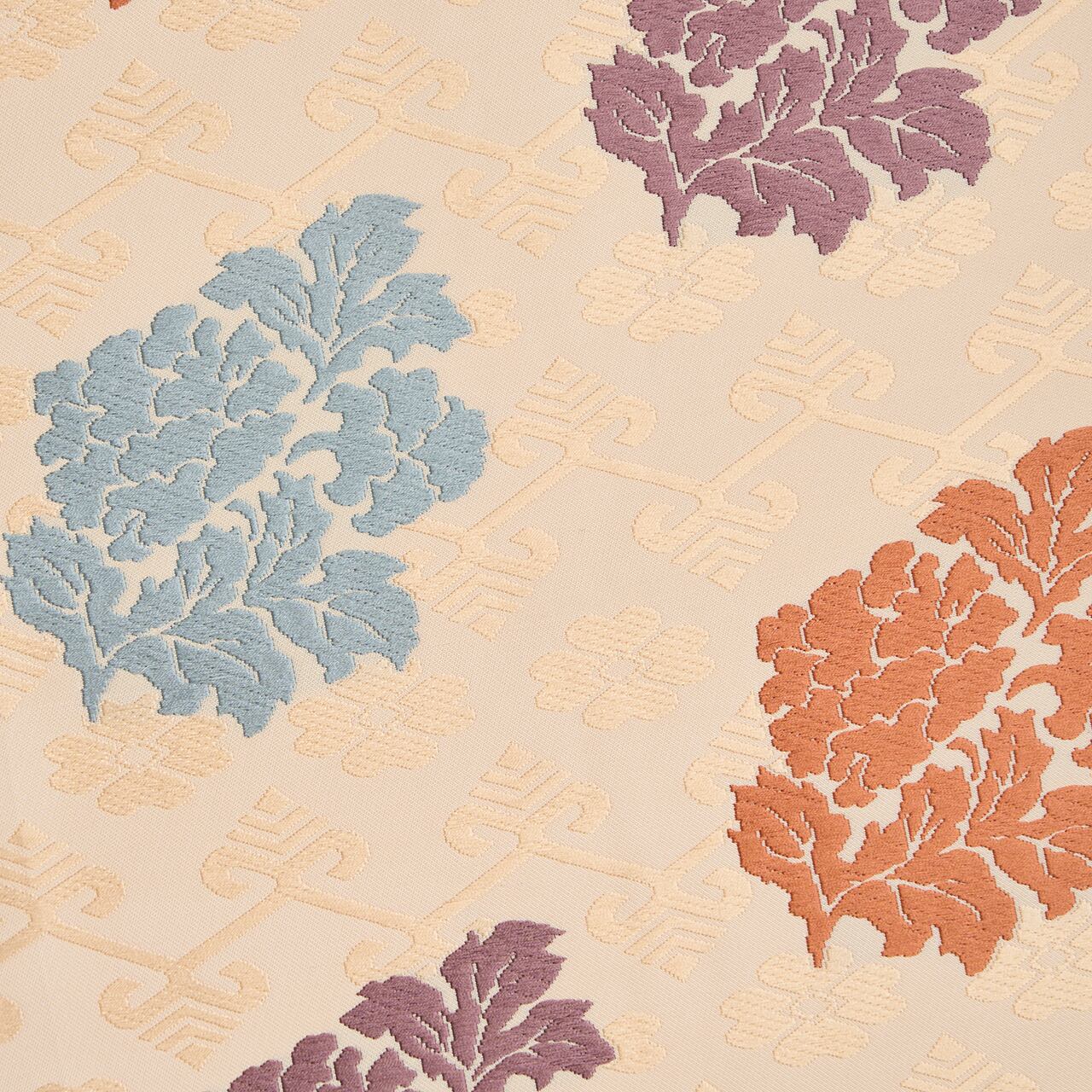 練色のシャリっとした質感の生地に、淡い薄卵色の糸でジグザグの横段と花文が織り出され、その上の層には牡丹の一枝のような形の模様が、浅縹色の水色、似せ紫色、代赭色のオレンジなどの糸で織り出された、有職文様としては少し華やかさのある、そして気品の感じられる喜多川俵二さんの素敵な九寸名古屋帯です。