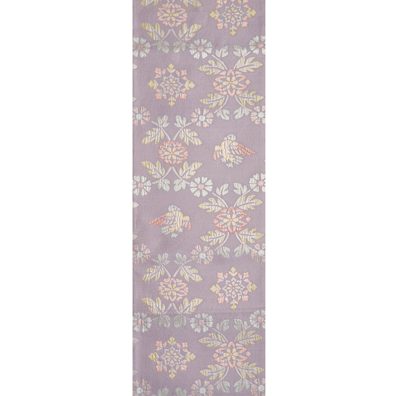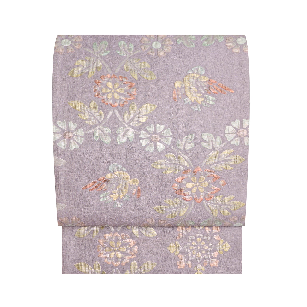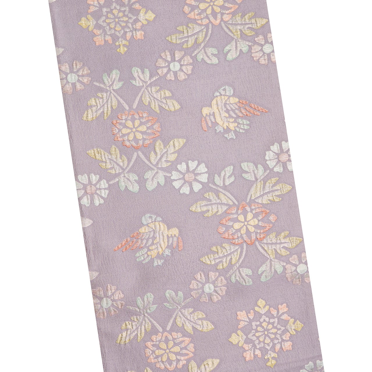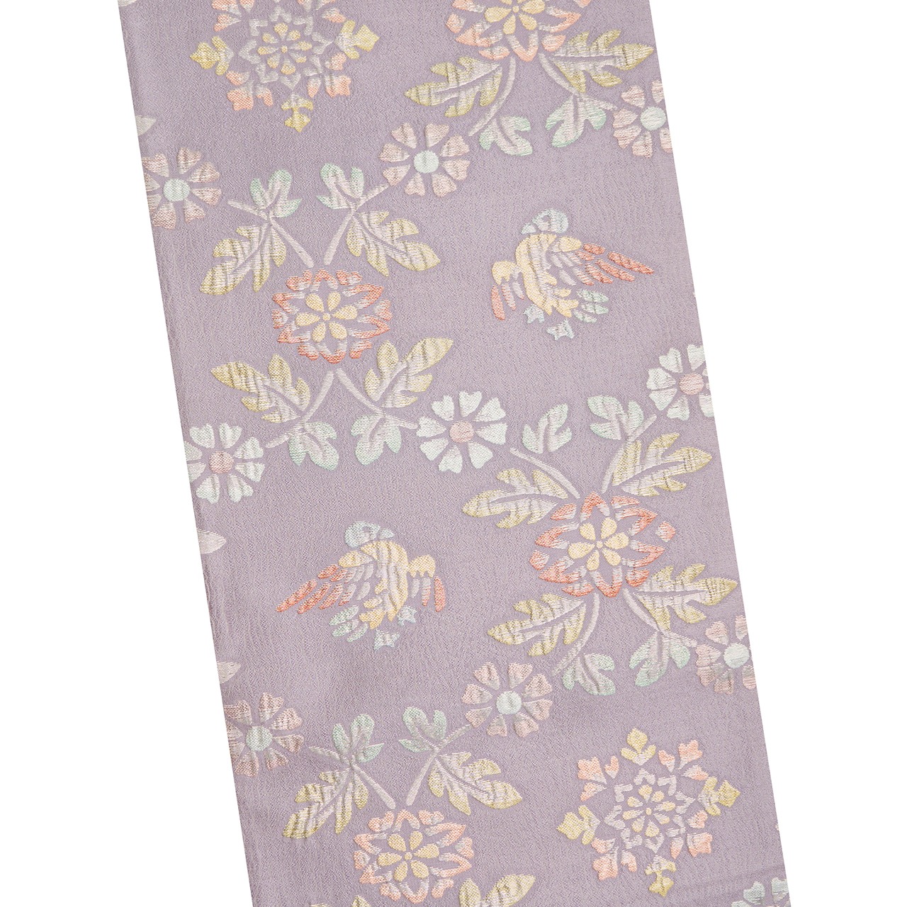 縦にシボのような、シワのような地模様が織られた、明るく淡い藤色・半色の生地に、花唐草文様とその傍らを飛ぶ小鳥の姿が、纐纈織といわれるふくれ織のような技法でカラフルな箔の糸を使って織り出された袋帯です。
