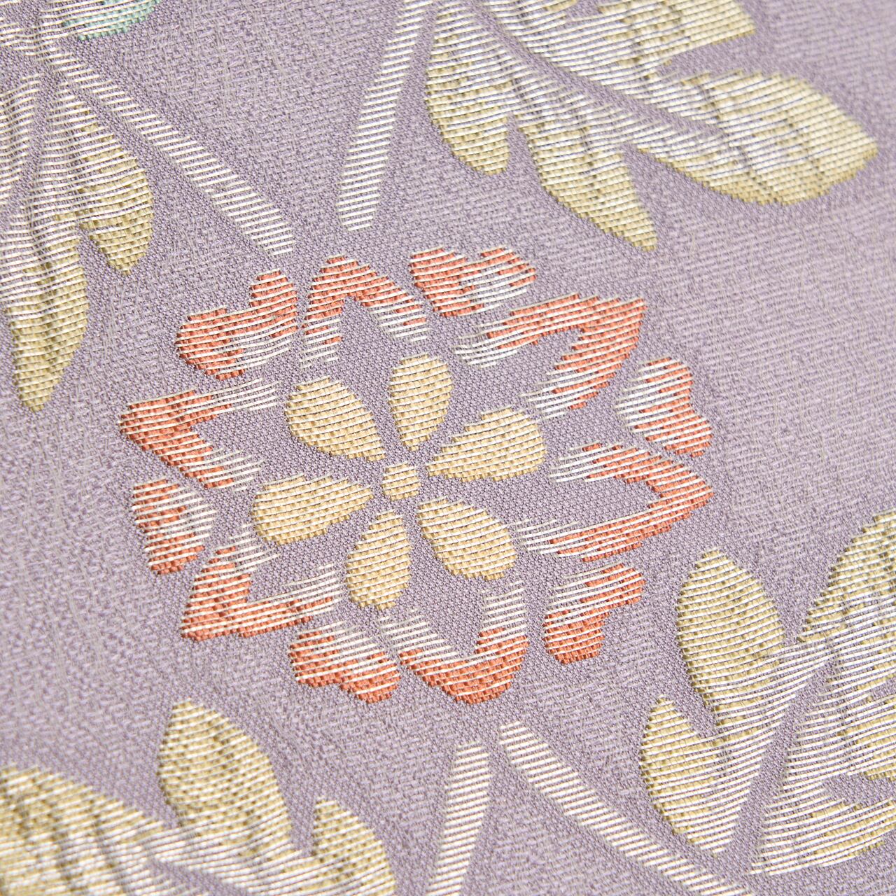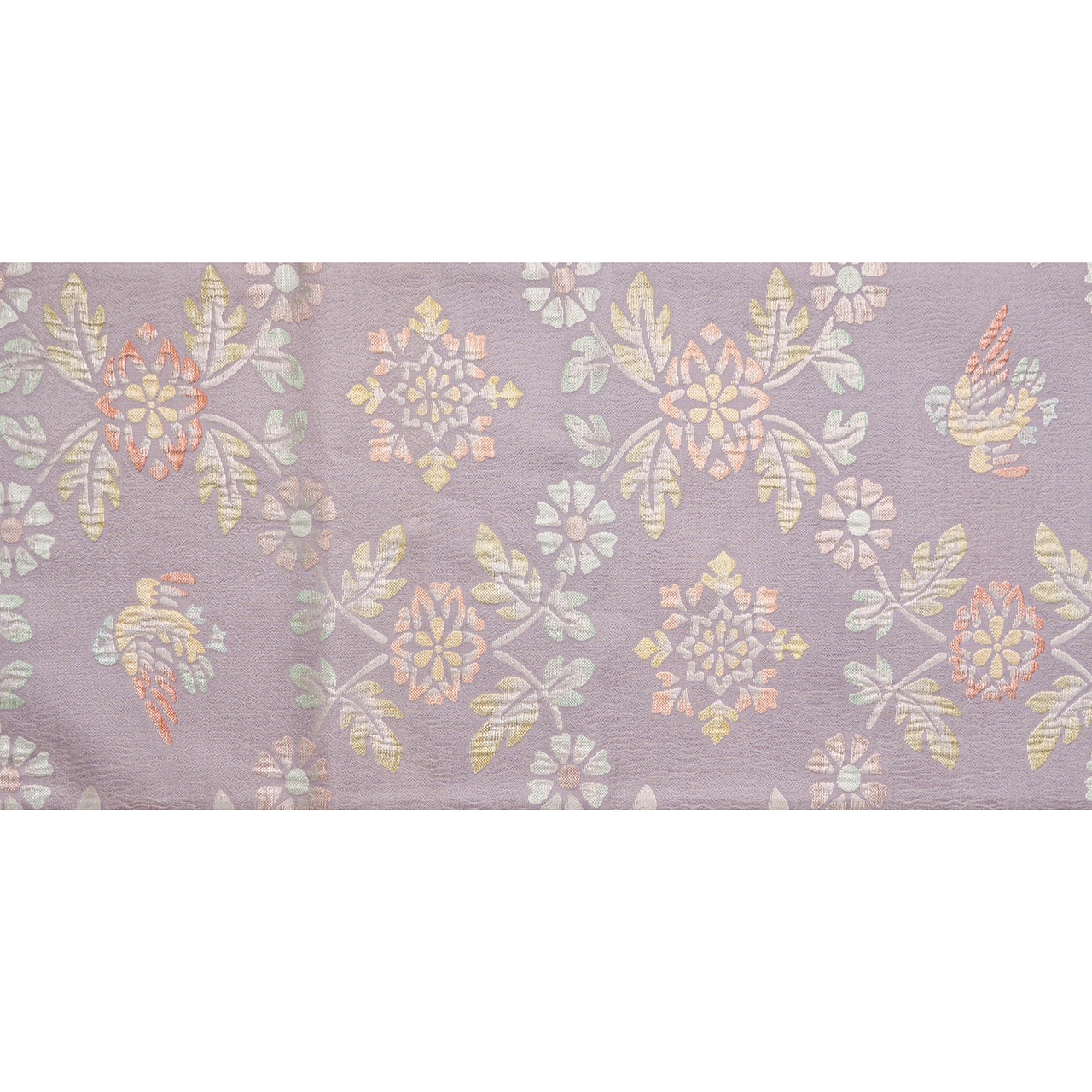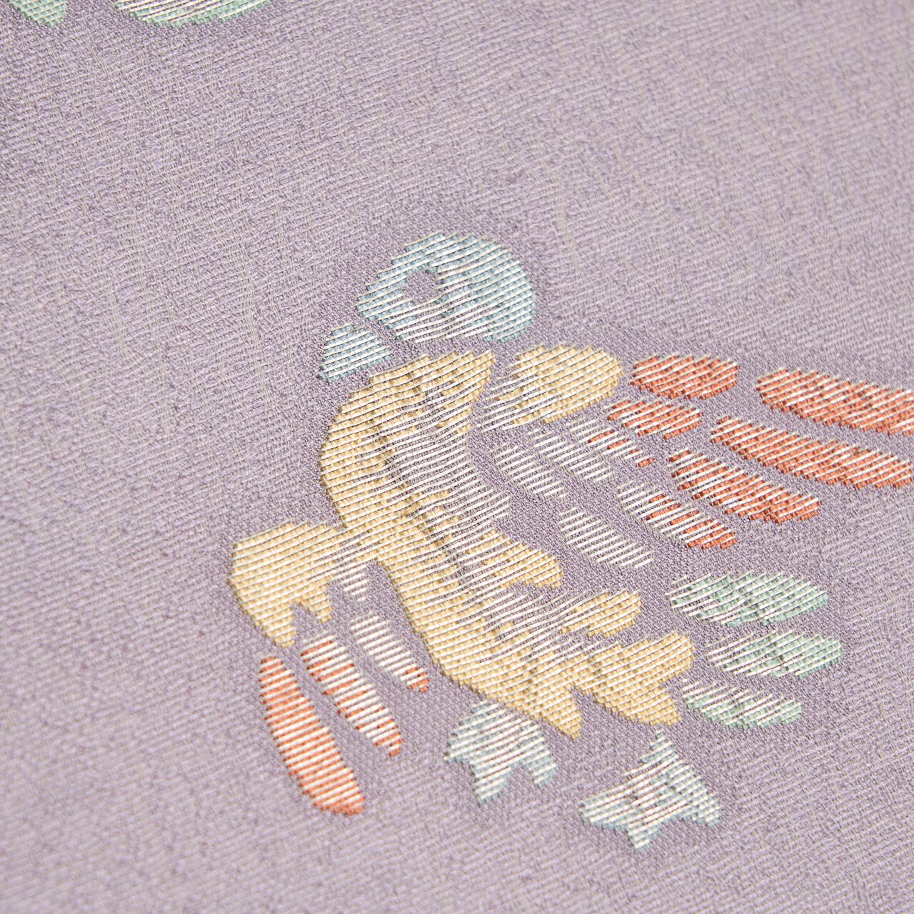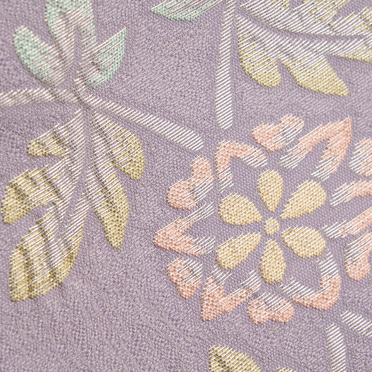 縦にシボのような、シワのような地模様が織られた、明るく淡い藤色・半色の生地に、花唐草文様とその傍らを飛ぶ小鳥の姿が、纐纈織といわれるふくれ織のような技法でカラフルな箔の糸を使って織り出された袋帯です。