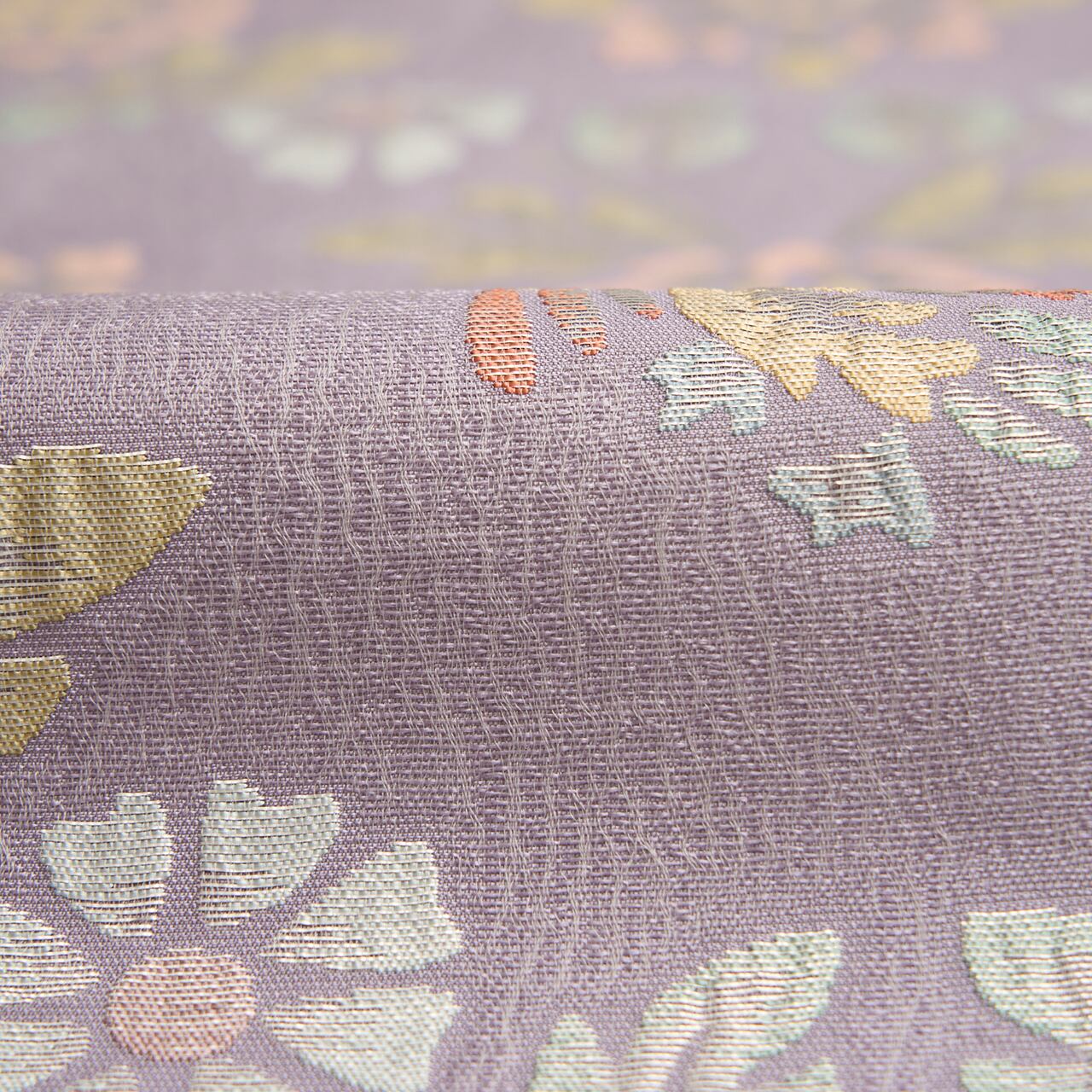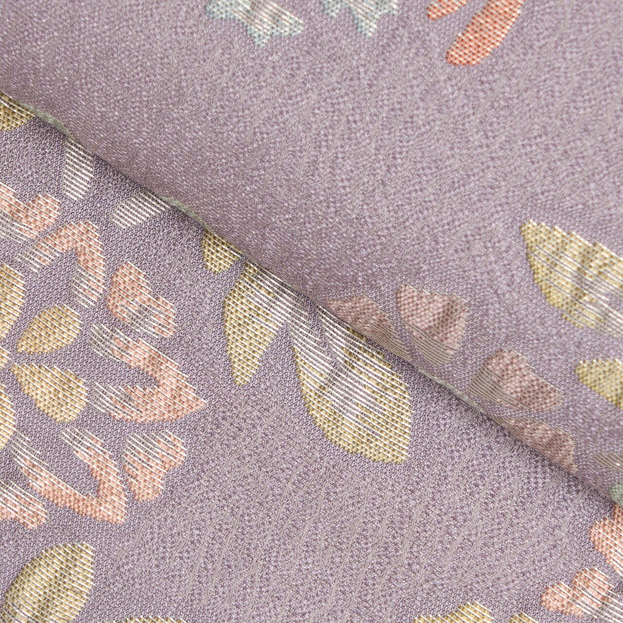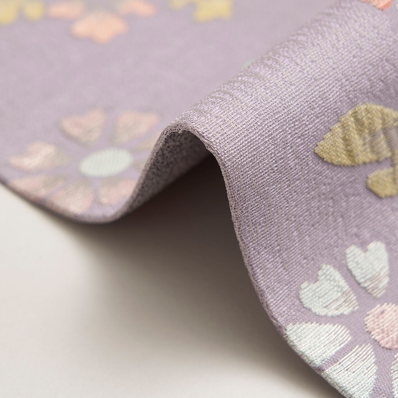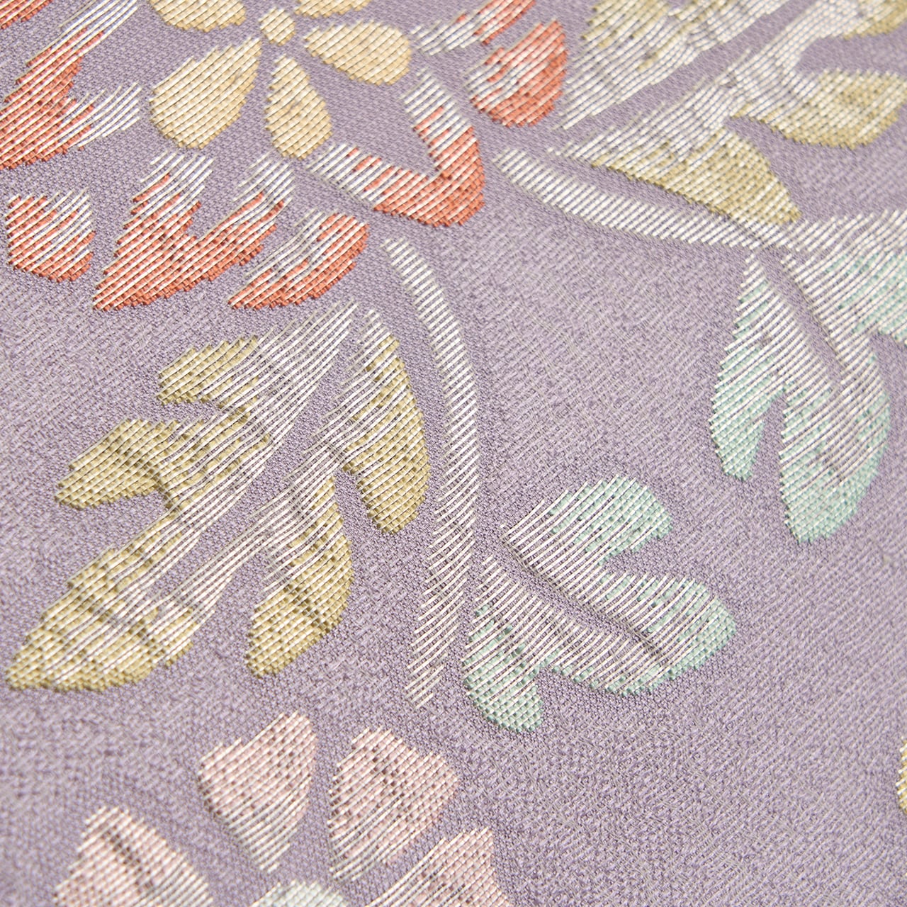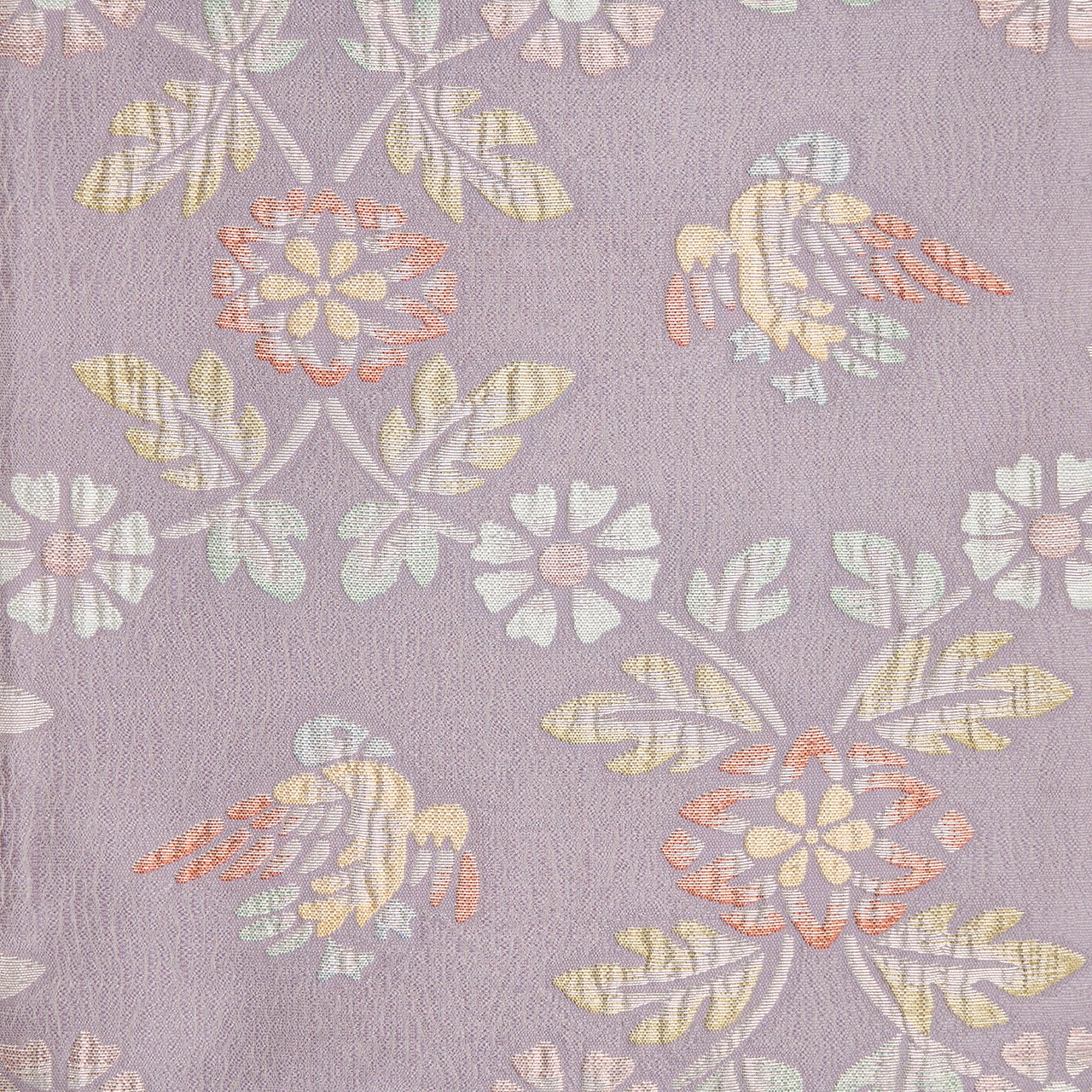 縦にシボのような、シワのような地模様が織られた、明るく淡い藤色・半色の生地に、花唐草文様とその傍らを飛ぶ小鳥の姿が、纐纈織といわれるふくれ織のような技法でカラフルな箔の糸を使って織り出された袋帯です。