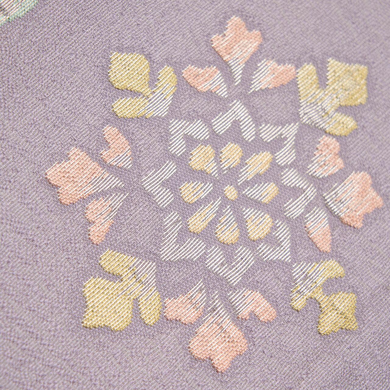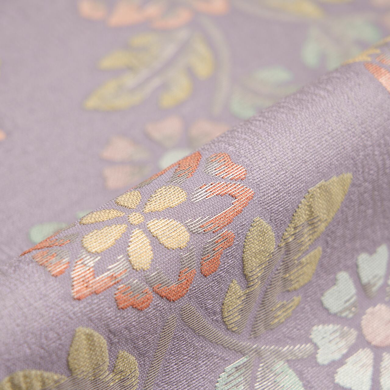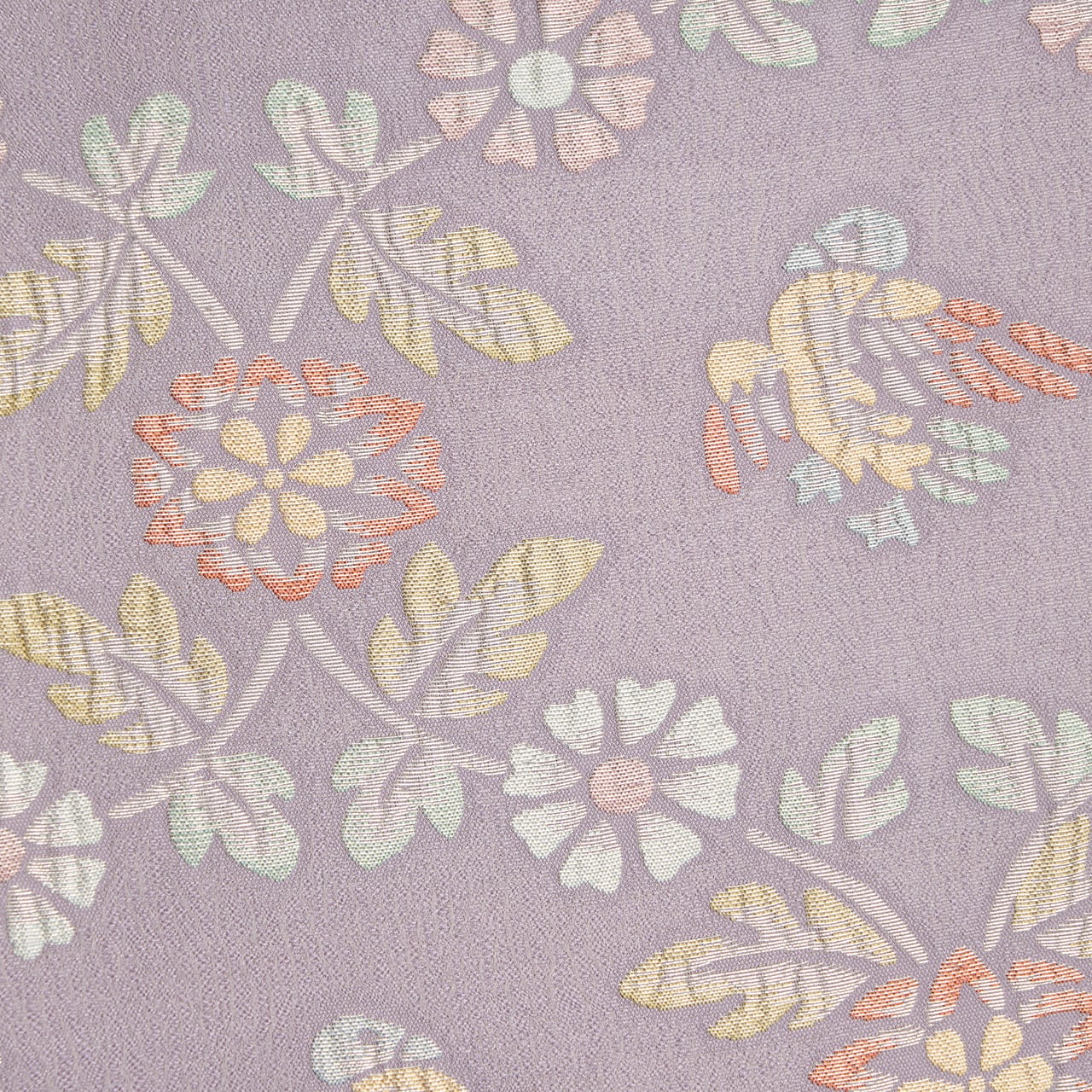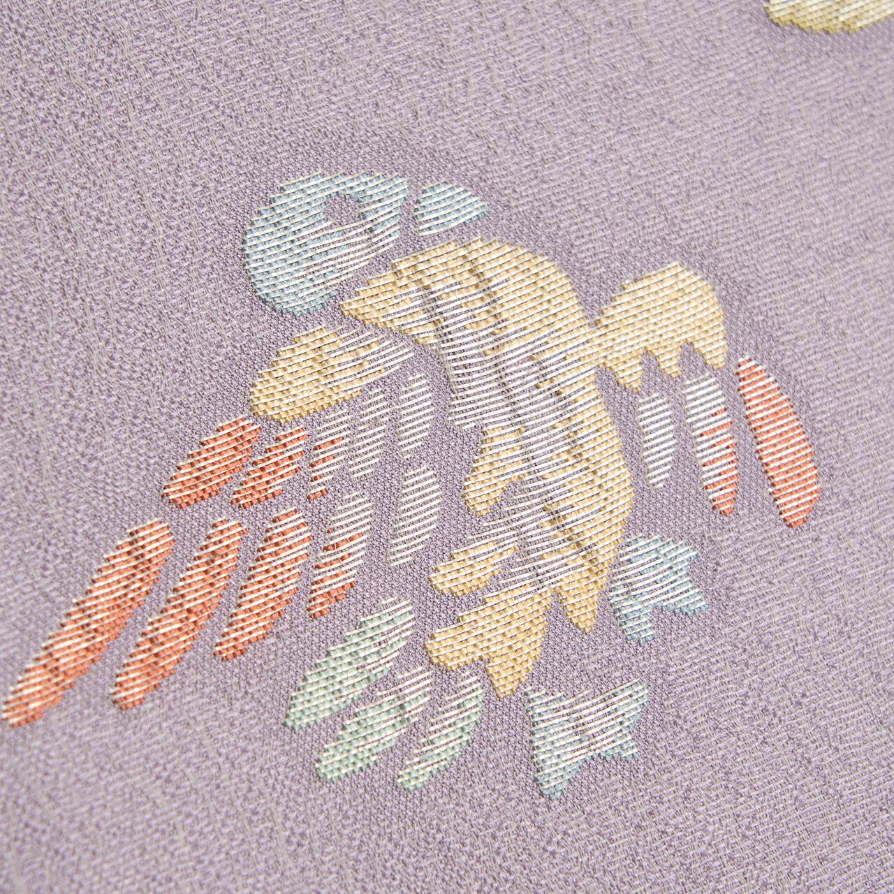 縦にシボのような、シワのような地模様が織られた、明るく淡い藤色・半色の生地に、花唐草文様とその傍らを飛ぶ小鳥の姿が、纐纈織といわれるふくれ織のような技法でカラフルな箔の糸を使って織り出された袋帯です。