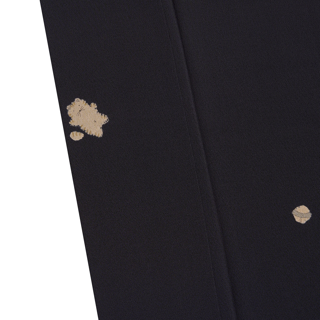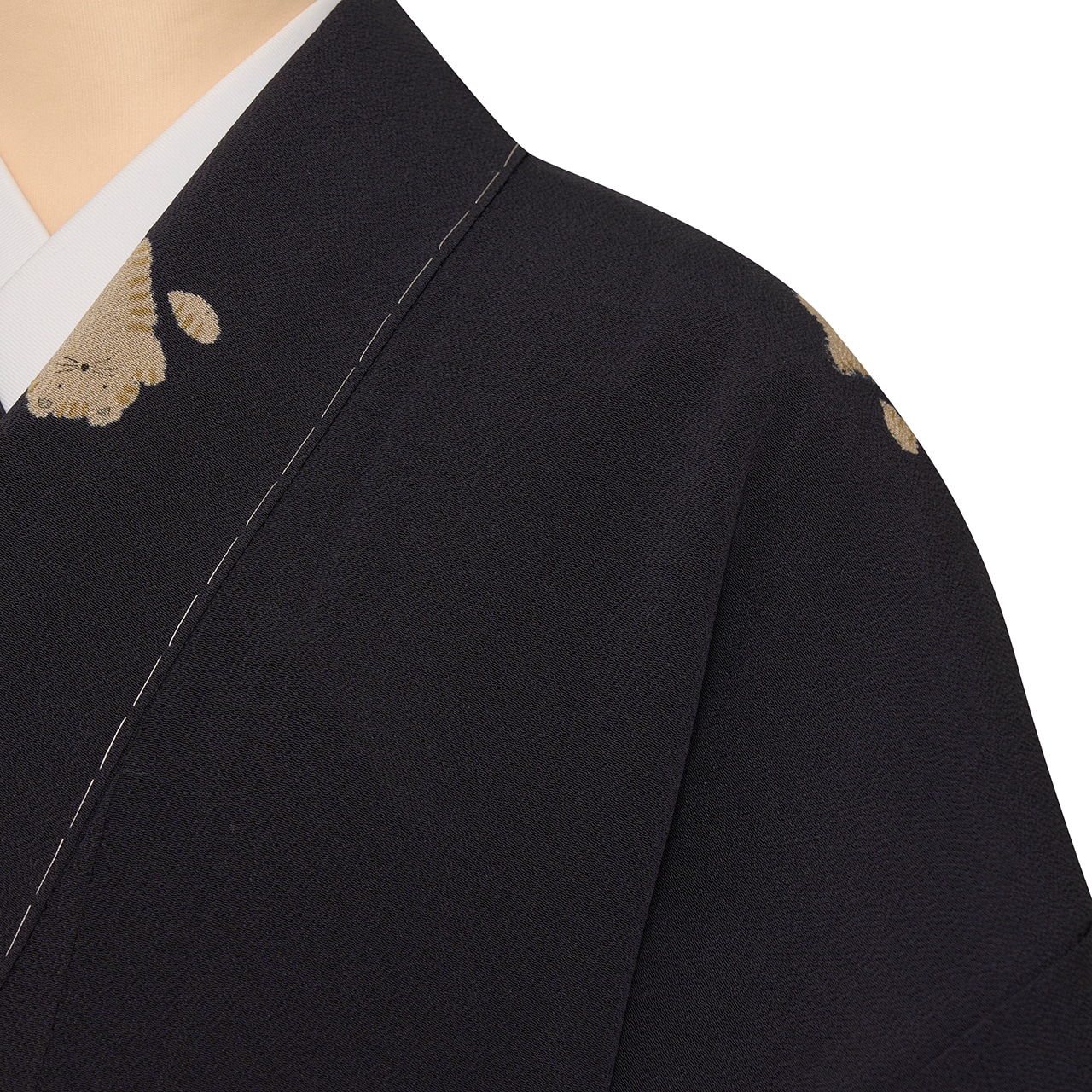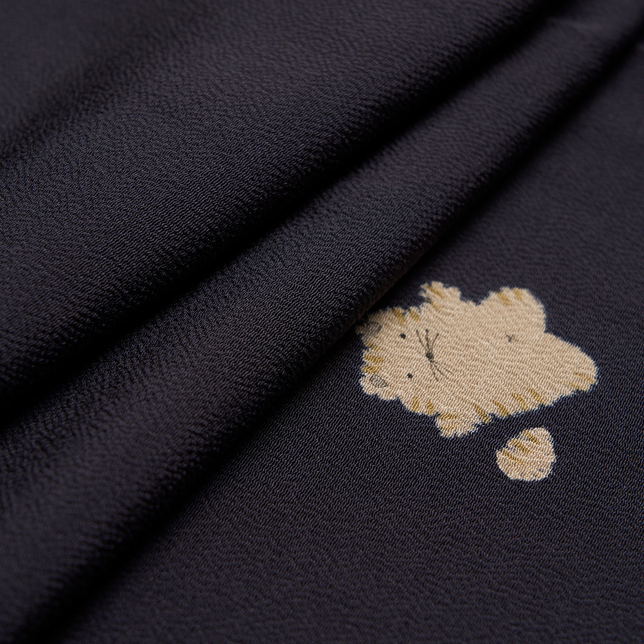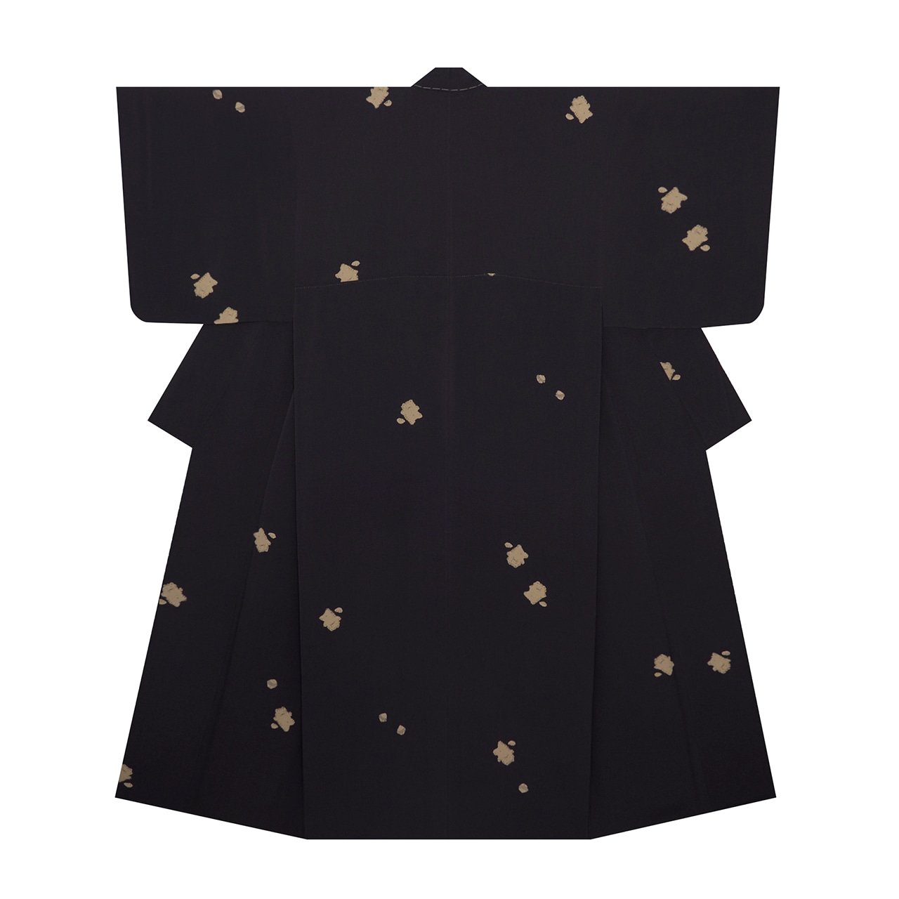 それでいて可愛らしい模様とは裏腹に、とてもシックな色使いと、絞り染めという凝った染めとなっていることでどことなく格調高さも感じられますので、帯の合わせ方によってはお召しいただける範囲も広くなるのではないでしょうか。