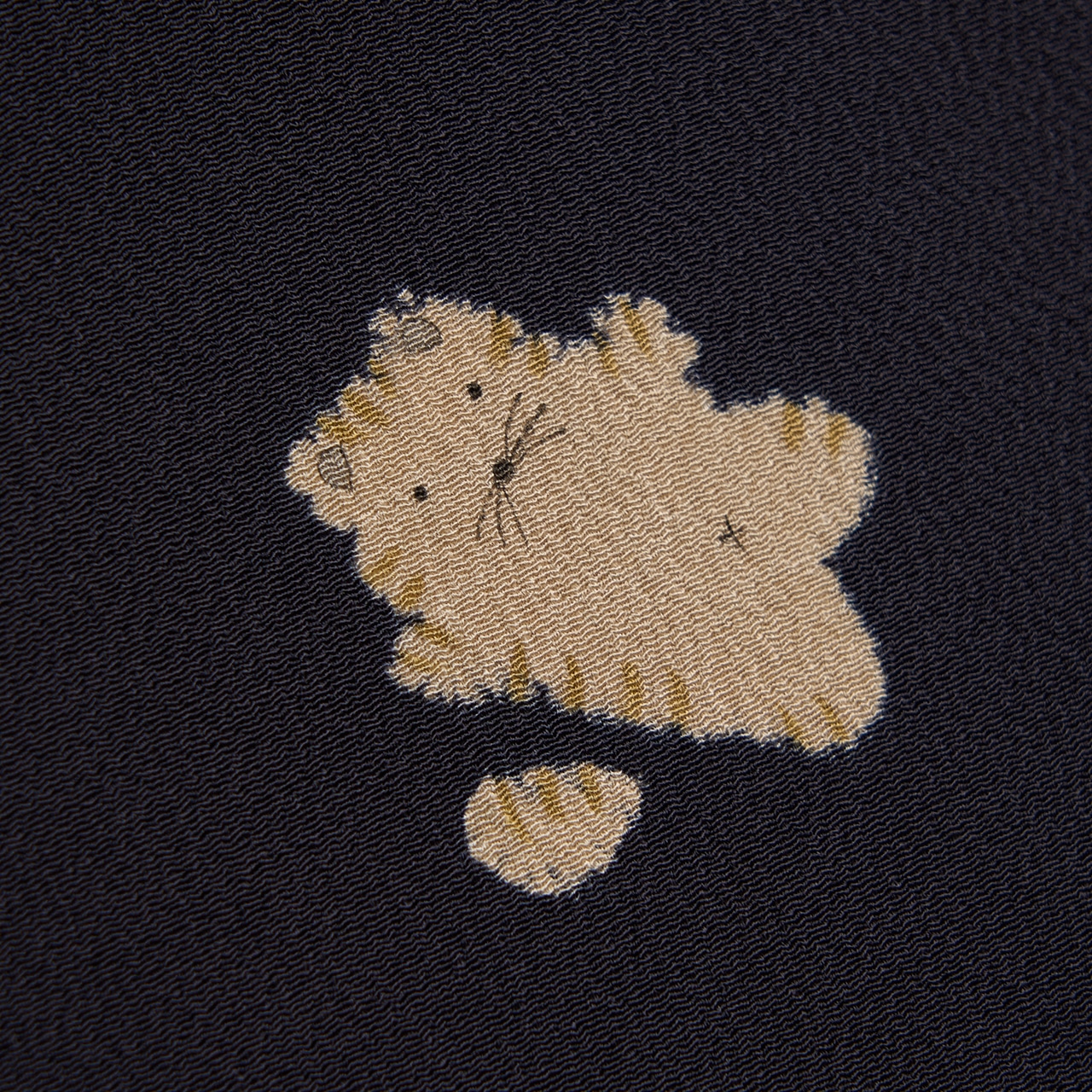 少しだけ藍味の感じられる濃いグレー・藍墨茶色のちりめんの生地に、飛び飛びに小さなキジトラの猫と鈴の模様が絞り染めで染め抜かれた、とてものどかな雰囲気の素敵な小紋のお着物です。