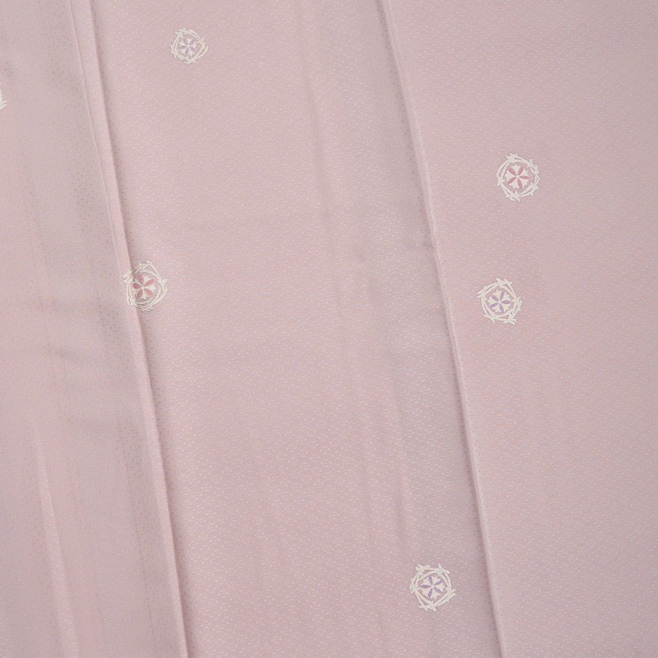 斜め格子に花菱の模様が地模様となって織り出された上質な紋意匠の生地が、淡く明るい薄紫・浅紫色に染められ、飛び飛びに円の形になった松葉の丸紋と、その中に撫子のお花が染め抜かれ、生成り糸と明るい赤紫・紅藤色と銀彩で彩色された、格調の高さのある素敵な小紋のお着物です。