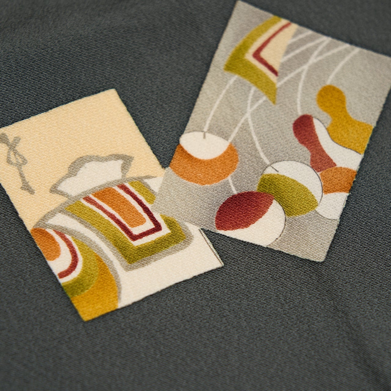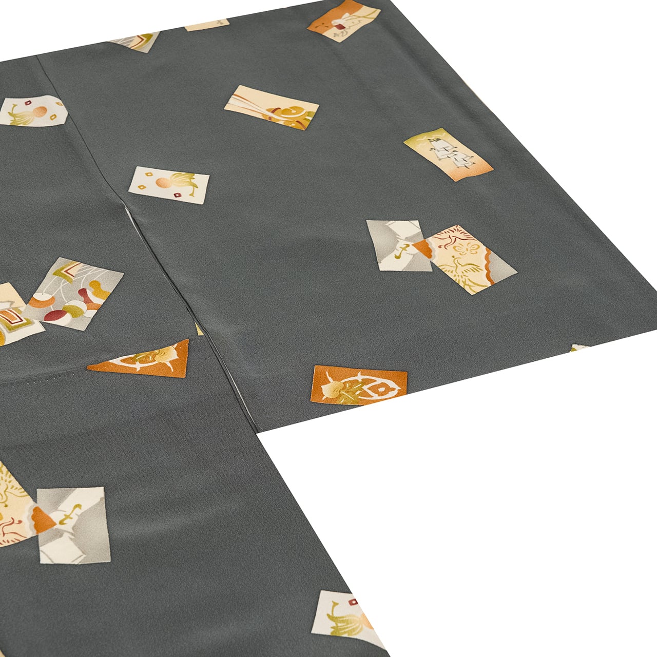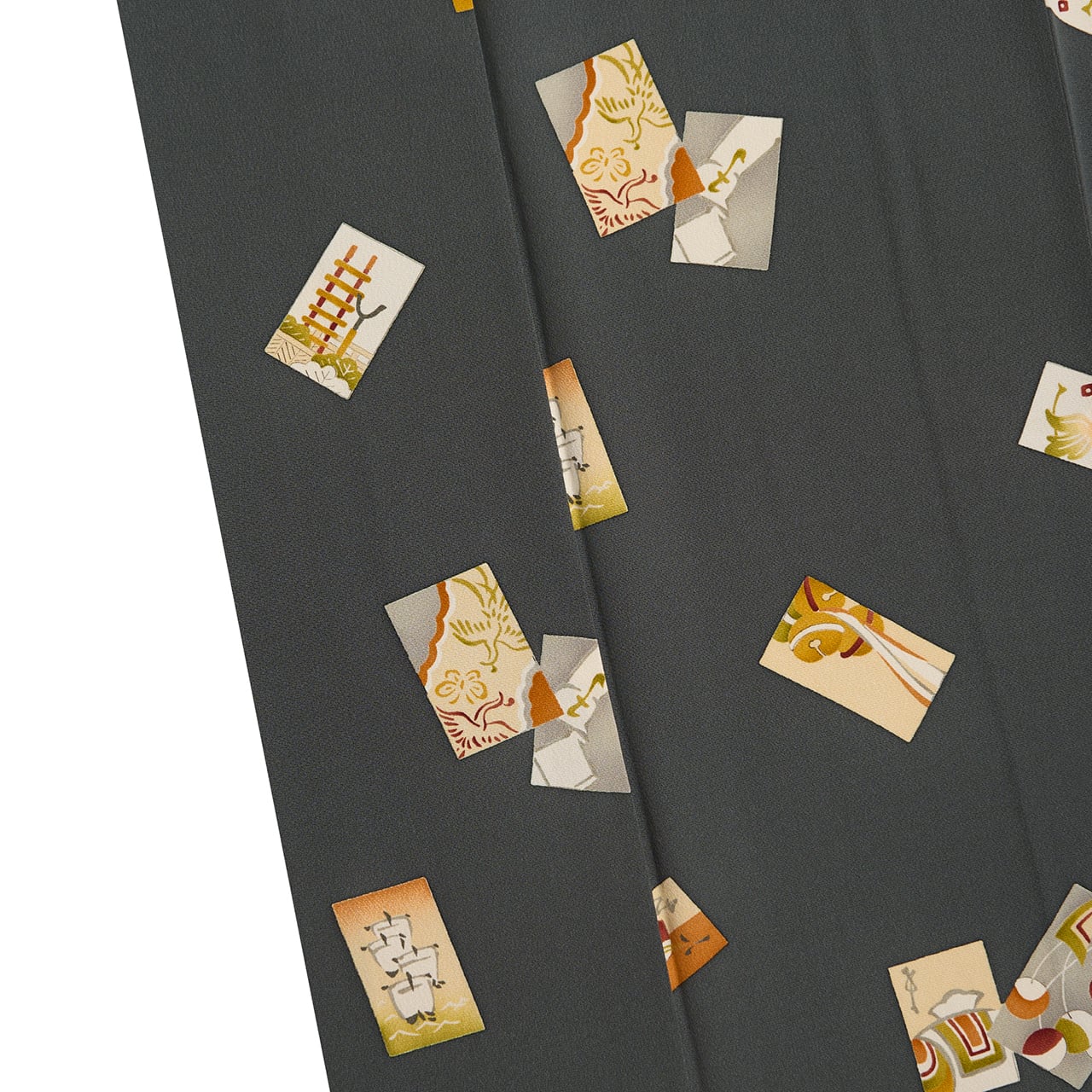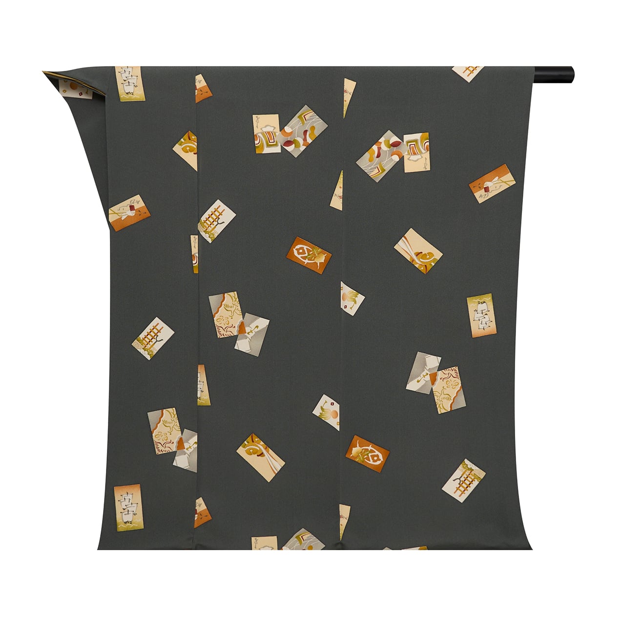 少し前の頃の志ま亀さんならではの、重めの上質な一越ちりめんの生地が濃いグレー・鈍色に染められ、長四角の絵札のようなものに様々な模様が描かれ、それが散らされた独特のセンスのお洒落な小紋のお着物です。