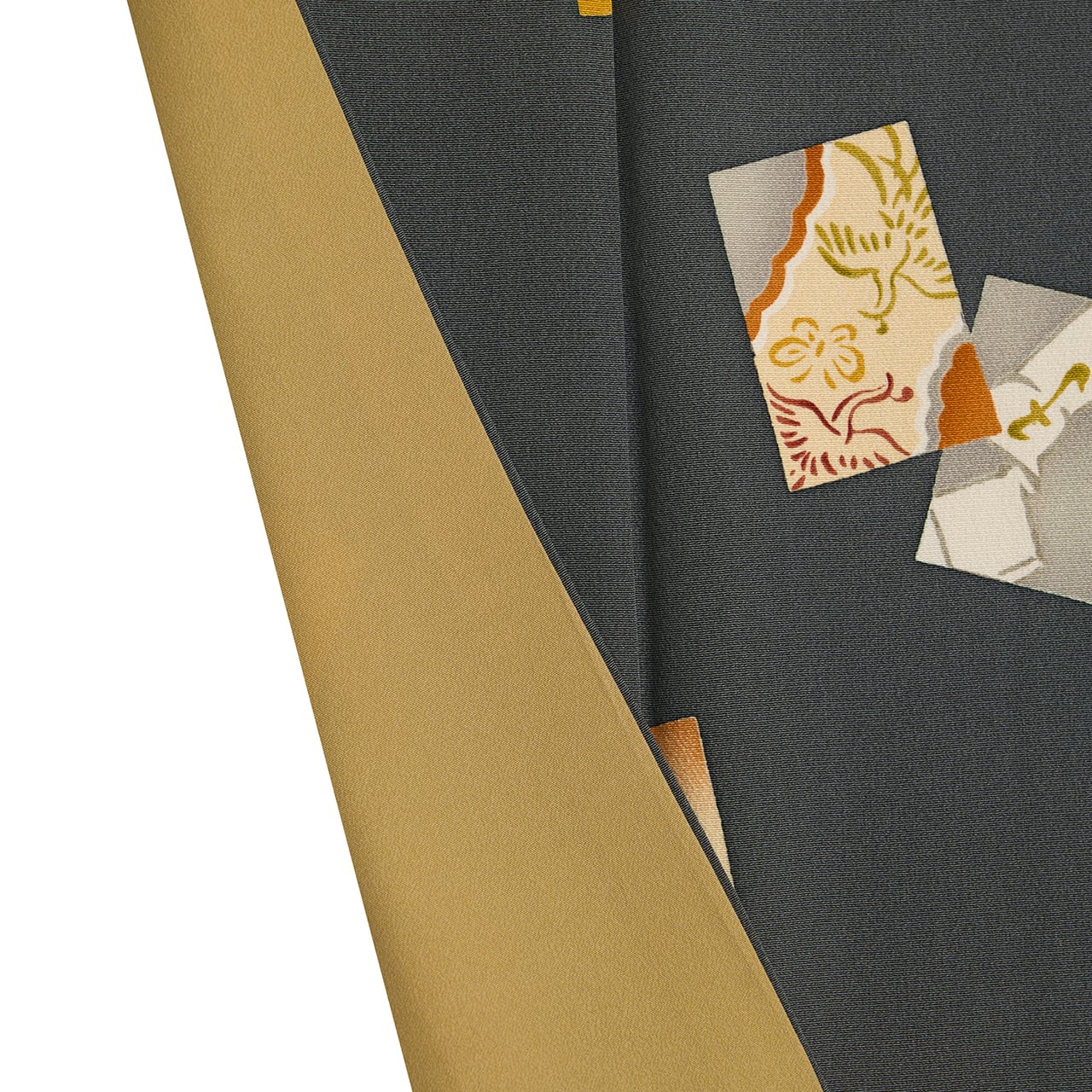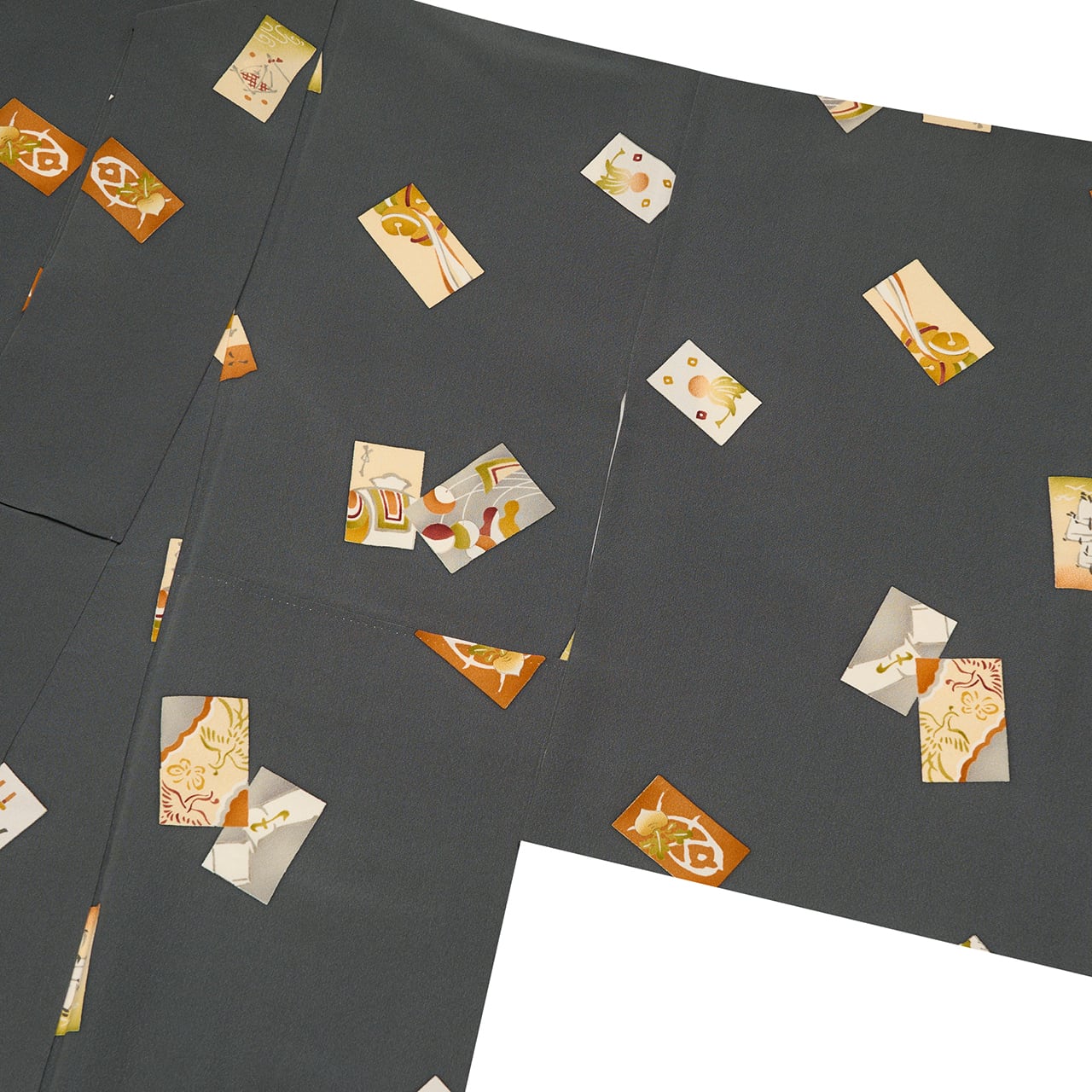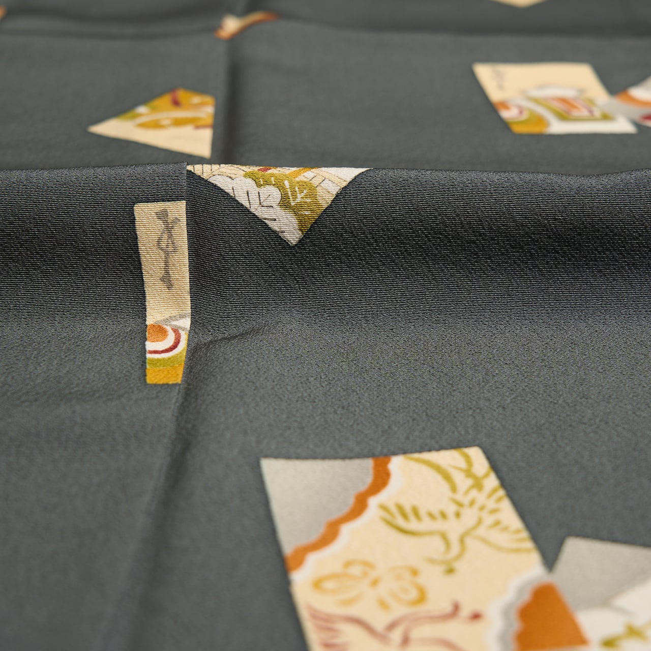 少し前の頃の志ま亀さんならではの、重めの上質な一越ちりめんの生地が濃いグレー・鈍色に染められ、長四角の絵札のようなものに様々な模様が描かれ、それが散らされた独特のセンスのお洒落な小紋のお着物です。