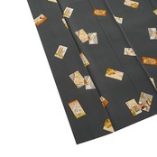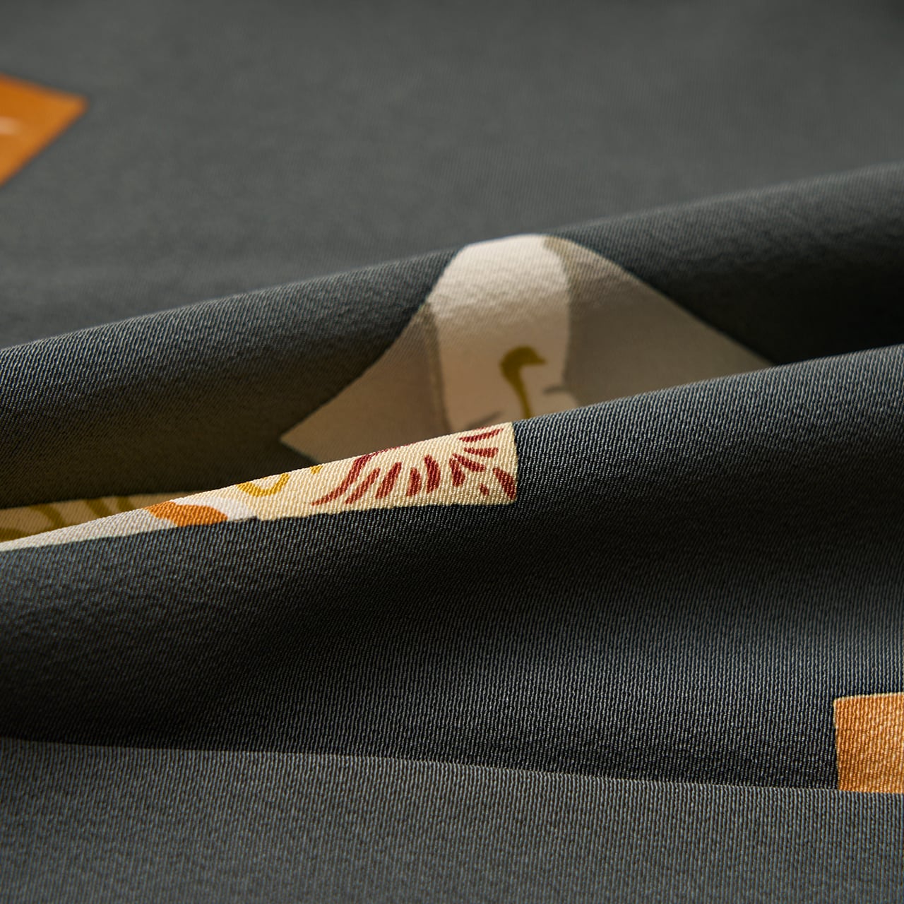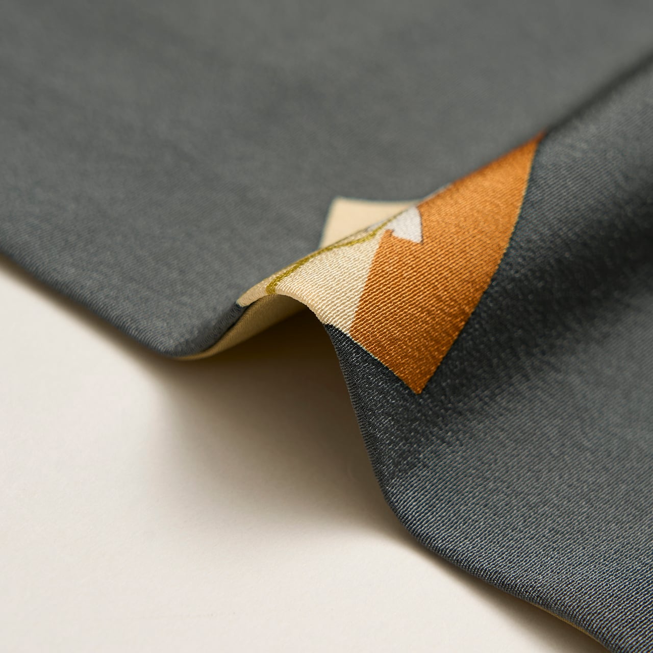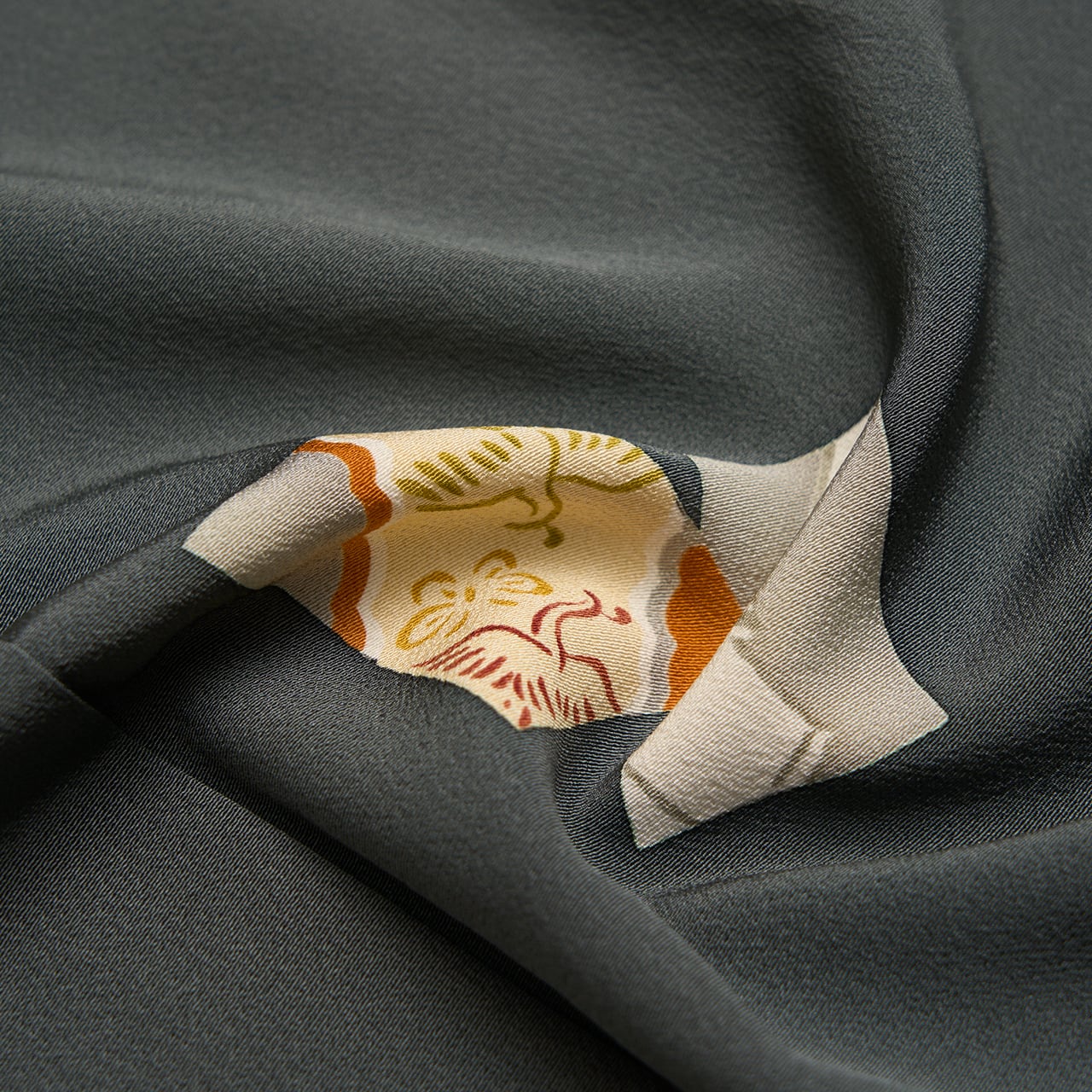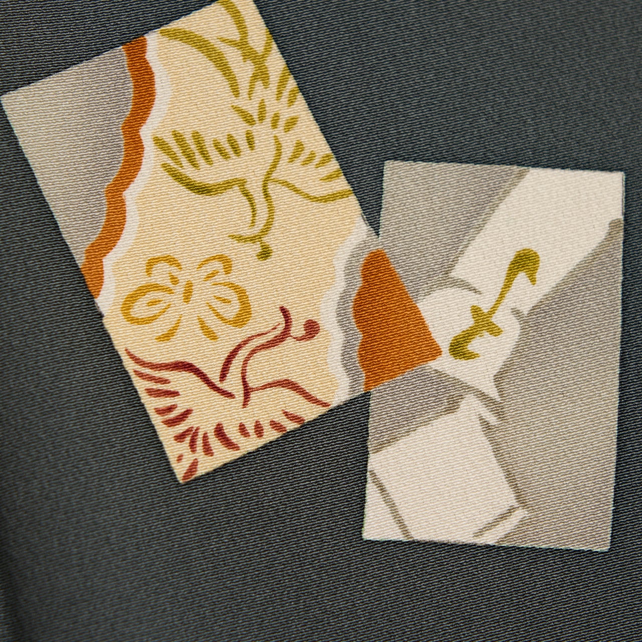 少し前の頃の志ま亀さんならではの、重めの上質な一越ちりめんの生地が濃いグレー・鈍色に染められ、長四角の絵札のようなものに様々な模様が描かれ、それが散らされた独特のセンスのお洒落な小紋のお着物です。