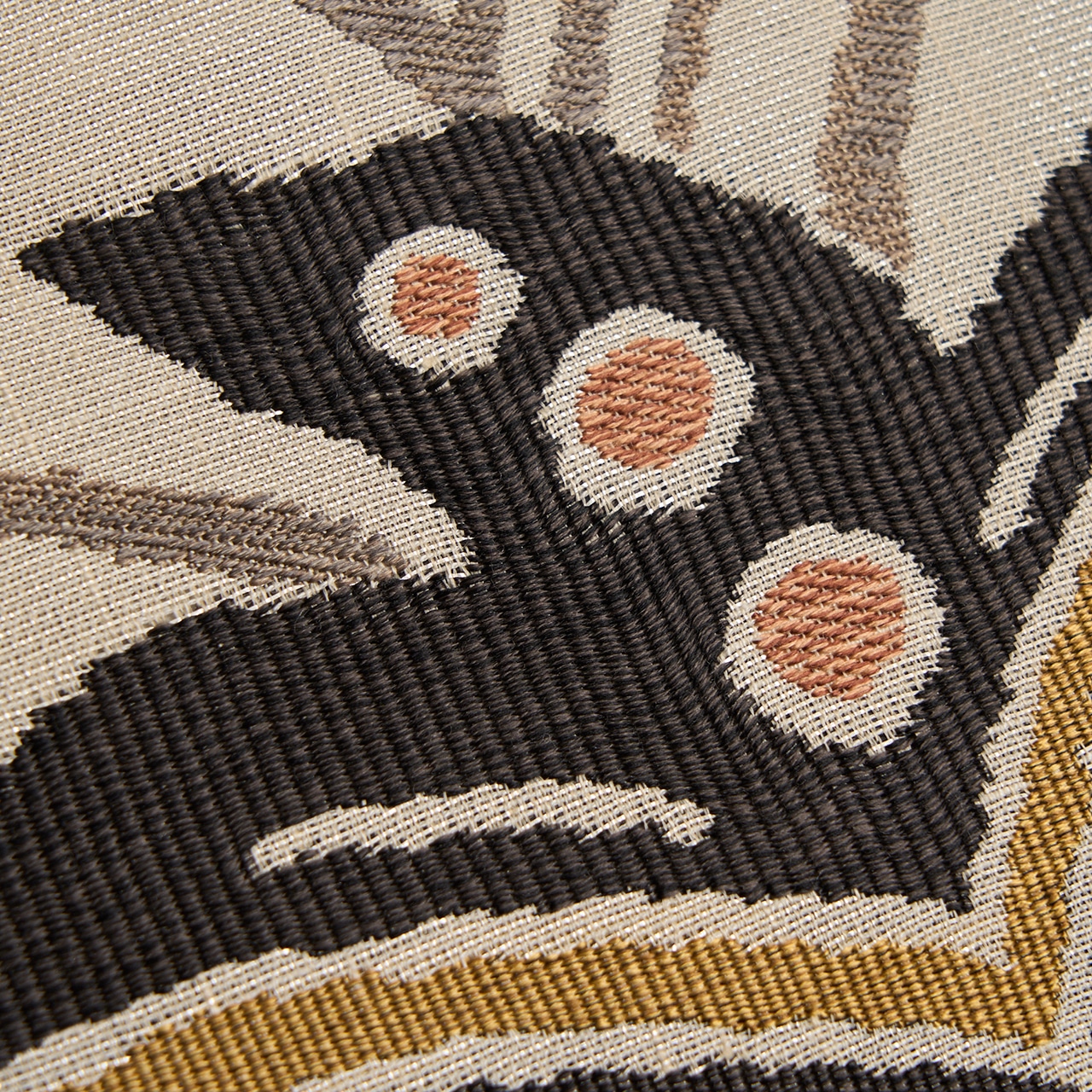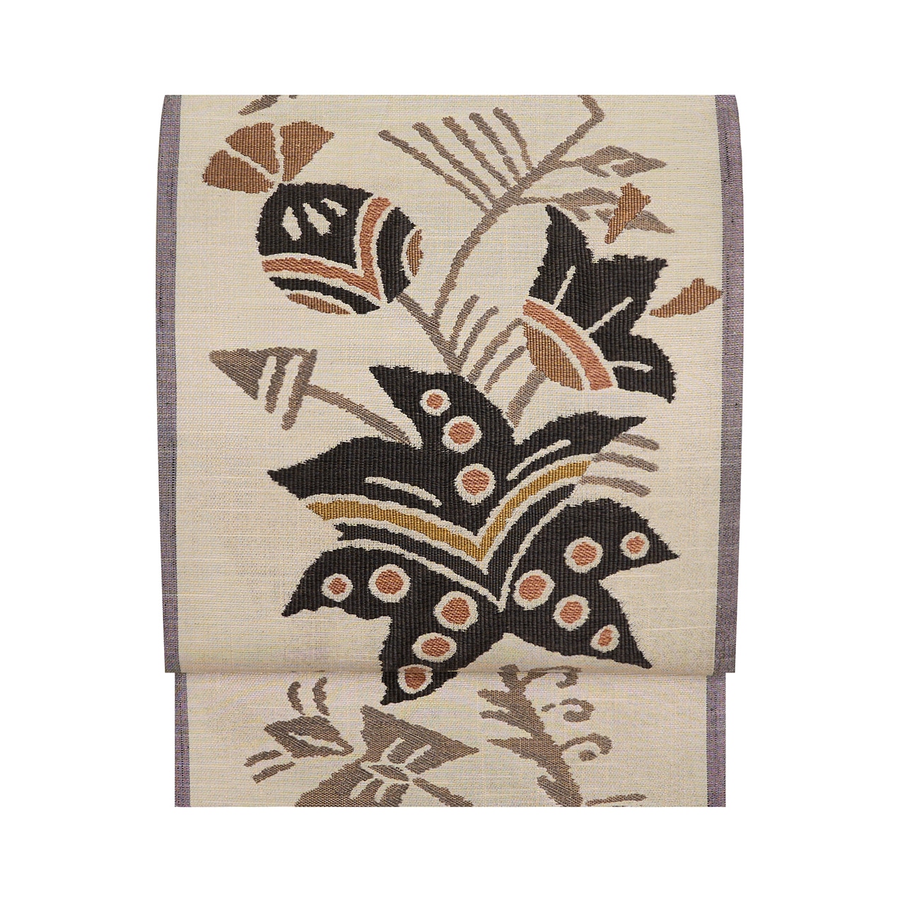 白汚しのような淡いグレー・灰白色に極細の銀糸で地銀通しに織られた地に、大ぶりな唐花の模様が織り出された、大胆かつお洒落なしょうざんさんの袋帯です。