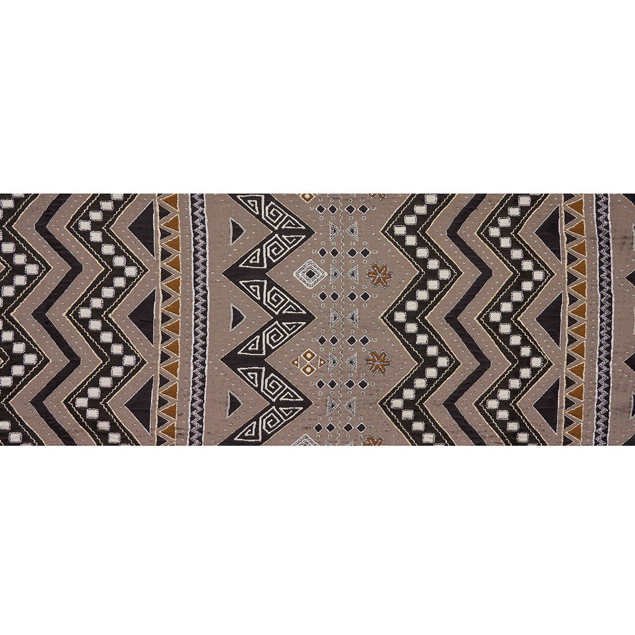 淡いグレー地に黒のジグザグの線などのイメージから、アフリカの染織品のようでもあり、ジグザグの模様の中に生成りの糸で渦巻きのような模様が入れられているところなどはペルーやインカの古い染織品のようでもあり、いずれにしても古い染織品にインスパイアされたものと思われます。