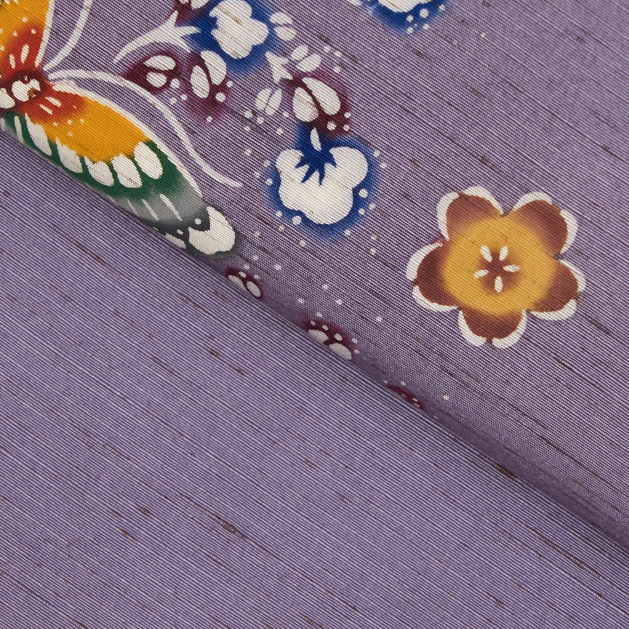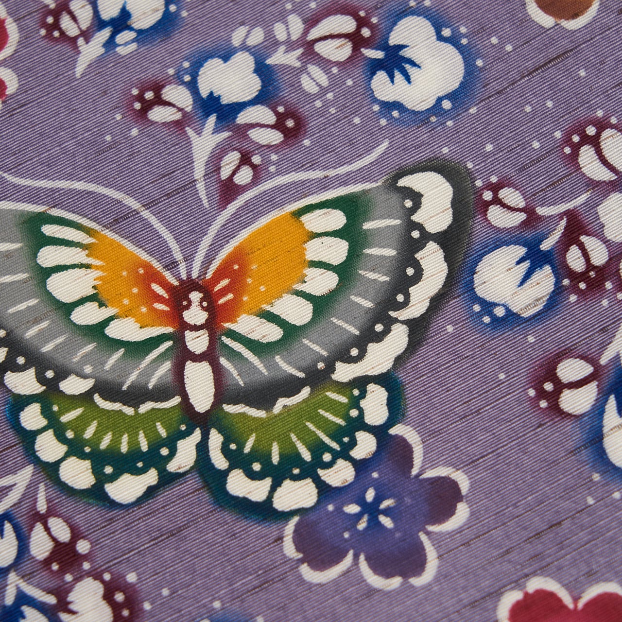 いろいろなお着物とも馴染みの良い地色の菫色にお花と蝶々が綺麗に映えて、着こなしのアクセントとなってくれそうです。