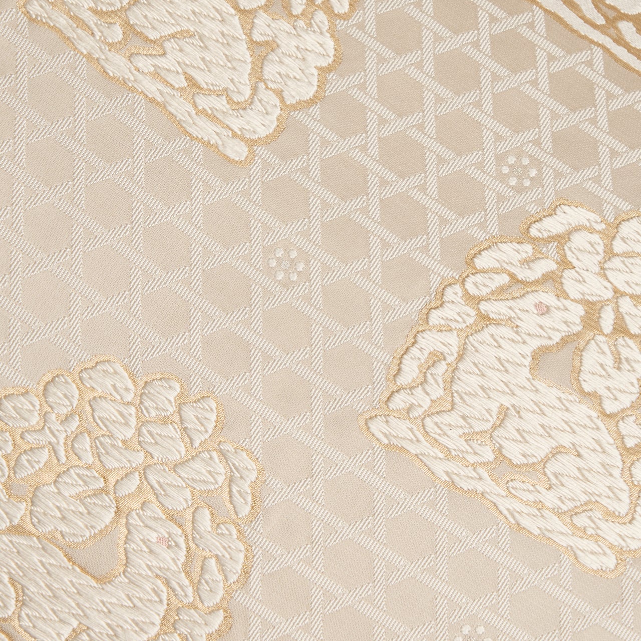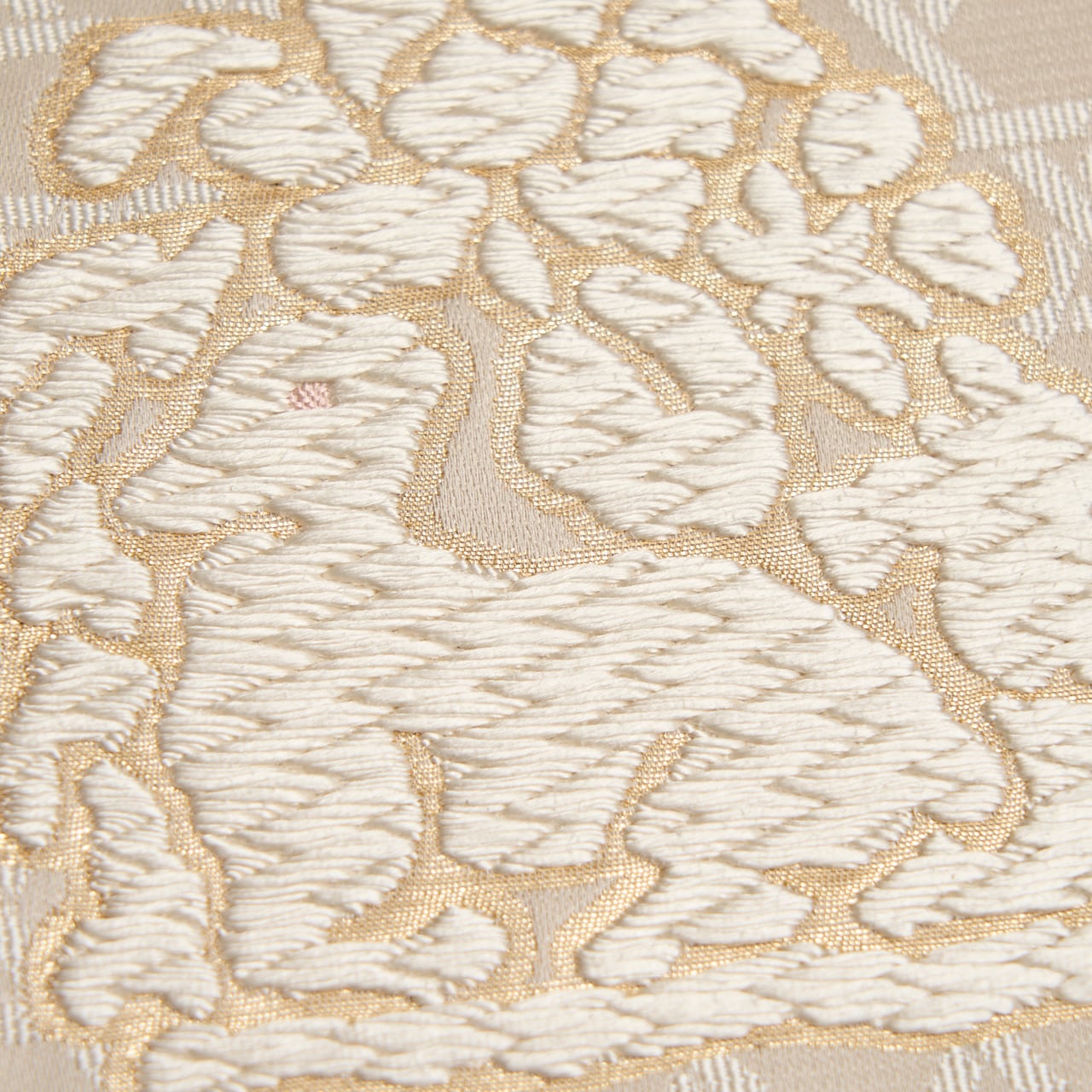 白汚しのような淡いグレーベージュ・灰白色の地に、同色の糸で細かい籠目模様が織り出され、大きめの花うさぎの模様が錦織と唐織で表されて、あまり光らない金糸で縁取りをされた、色合い的にも織楽浅野さんらしさのある、気品の感じられる素敵な袋帯です。