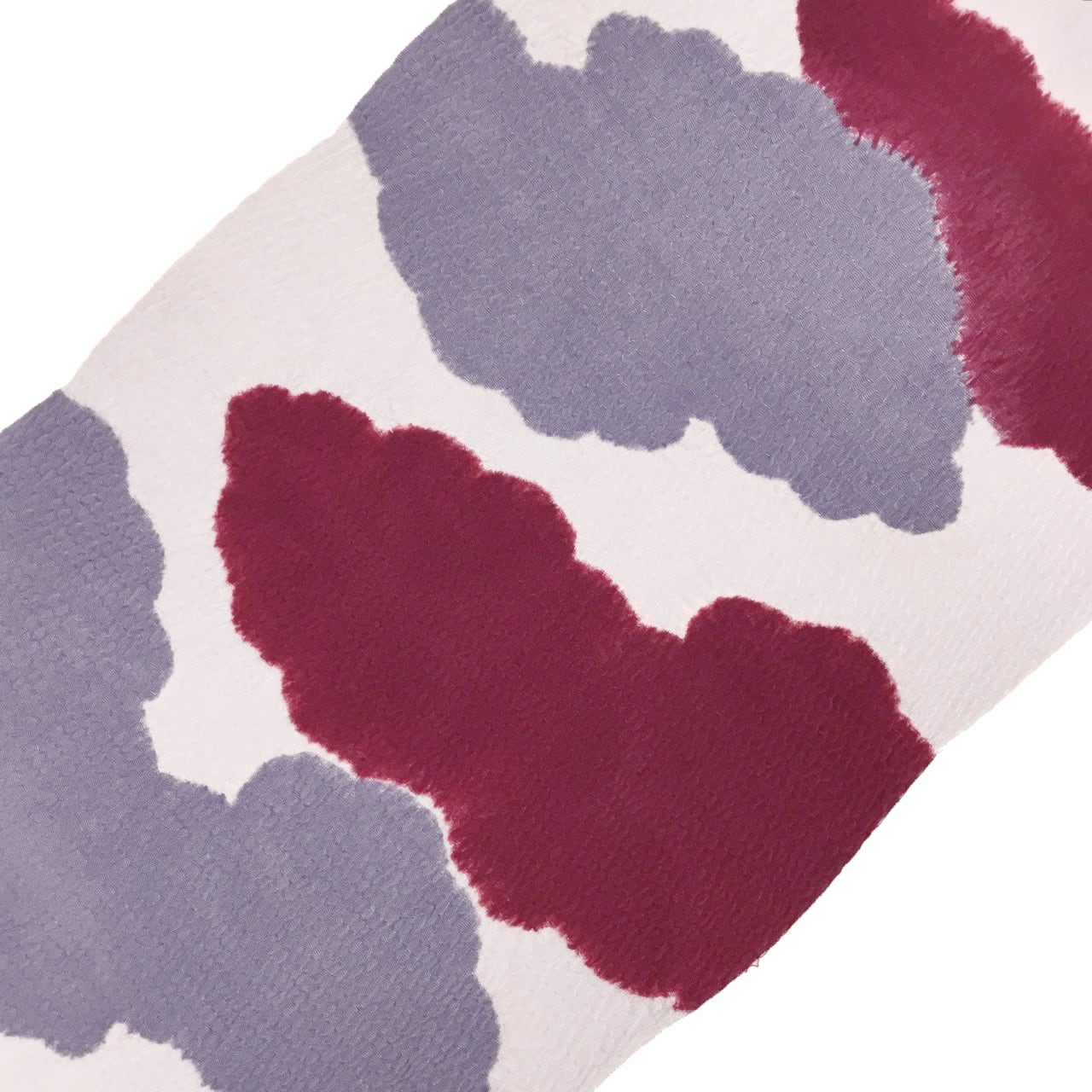 素色に葡萄色と薄鼠色が雲取り絞りで染められています。