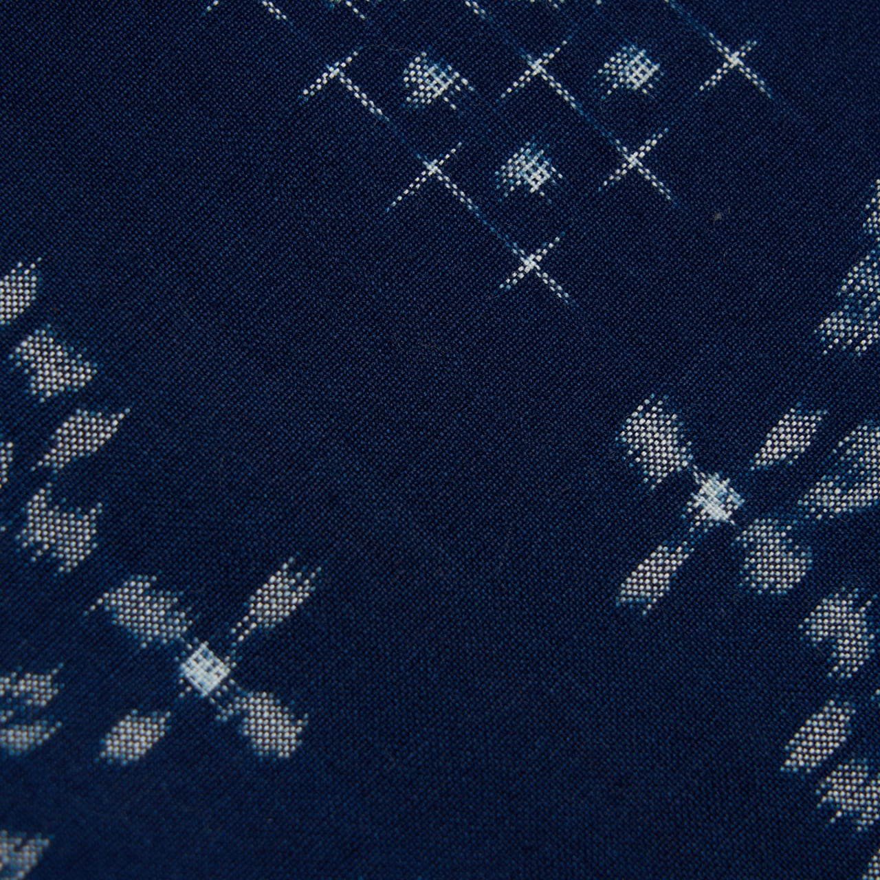 濃い藍色の地に、小さなお花がジグザグの形に置かれて並んだ模様が手括りの絣で織り出された、手織ならではのシャキッとしていながらも心地よく、しなやかで手触りの良い風合いの、とてもお洒落な雰囲気の木綿の単衣のお着物です。
