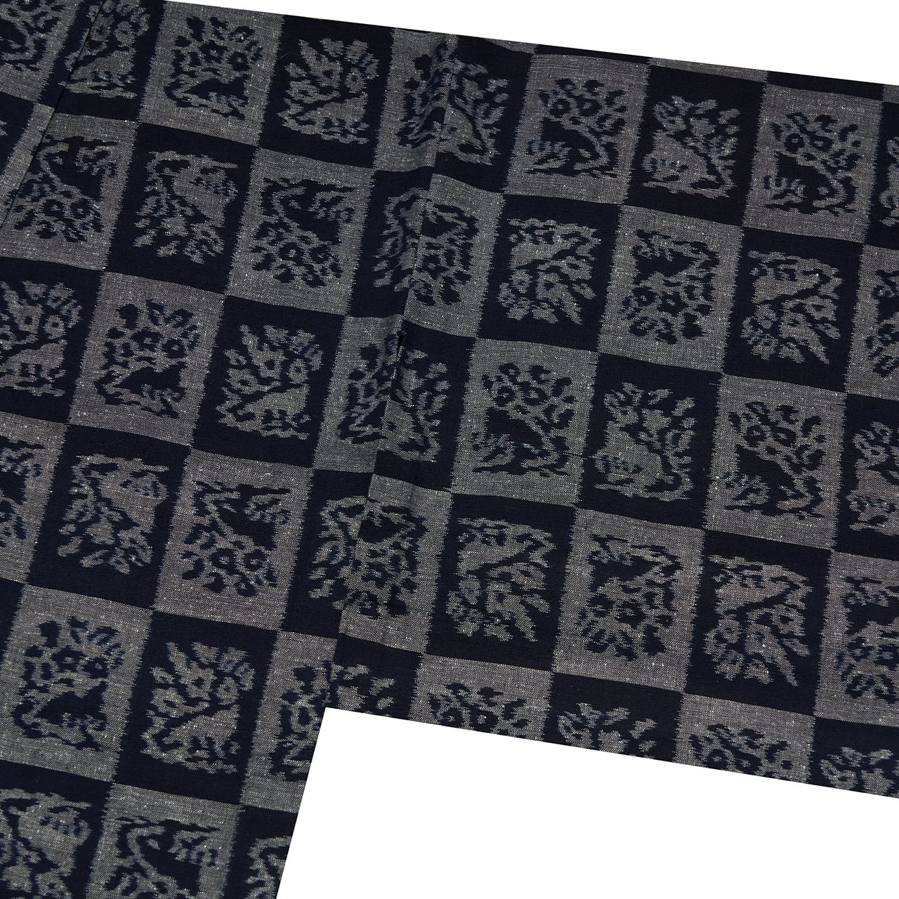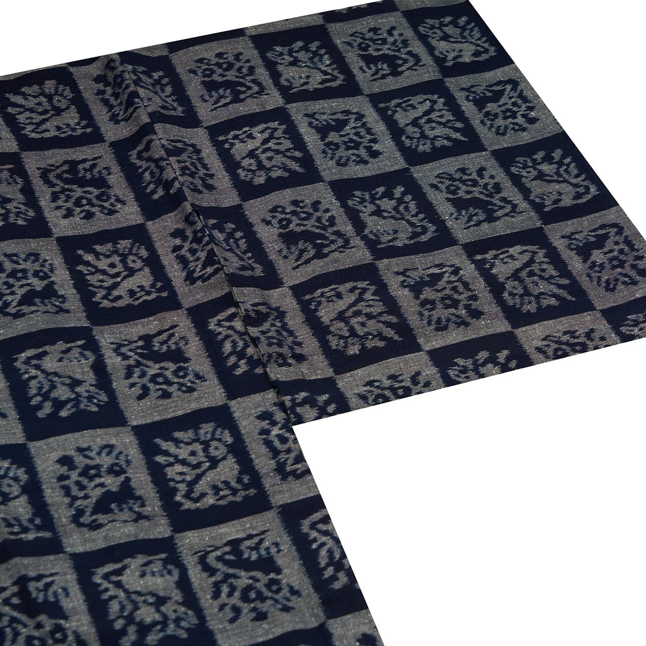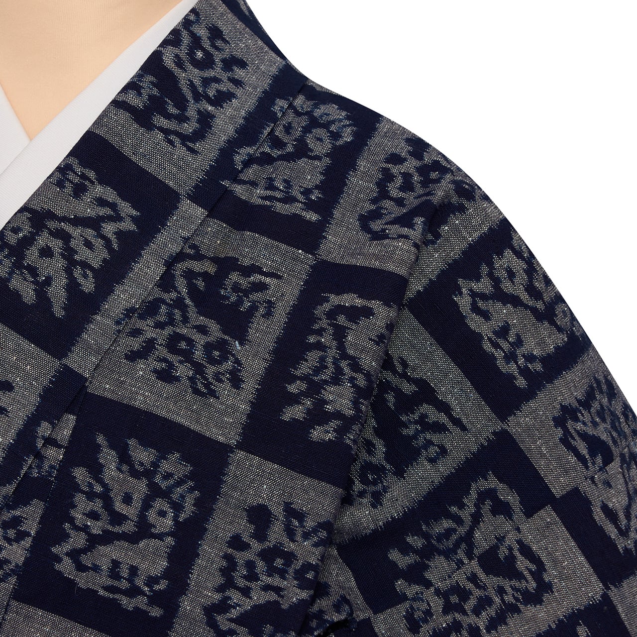 ざっくりとした風合いの良い生地の絣のお着物ですが、本藍で染められた糸をベースに市松がとられ、グレーに藍色と、藍色にグレーの花うさぎの絣の模様が交互に織り出されて、手織りの風合いが味わい深いものとなっています。