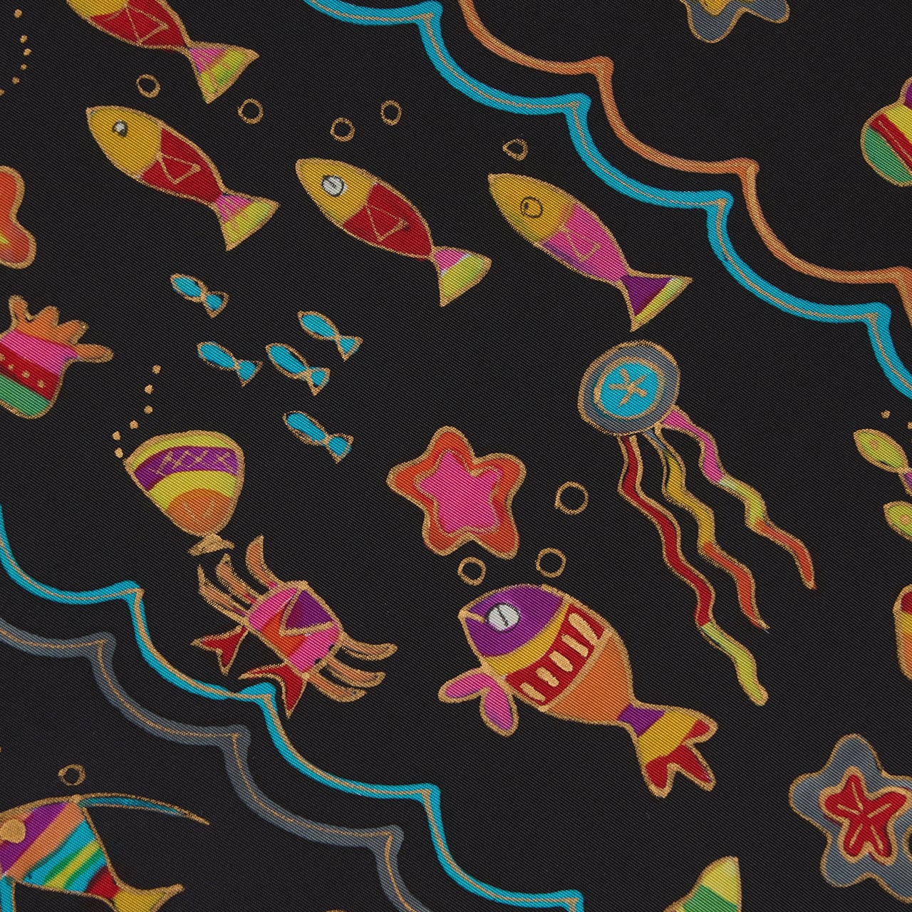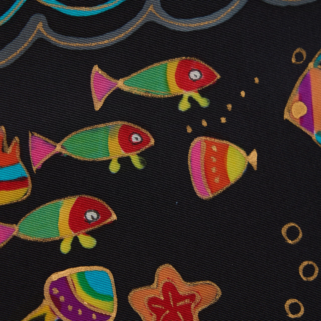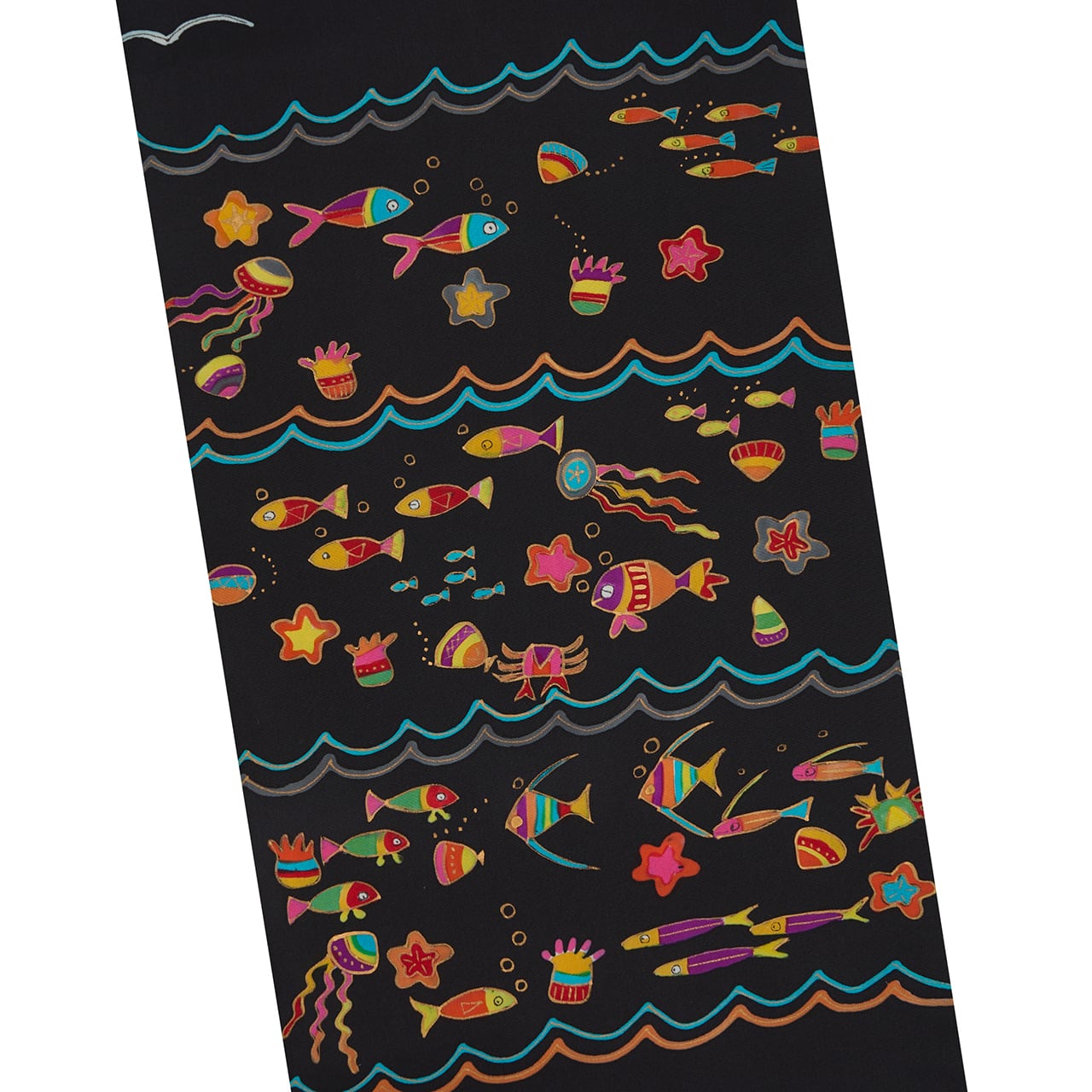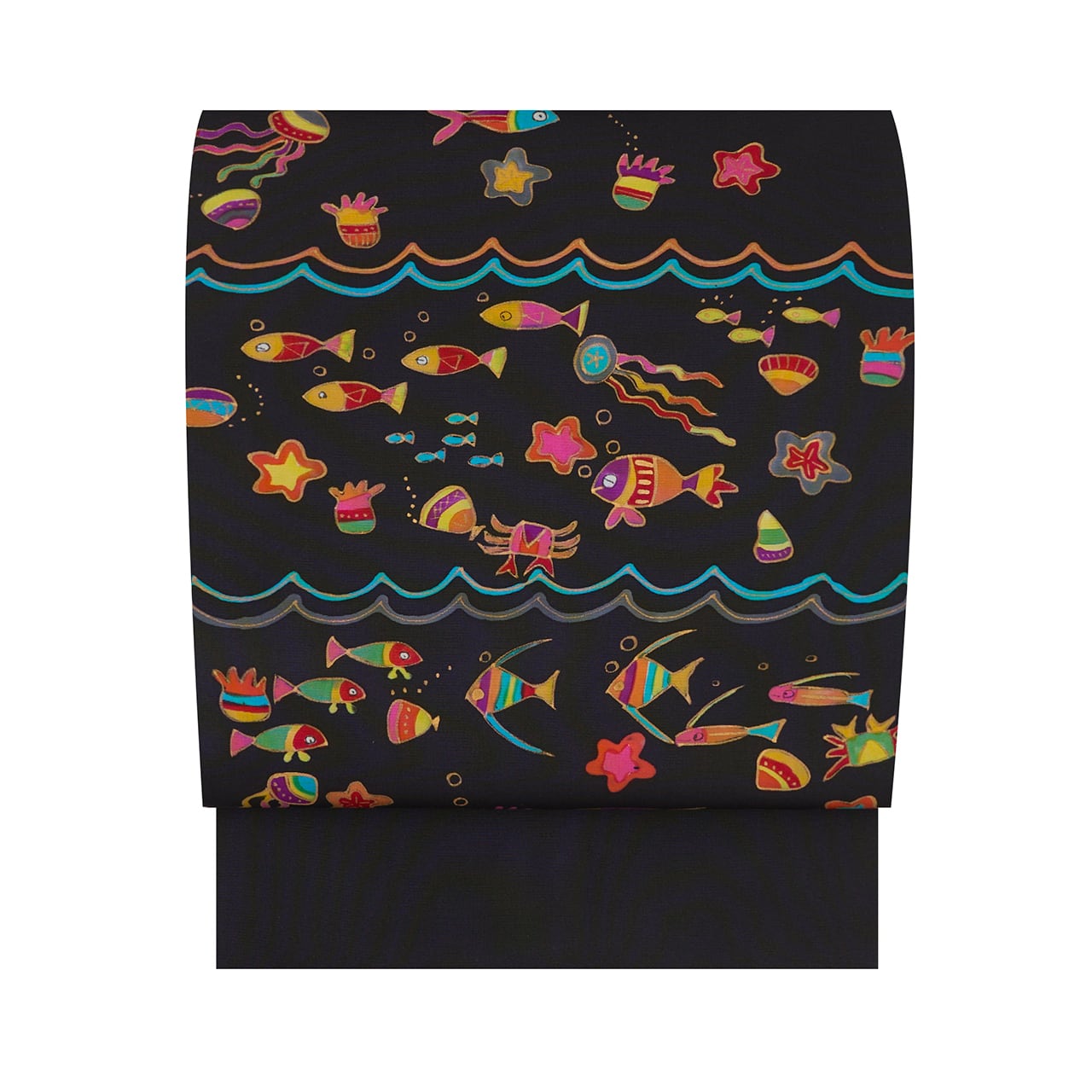 しなやかな質感の黒の塩瀬の生地に、スカラップのような波の模様が描かれ、その海の中でいろいろな形の大小のお魚、クラゲや貝にイソギンチャク、ヒトデ、そしてカニなどが楽しく暮らしているような模様がカラフルな色彩で手描きされた、山本由季さんならではのポップでアート的な雰囲気がとてもお洒落な九寸名古屋帯です。