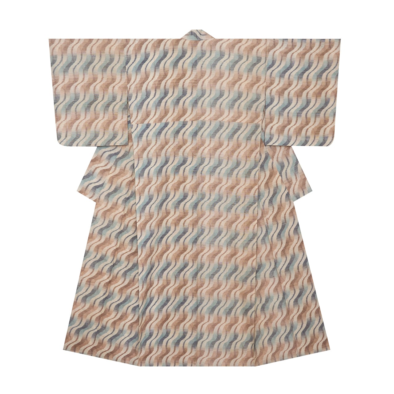 シャキッとした上質な手触りの象牙色の紬地に、斜めに流れるような縞の模様が、銀煤竹色の濃い目の茶とそれを薄くした茶・柴染色の濃淡の組み合わせと、褐色の紺色と浅縹色の水色の濃淡の組み合わせの絣で全体に織り出された、見応えのある大作ともいえる平山八重子さんの作品です。