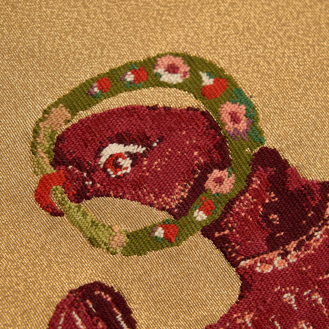 他では見られない個性的なモチーフと構図、地金となった綴れ織の豪華さ、そして重厚感。