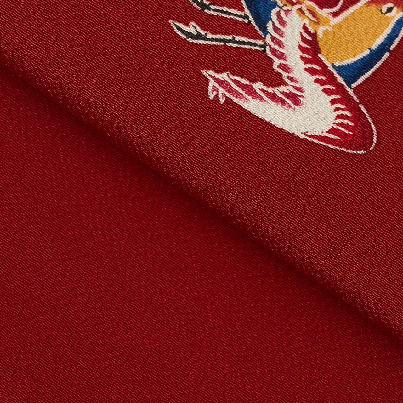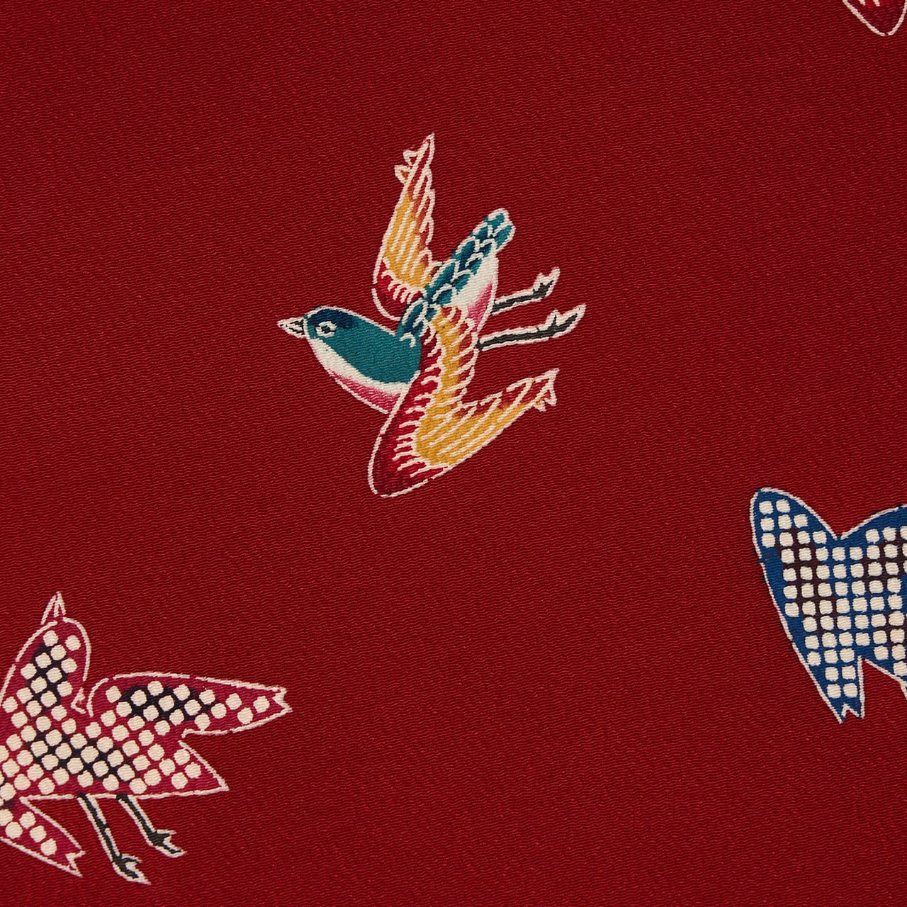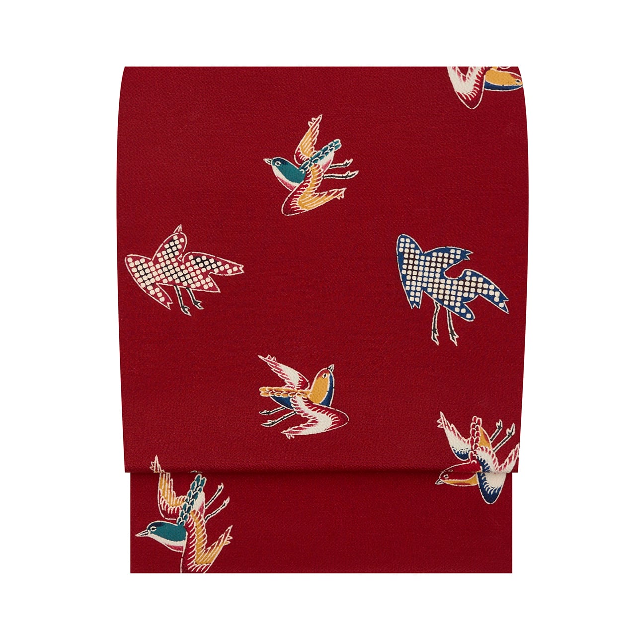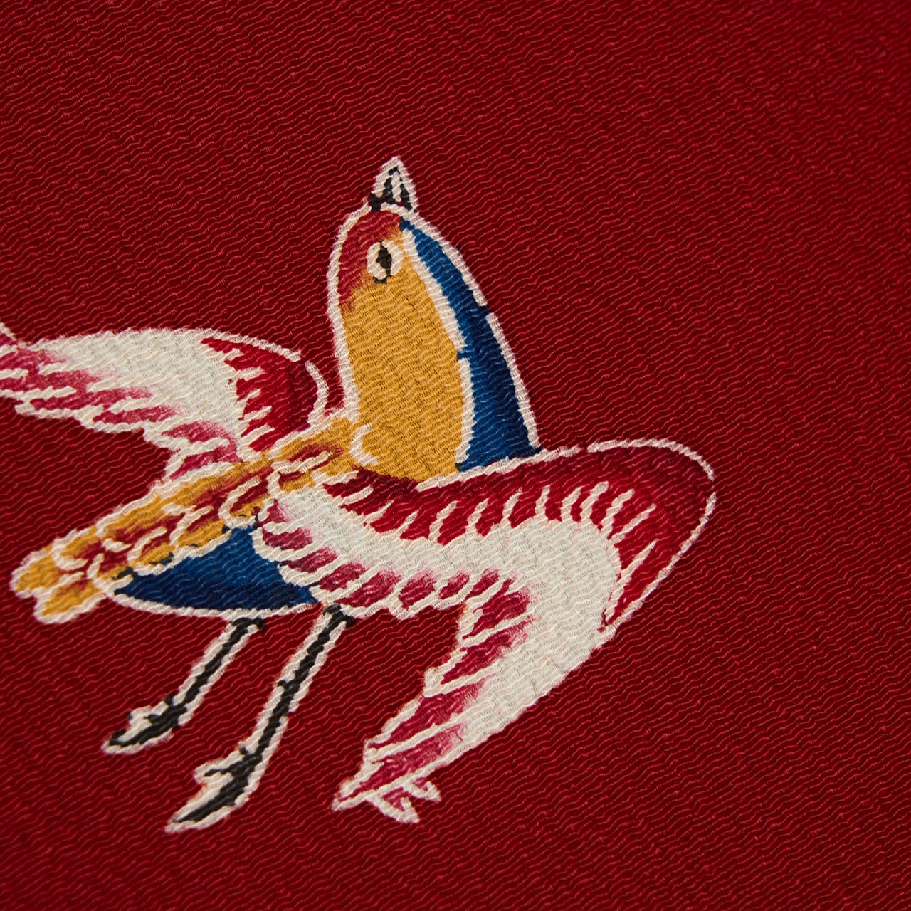 少しシボのあるちりめん地がこっくりとした濃い赤・葡萄色に染められ、そこに群れを成して飛ぶ千鳥の姿が綺麗な色合いで描かれたものと、シルエットのように疋田模様で描かれたものがあり、東京友禅ならではのメリハリがあり、躍動感のある模様となった素敵な九寸名古屋帯です。