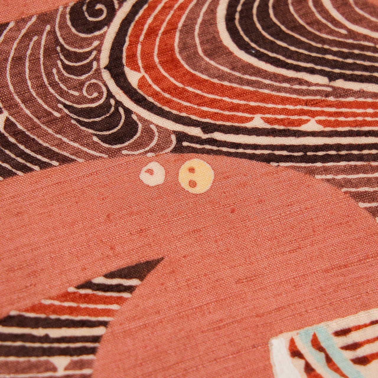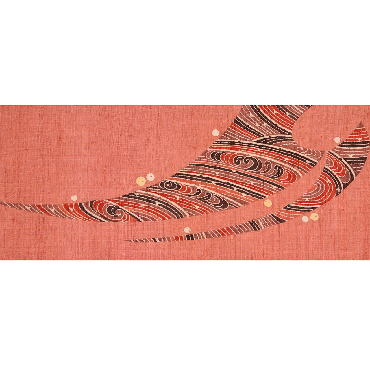 ご自身で編み出された硬めの糊を自在に駆使して力強い線を描かれることや、こちらの作品のように蘇芳香色など同系色の濃淡を巧みに使いこなされて、独特の世界観を表現されていることも特徴です。