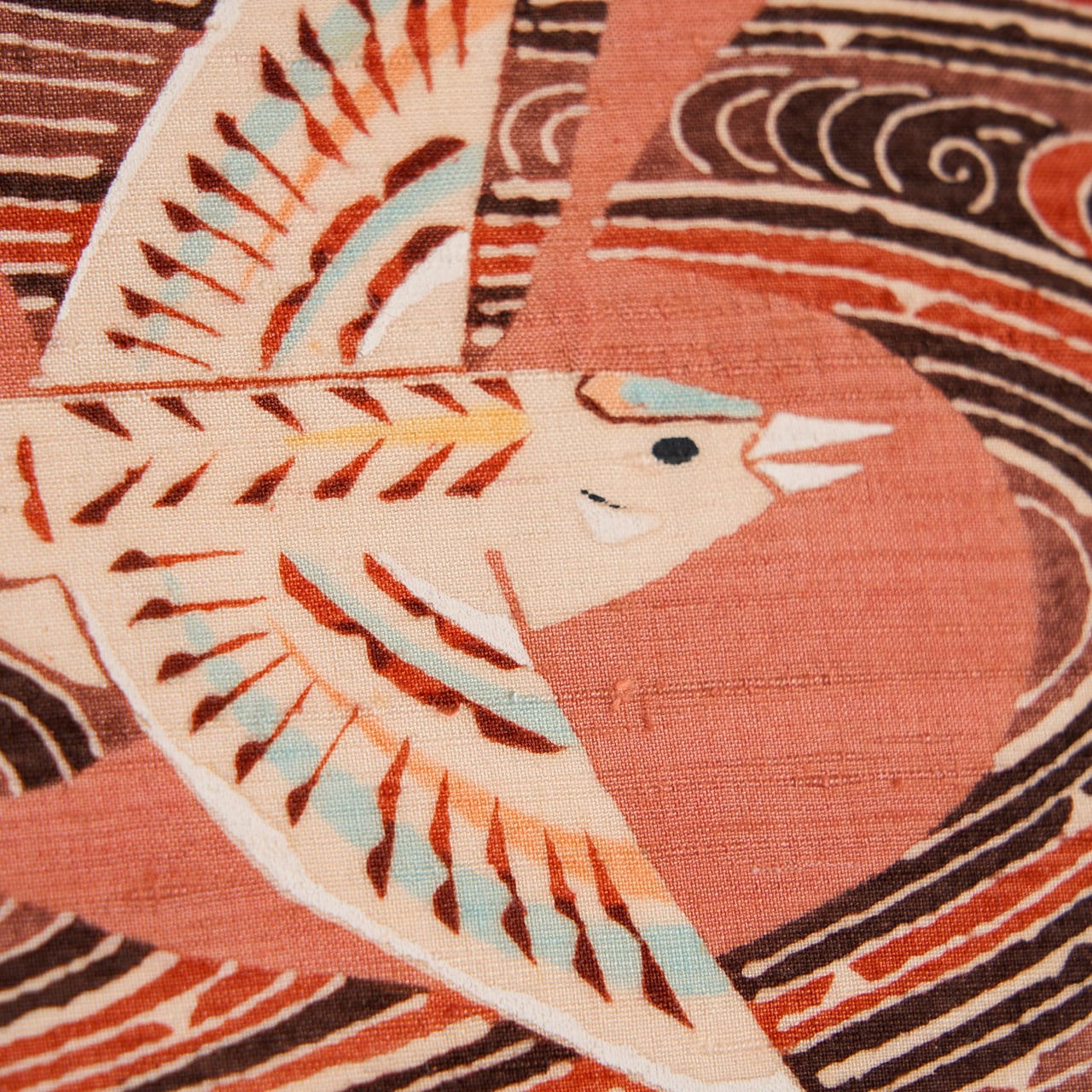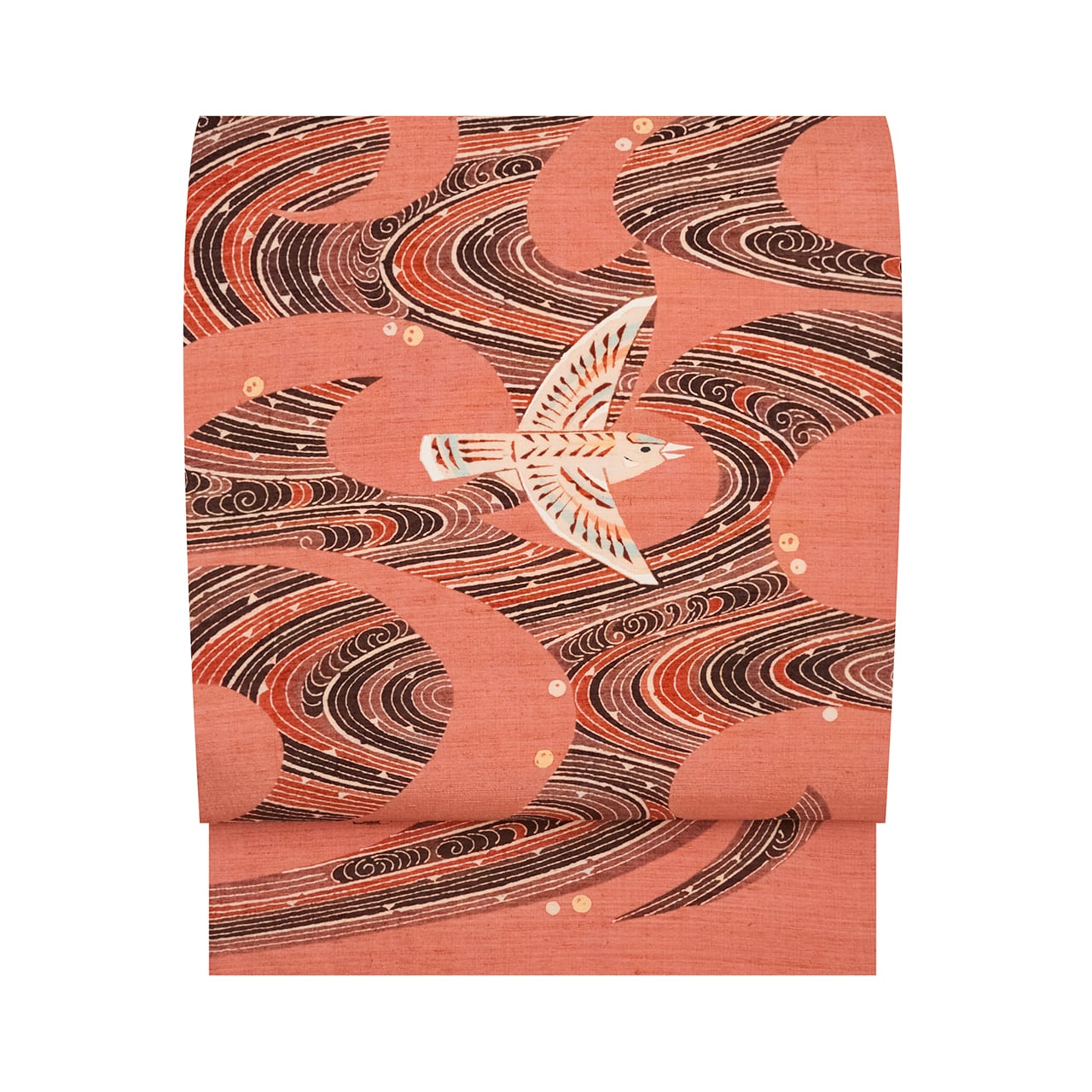 こちらは、潮の満ち引きを描かれた網干風景などの代表作にも見られる、海辺の風景の流れが感じられるような、干潟の波の上を飛ぶ千鳥の姿が美しく描かれた九寸名古屋帯の作品です。