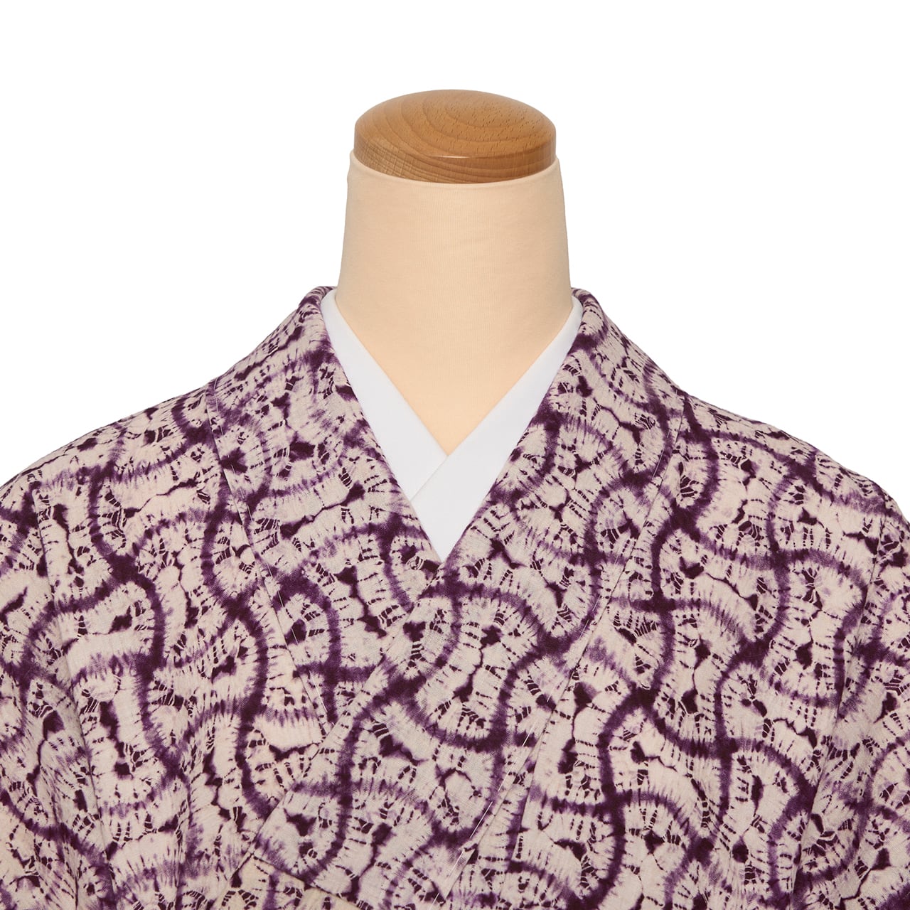 年数を重ねるほどに深い色合いになる紫根染めならではのこっくりとした色に、白が映えて、すっきりとした素敵なお着物となっています。