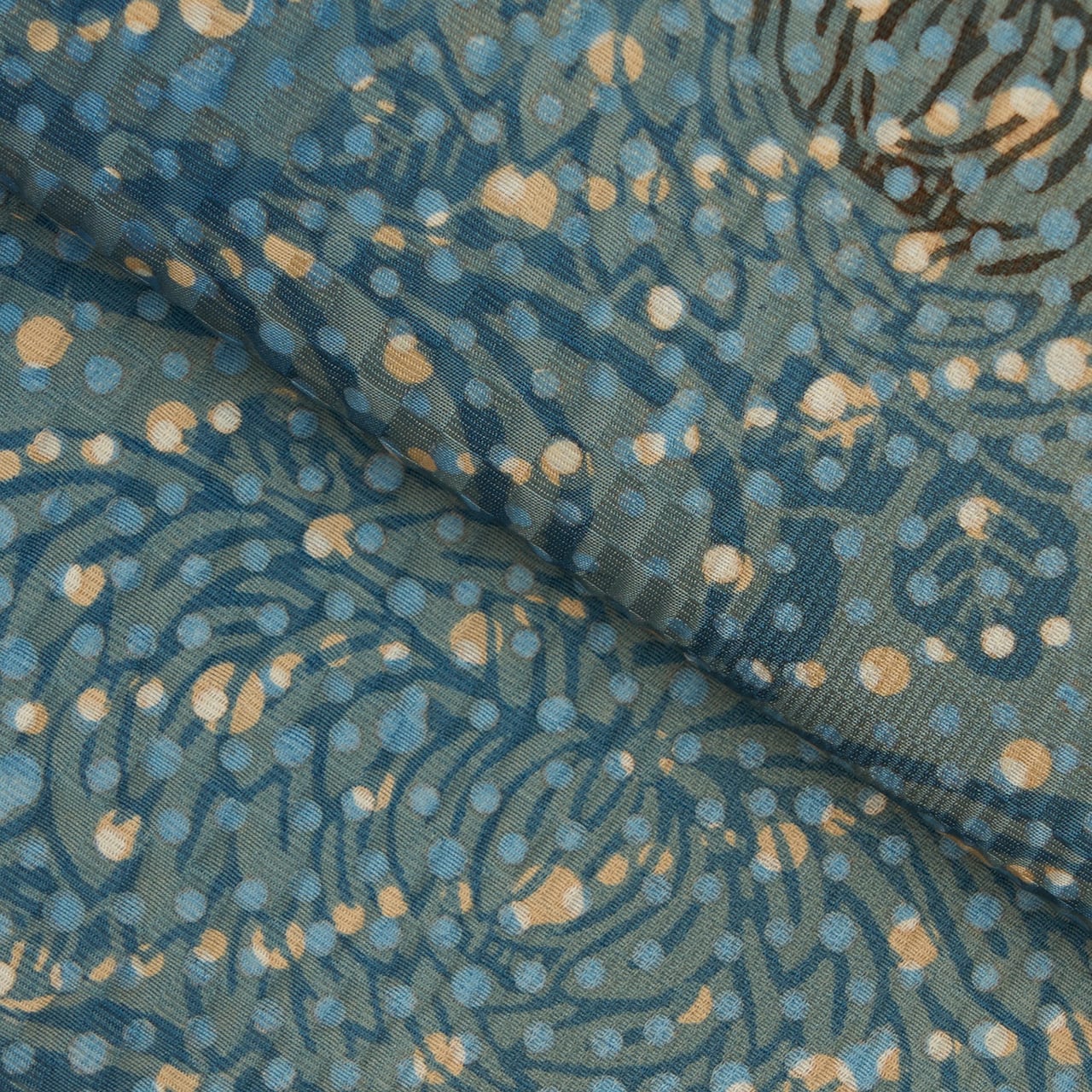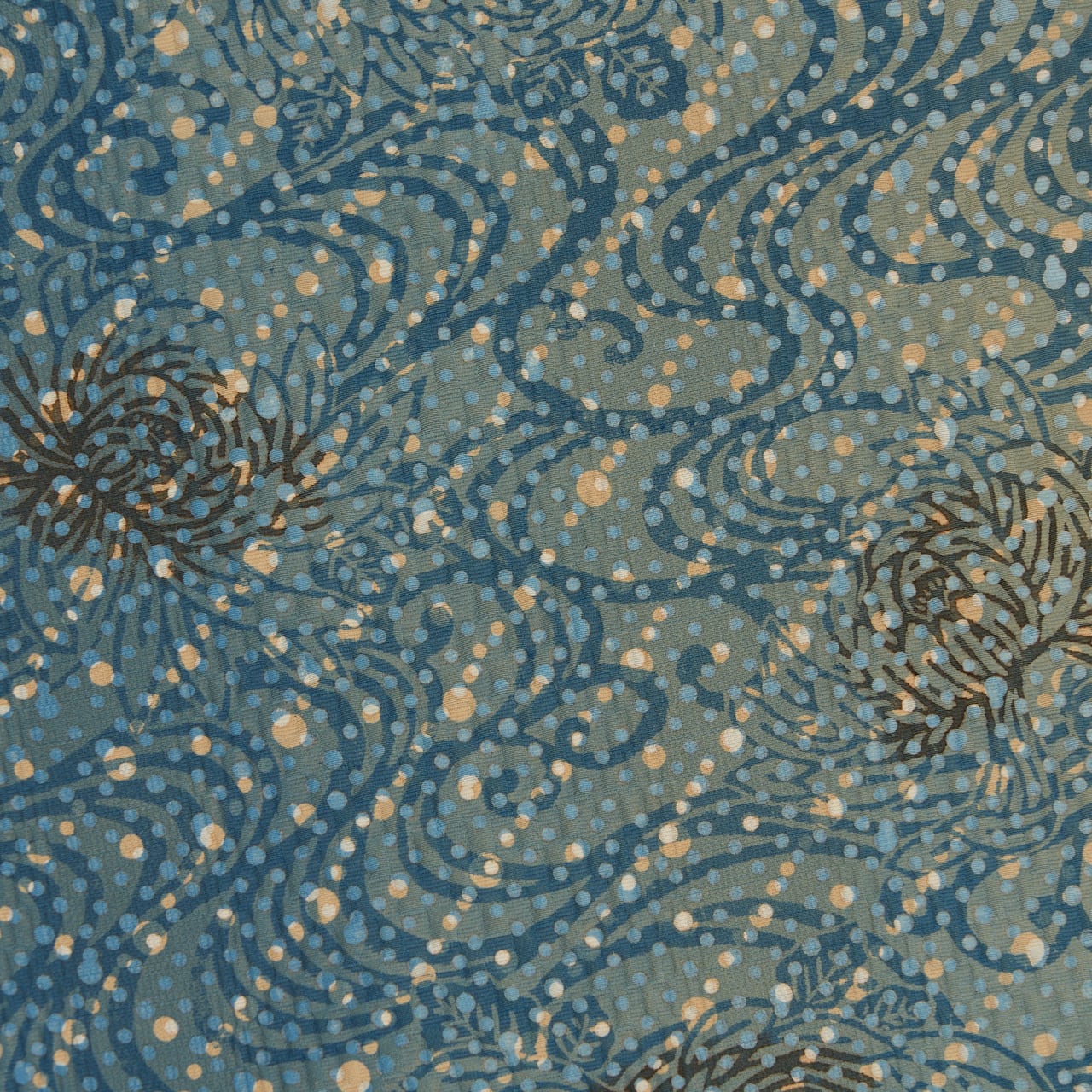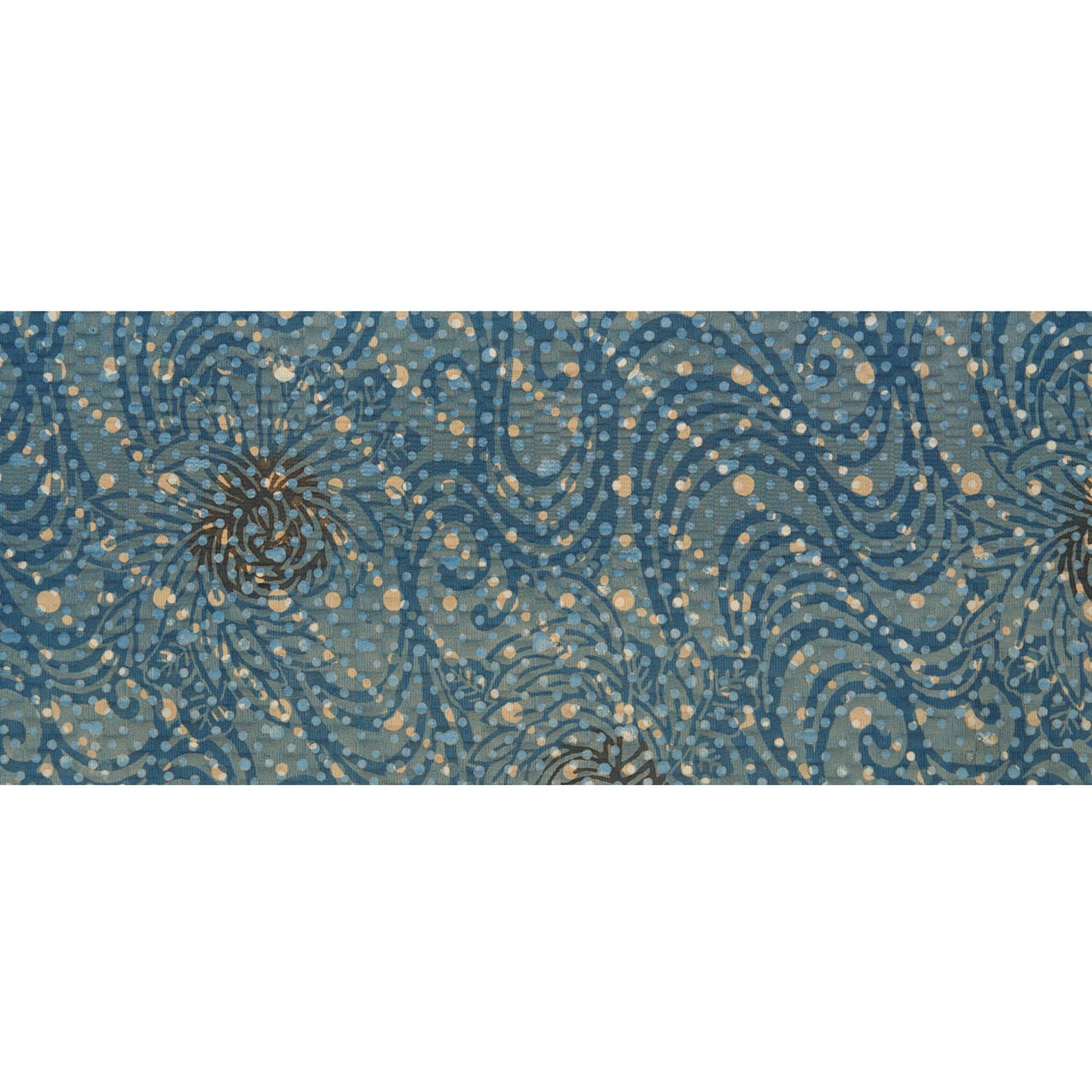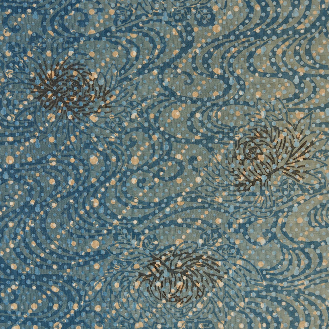 静けさが感じられるような菊水の模様と、それを横切るように斜めに染め抜かれた白い水玉の存在とのコントラストの妙味は、長板中形染めならではの表現のように思われます。