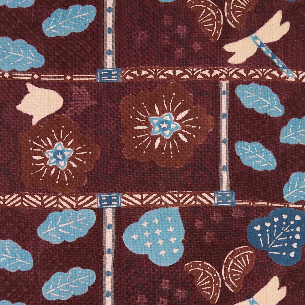 縦に少し節があるざっくりとした紬地が、ログウッドで赤味のある焦げ茶・黒鳶色に染められ、大きく四角いブロックで区切られて花壇のように分かれたところに、芙蓉のような大きなお花とカスミソウのような小さなお花が描かれ、白い羽を広げたトンボが飛んでいる、のどかな風景が型絵染で染められた荒川眞理子さんの素敵な九寸名古屋帯の作品です。