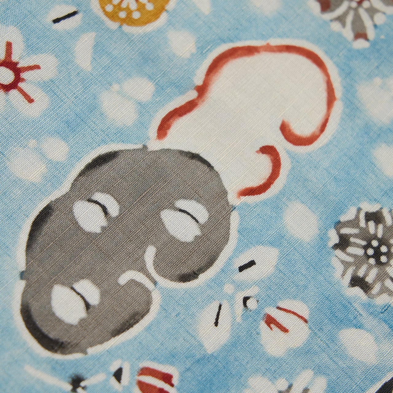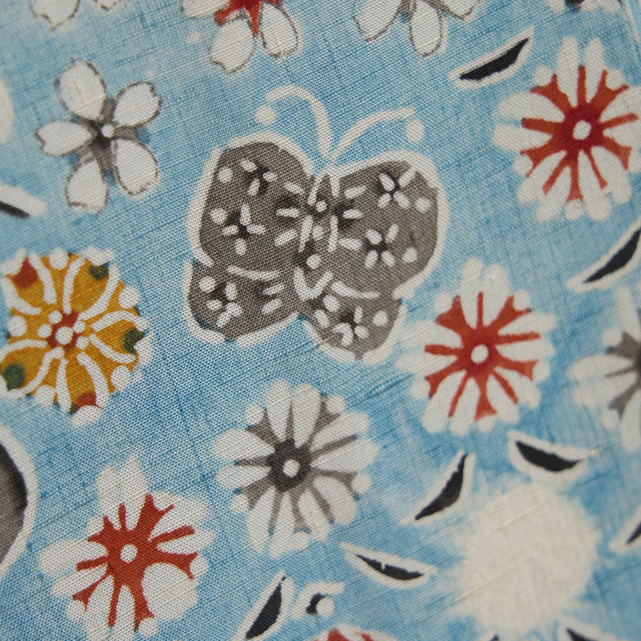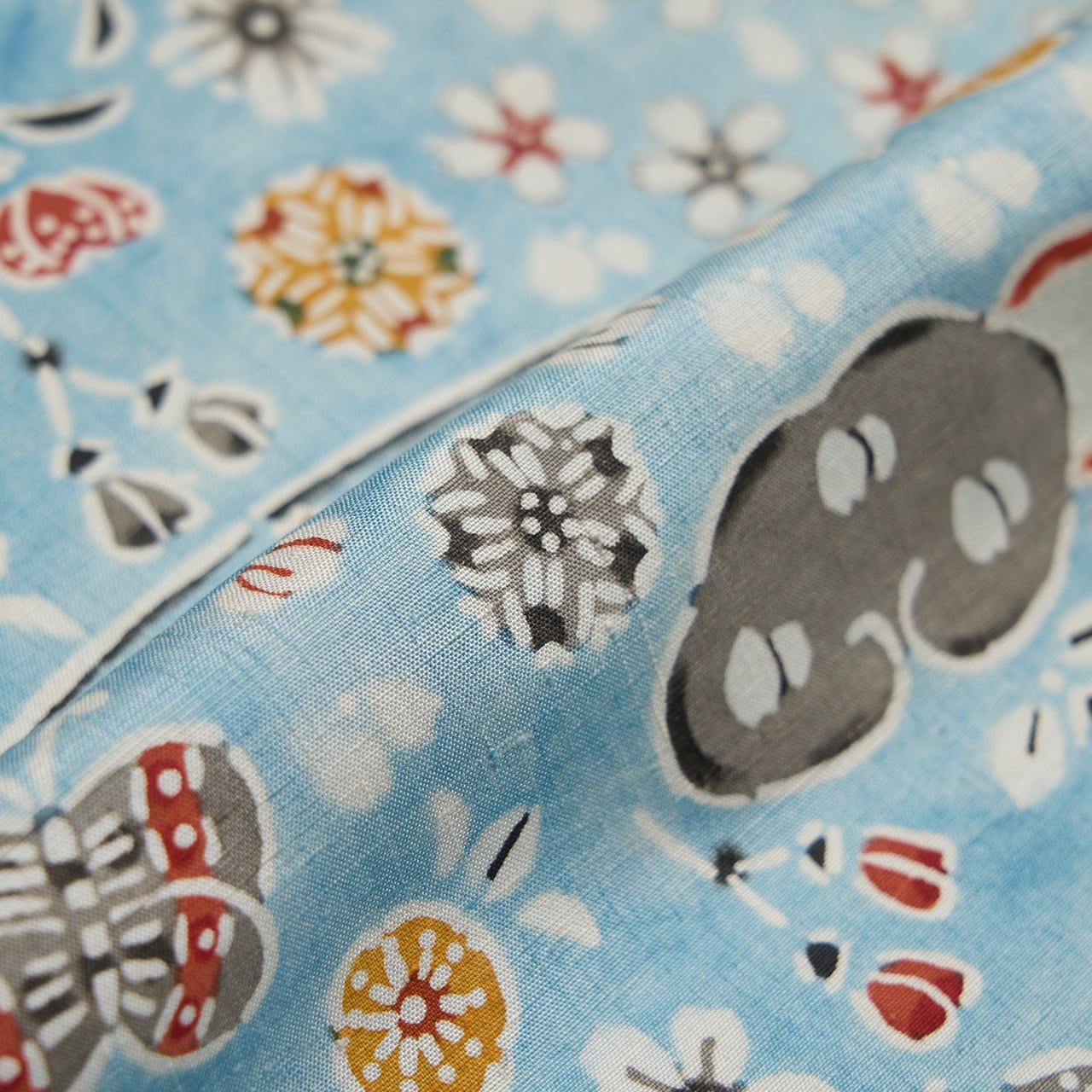 型絵染の総柄ではありますが、模様のひとつずつが小ぶりで、色使いも優しいものとなっていますので、比較的取り入れていただきやすいと思います。