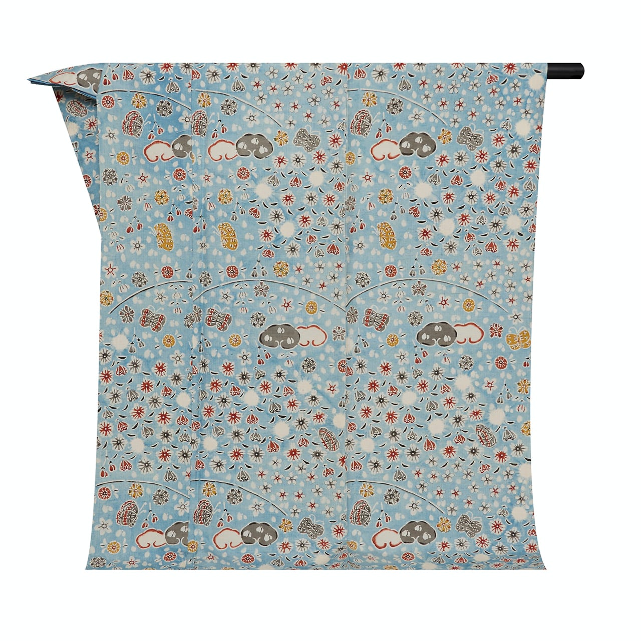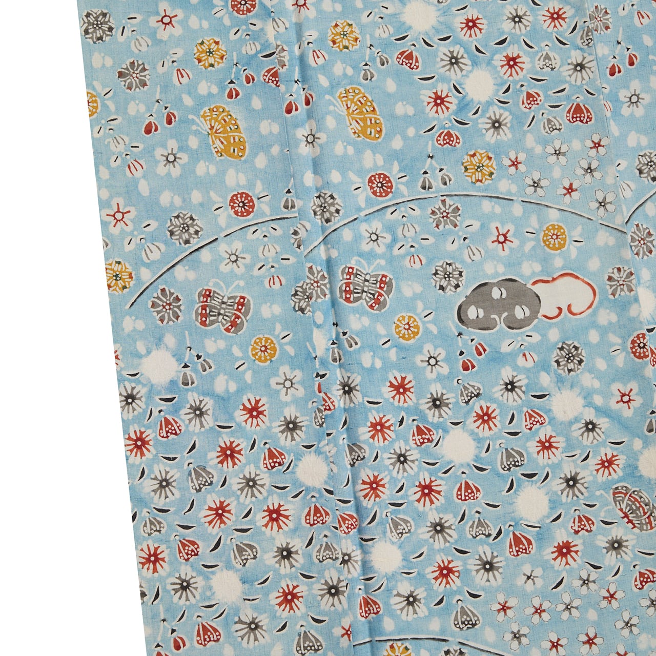 横に少しだけ節の見られる座繰りのさらっとした上質な紬地が明るい水色・浅縹色に染められ、遠山のような稜線が引かれ、雲のような岩のようなかたまりが置かれ、いろいろな種類のお花が咲き乱れる中を可愛らしい蝶々が舞う、ほのぼのとする風景が型絵染で染められた、国画会会員・岡本紘子さんの大作ともいえる素晴らしい作品です。