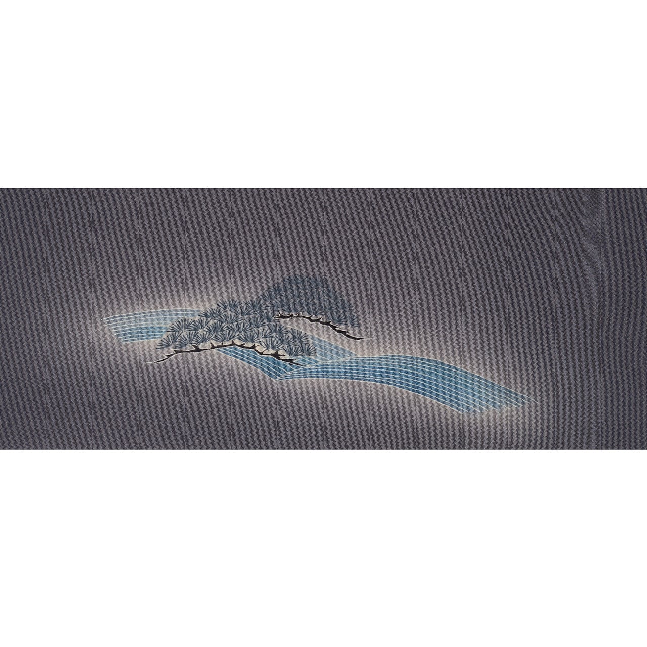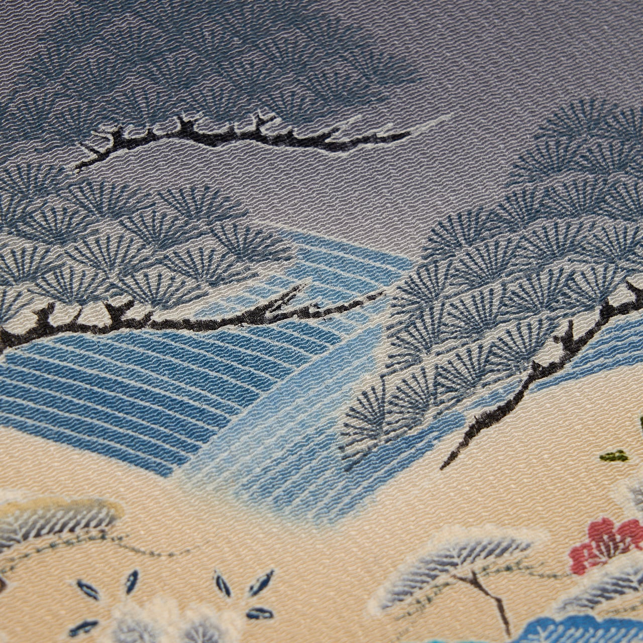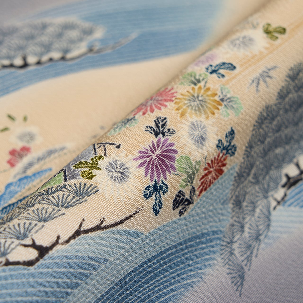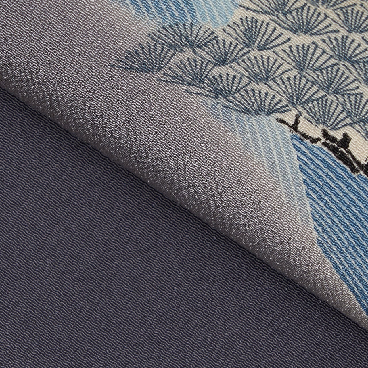 少しだけシボのあるちりめん地がグレー味のある紫・紫鼠色に染められ、お太鼓には紺鼠色で描かれた豊かな水が流れ、香色の砂浜のような地面が広がり、そこに佇む茅葺の家と菊のお花の周りに松林が茂っている情景が、繊細な手描友禅で描かれた、上野真さんの気品あふれる素敵な九寸名古屋帯の作品です。