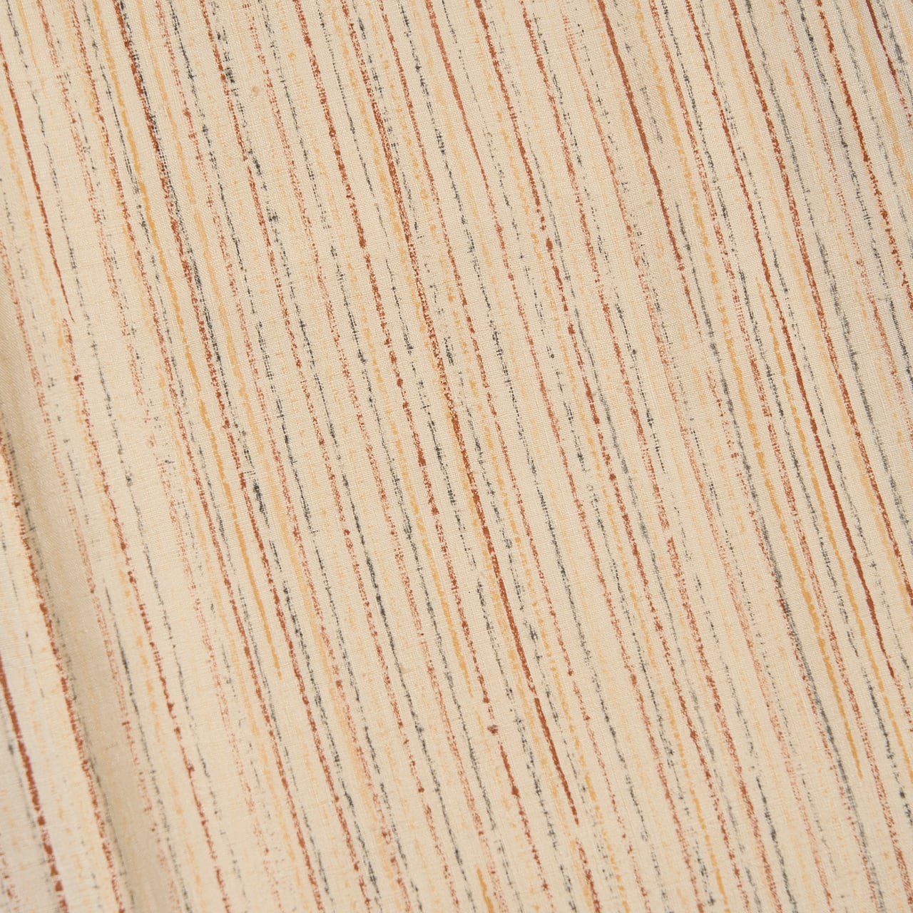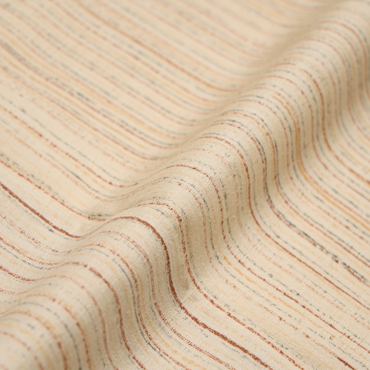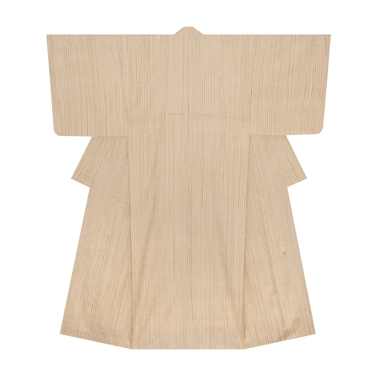 ふっくらとしながらもさらっとした質感の柔らかい象牙色の紬地に、縦に柿渋色の明るい茶、藍墨茶色の青味のあるグレー、蜂蜜色の黄色などの染料で手描きの縞が描かれた、とてもお洒落な雰囲気の吉岡幸雄さんの染紬のお着物の作品です。