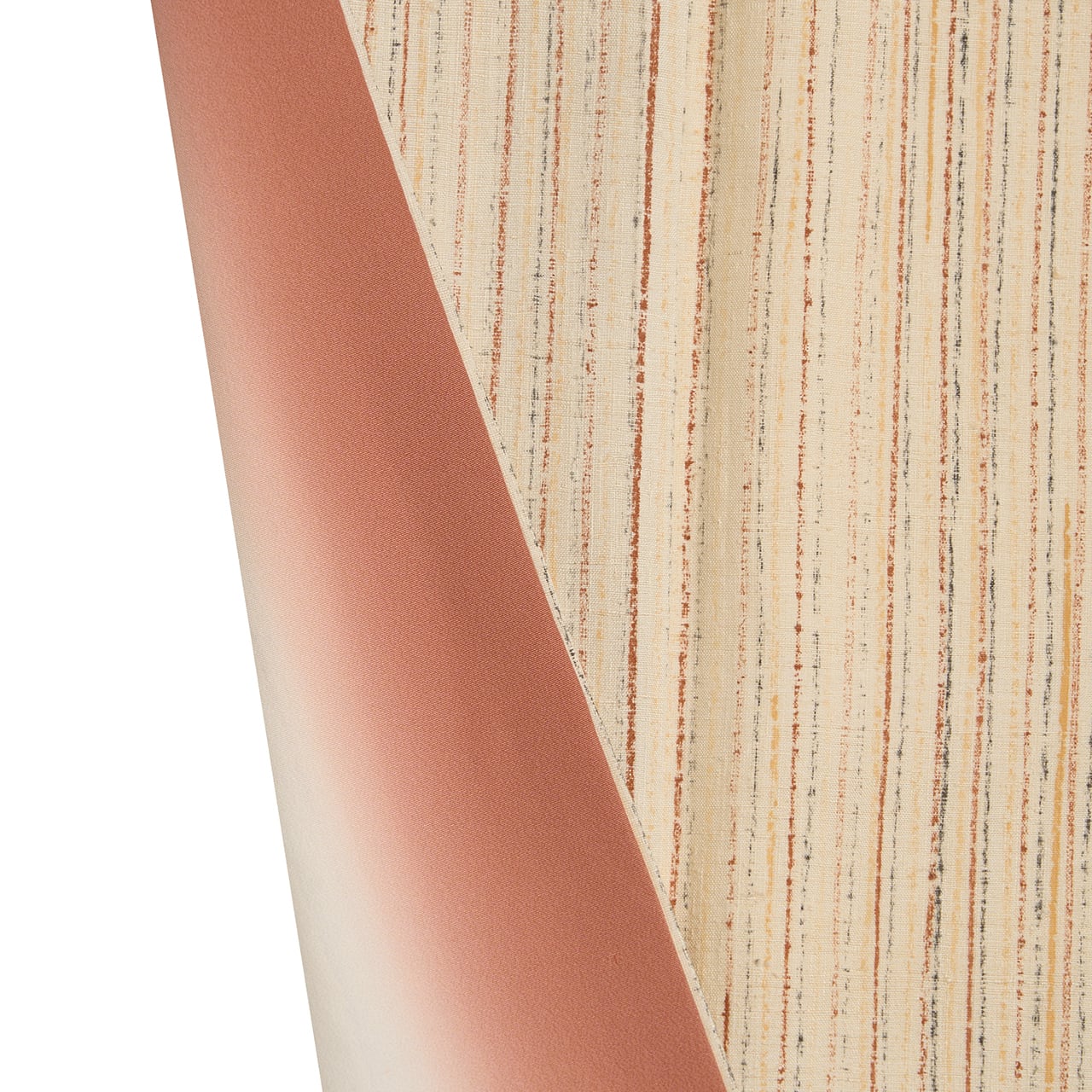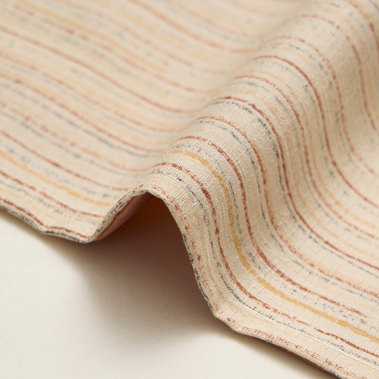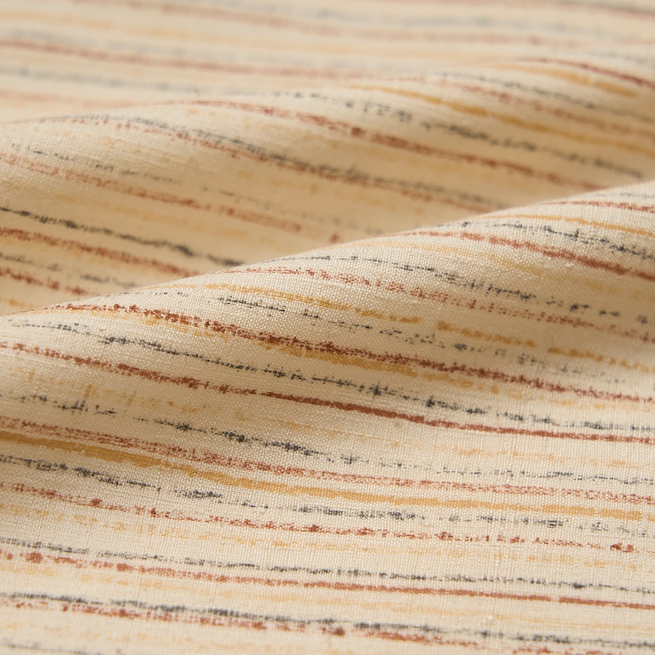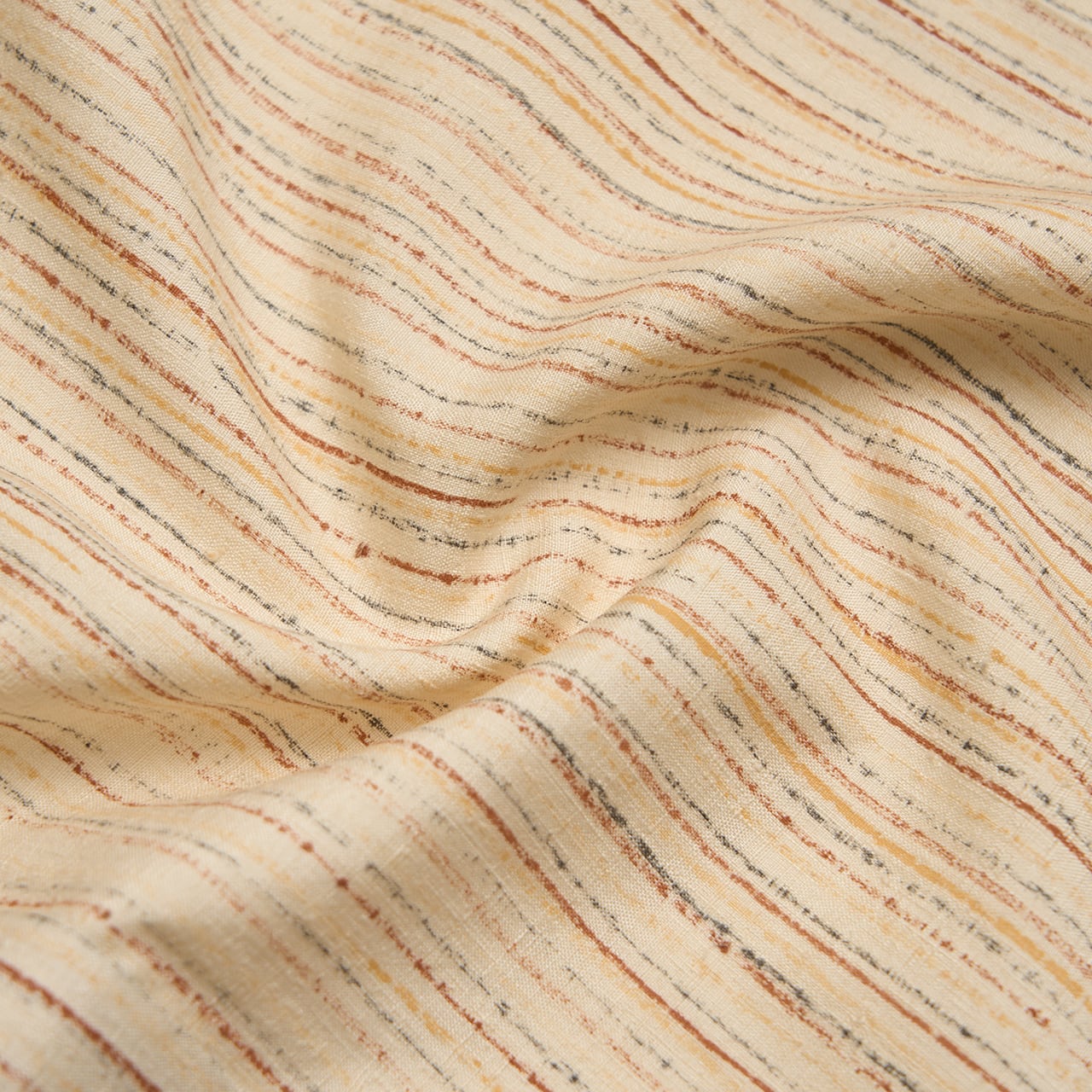 ふっくらとしながらもさらっとした質感の柔らかい象牙色の紬地に、縦に柿渋色の明るい茶、藍墨茶色の青味のあるグレー、蜂蜜色の黄色などの染料で手描きの縞が描かれた、とてもお洒落な雰囲気の吉岡幸雄さんの染紬のお着物の作品です。