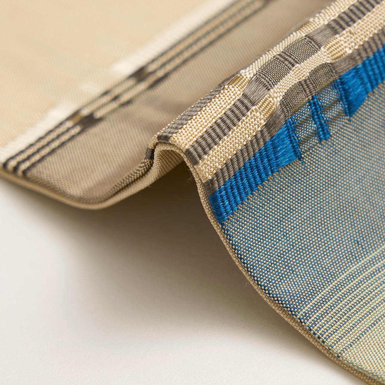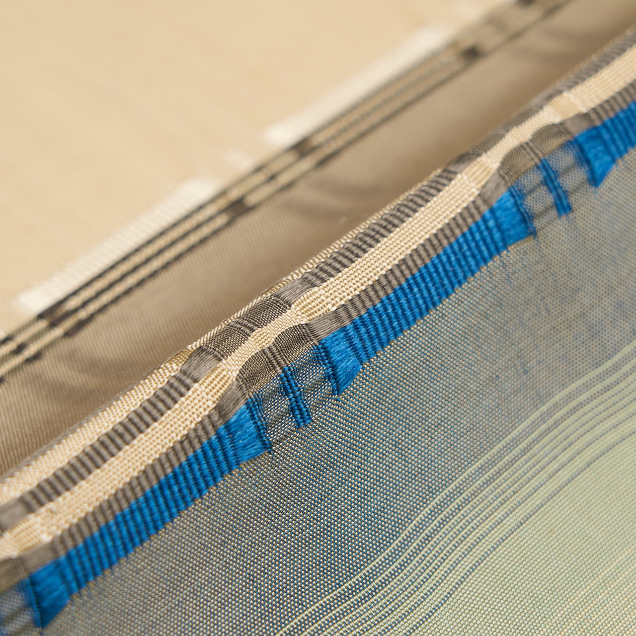 温かみのある淡いベージュ・練色のシャリっとした地に、淡いグレー・江戸鼠色や水浅葱色の段が綺麗なグラデーションを表し、そこに濃い青・瑠璃紺色や黒橡色の焦げ茶、白緑色の明るい青磁色などの吉野織が織り込まれて素敵なアクセントとなった、とても爽やかな印象の九寸名古屋帯です。
